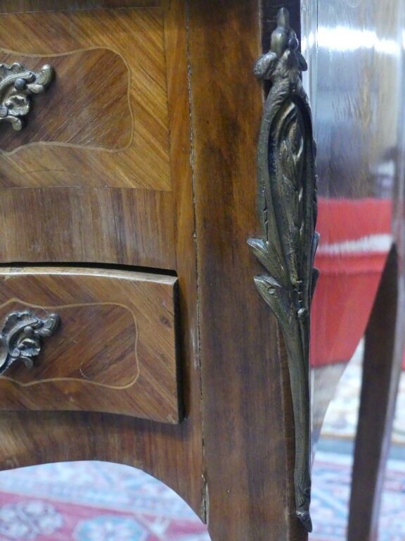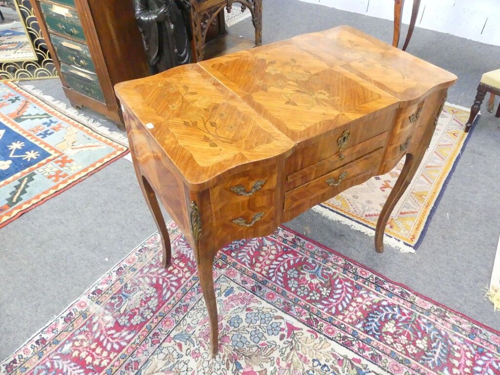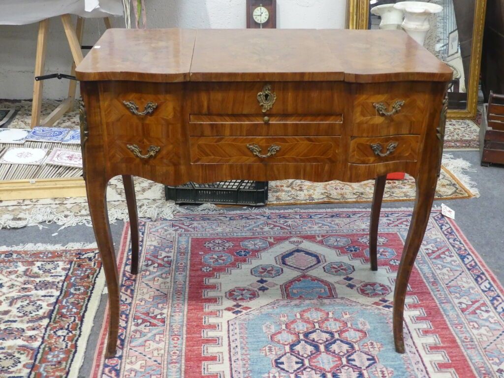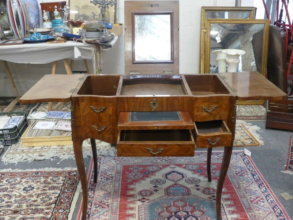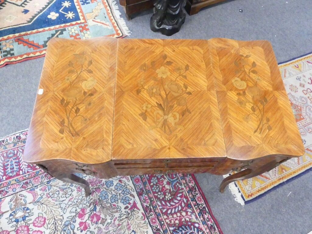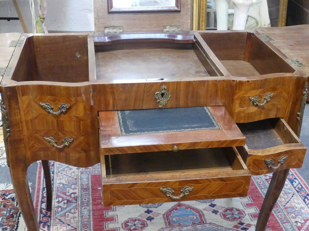 Rosewood veneered dressing table opening with 3 flaps and 2 drawers, inlaid with flowers, curved legs. Louis XV style.