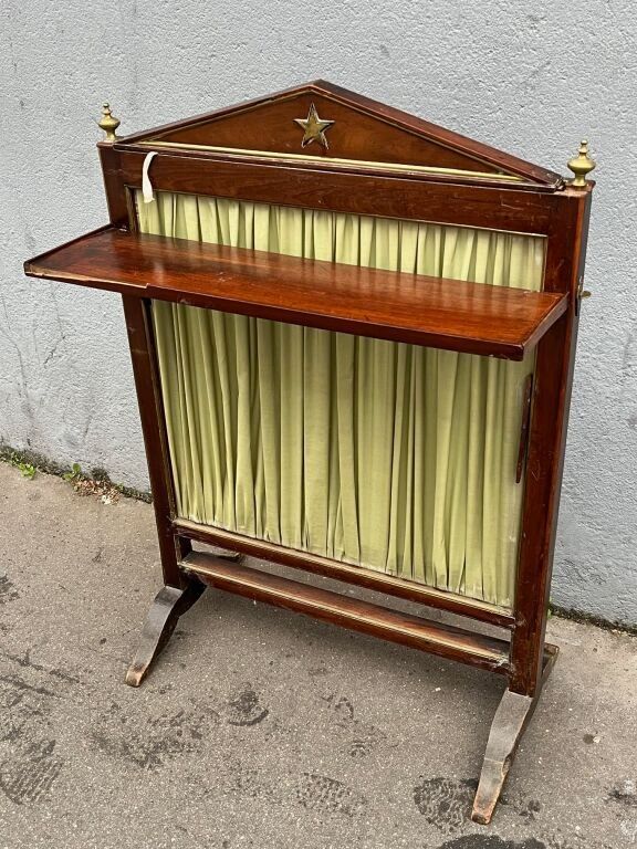 Fireplace screen with mahogany shelf with triangular pediment and brass top.