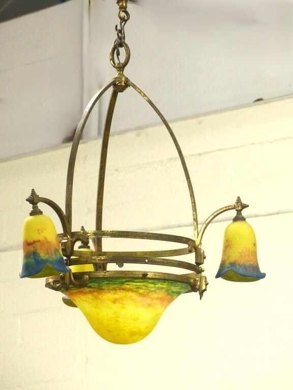 A gilt bronze and pâte de verre chandelier in shades of yellow, blue and orange, with one bowl and three tulips.