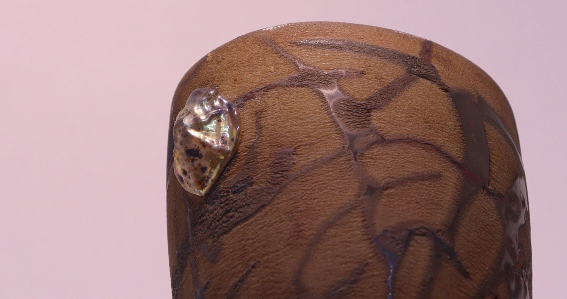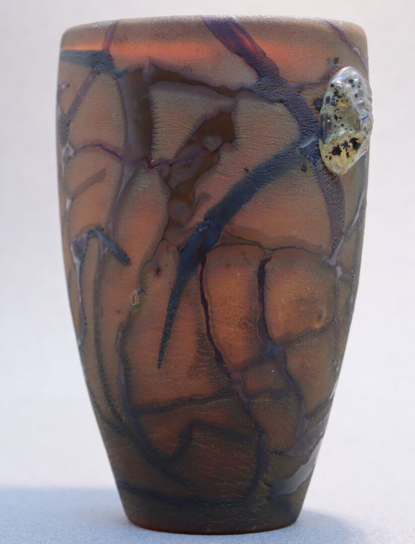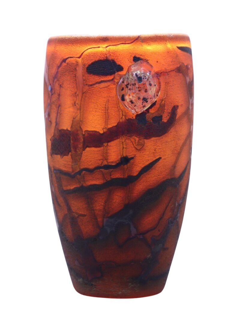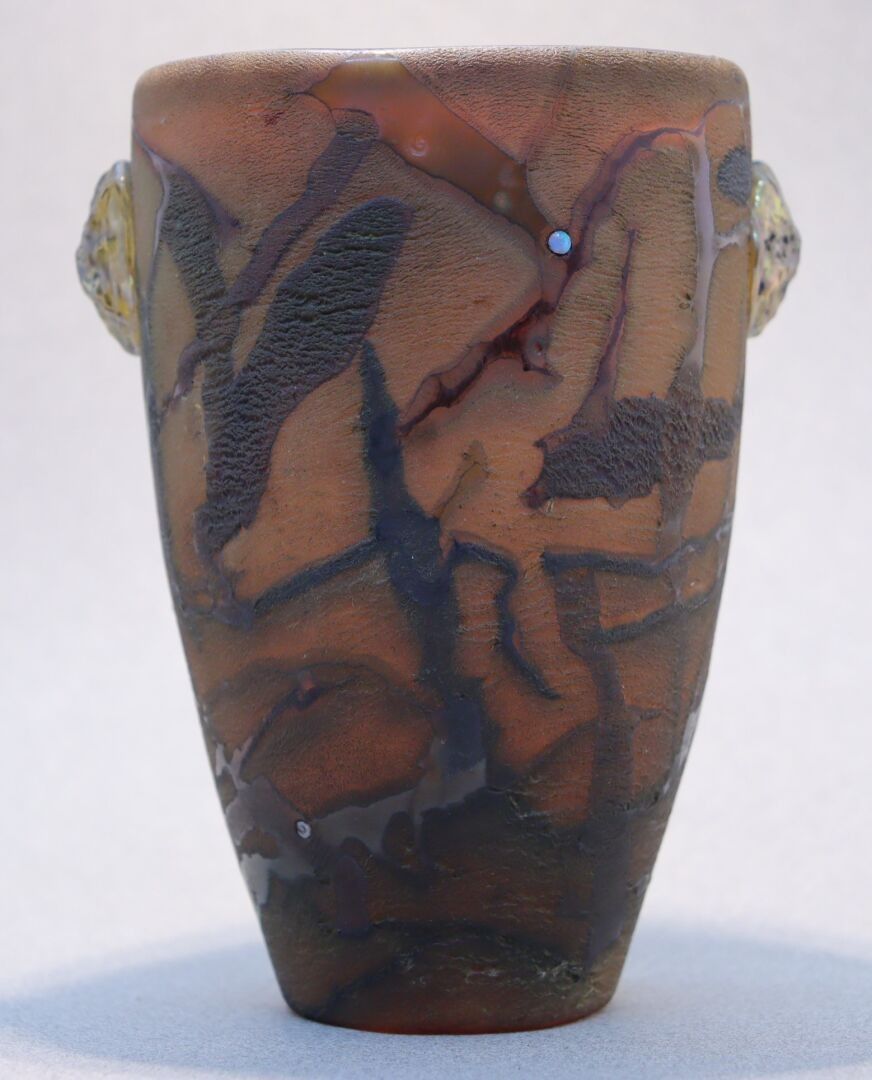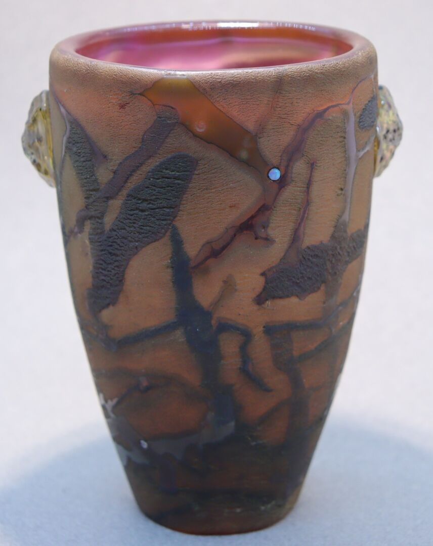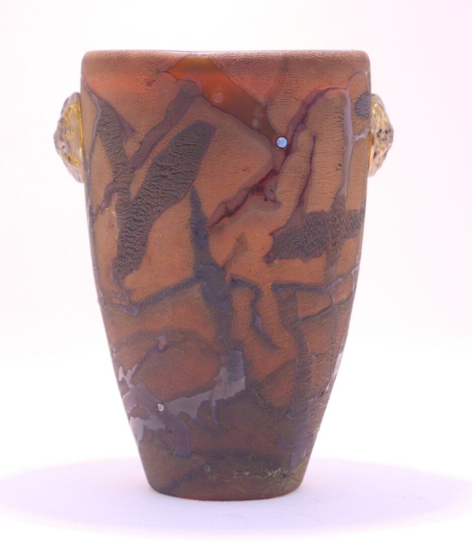 Conical vase with open neck and oval body. Pink glass lined with brown granite and marbled with green, red and yellow-orange. Decorated with two iridescent glass side cabochons with limpet bodies and inlaid with an opal cabochon and a small twisted white shell.
