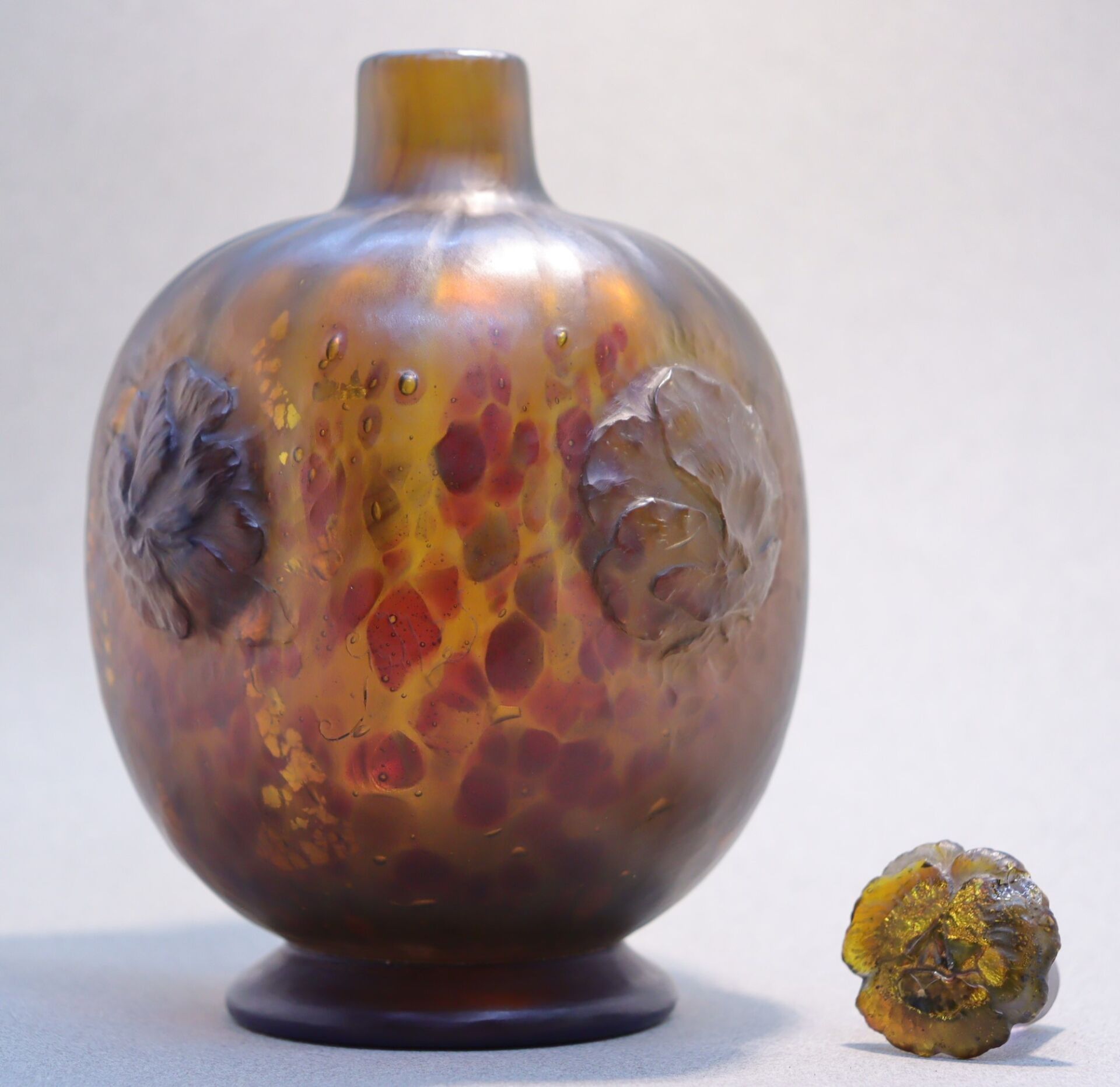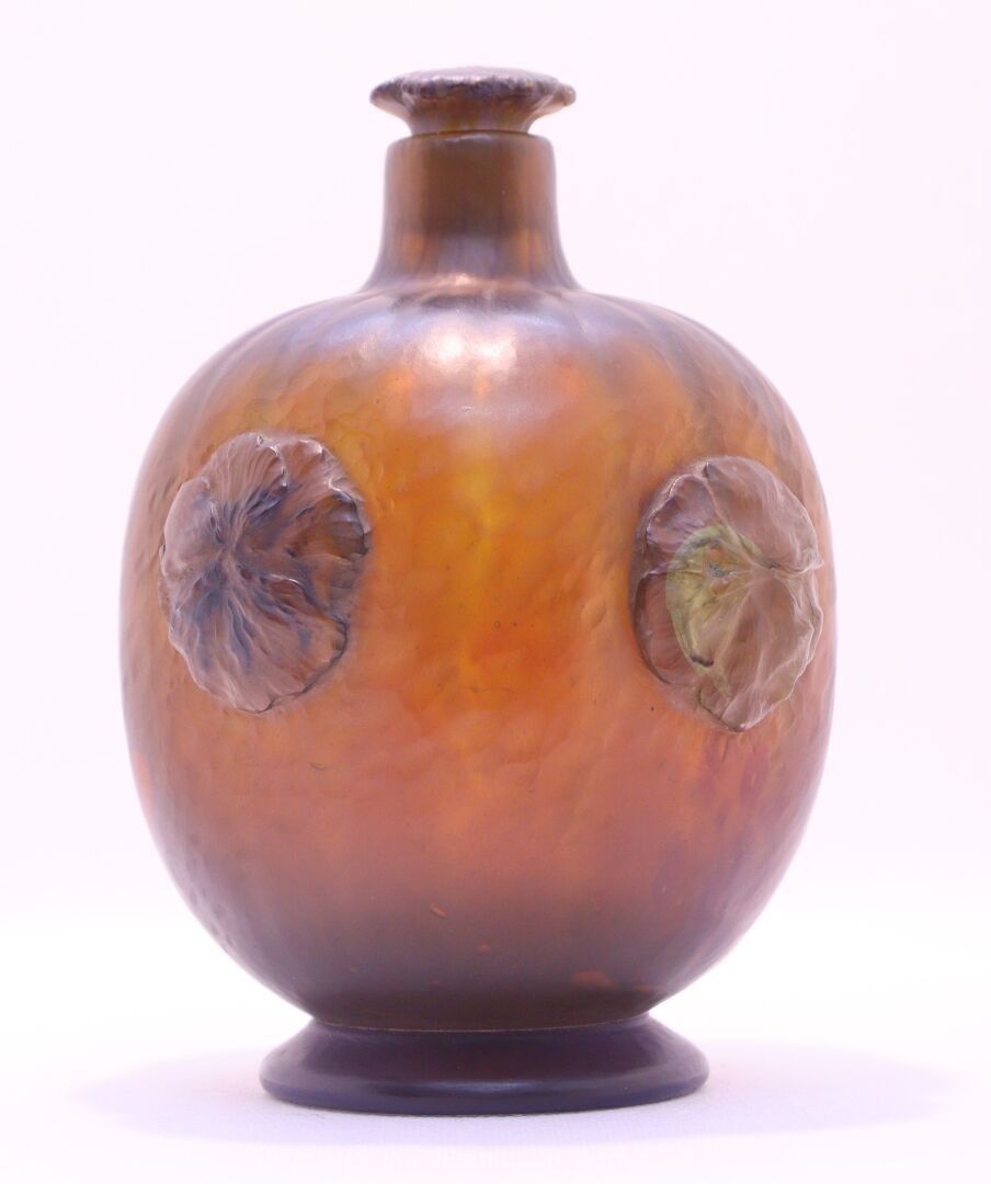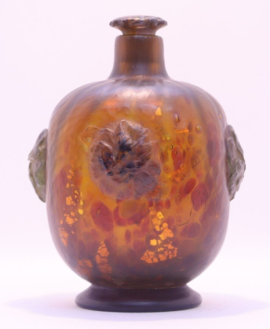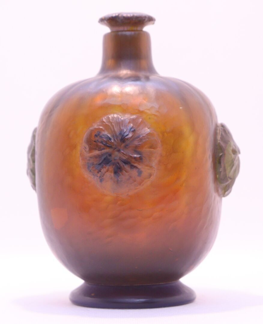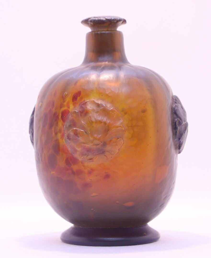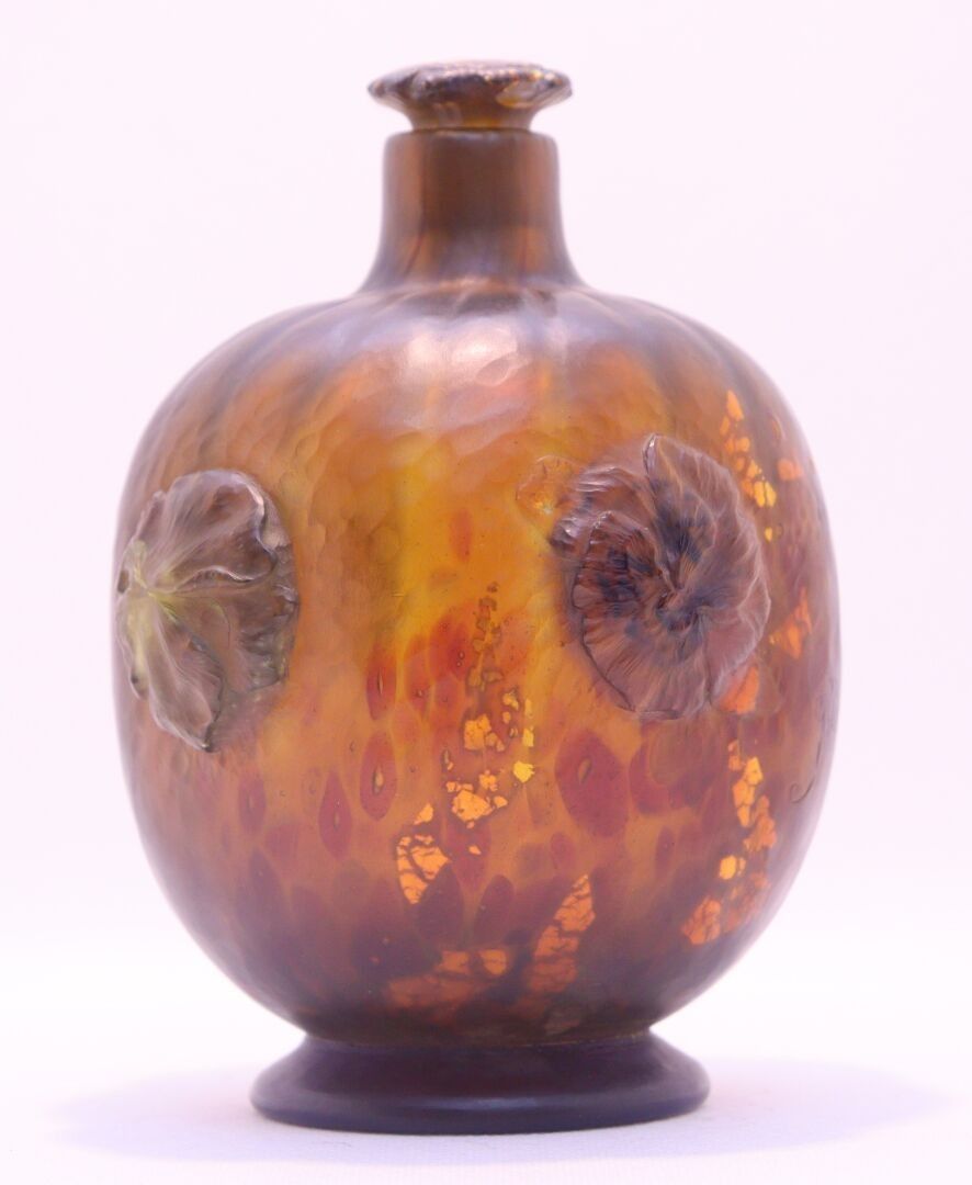 Bottle and original stopper with a slightly squared ovoid body and small tubular neck on a recessed pedestal. Proof in grooved amber glass with orange and brown and orange flecks and inclusions of gilded metal oxide leaves for the body of the vase, violet glass pedestal and stopper in violet glass with brown flecks and inclusions of gilded metal oxides. Decorated with four wheel-ground flowers on a partially hammered background with small facets and a grooved neck on the body of the vase and a wheel-ground flower on the stopper (small chip on the stopper and on the reverse of the stopper).