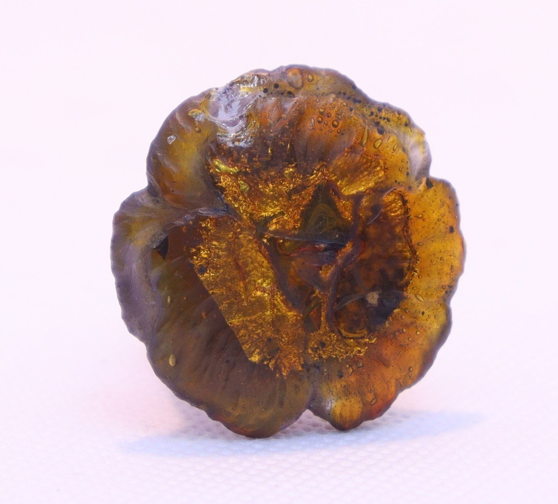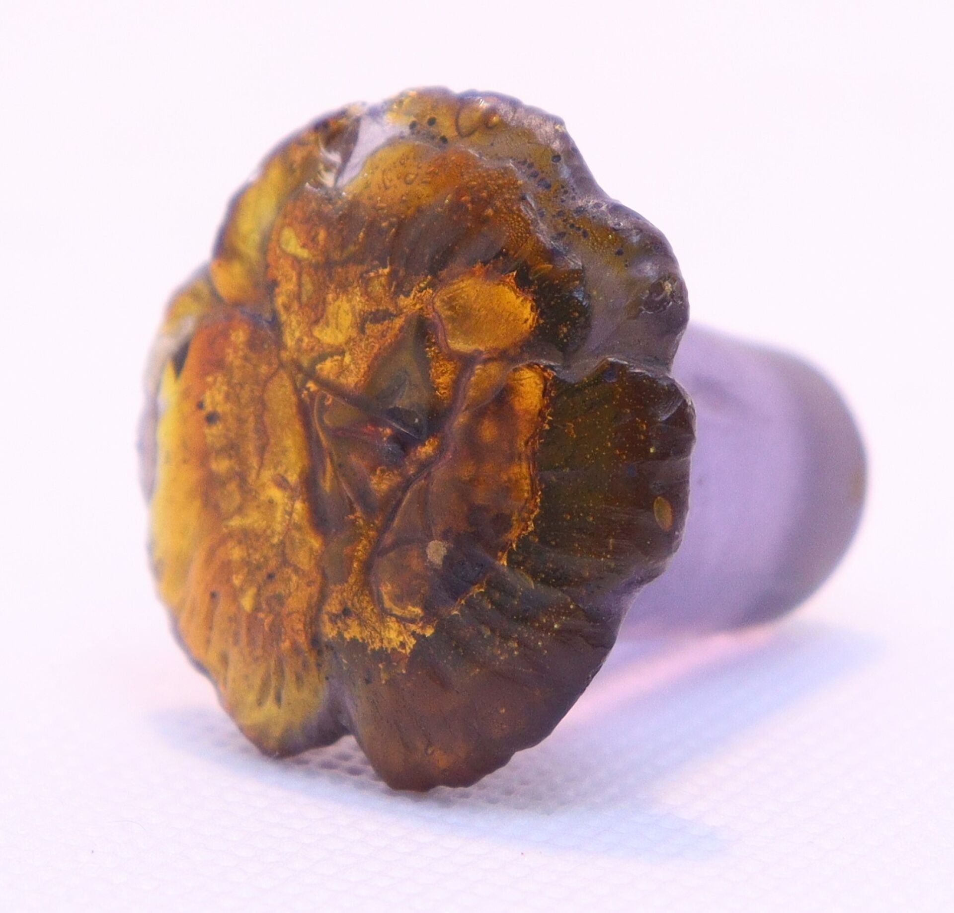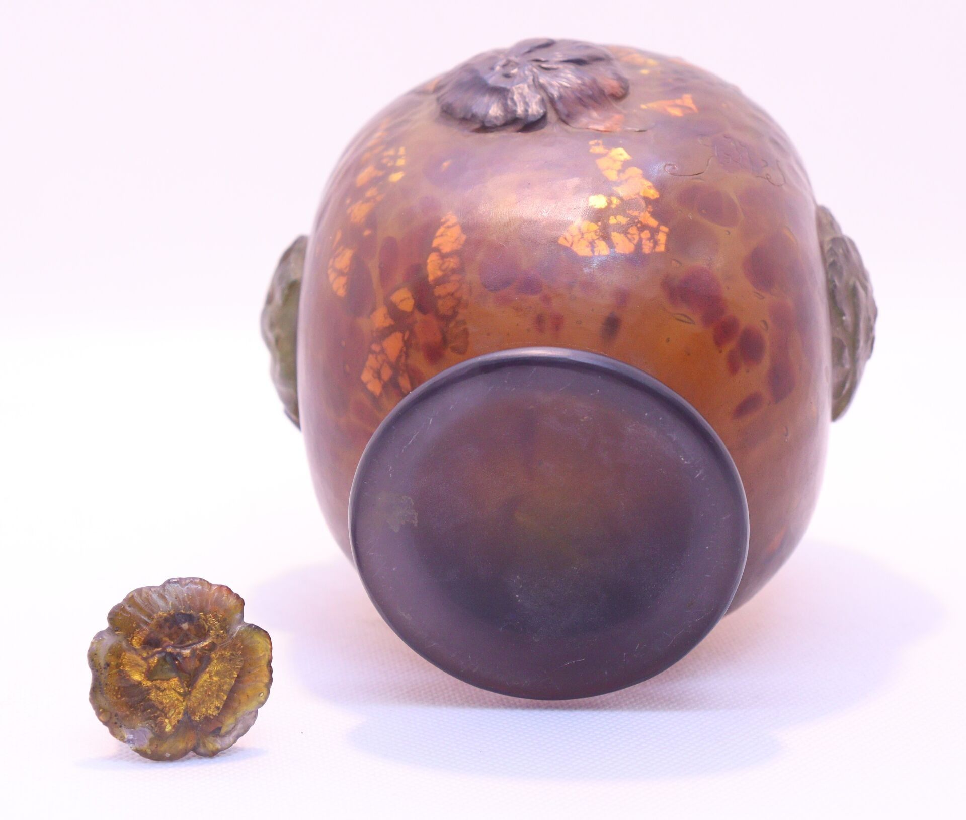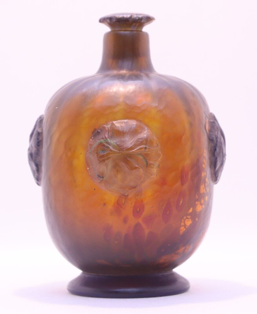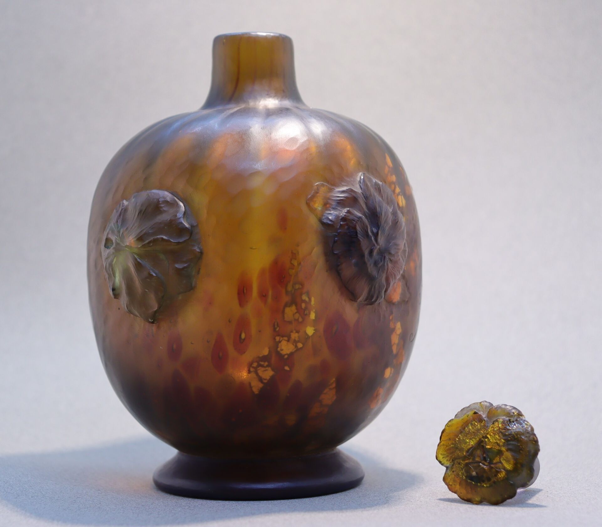 Bottle and original stopper with a slightly squared ovoid body and small tubular neck on a recessed pedestal. Proof in grooved amber glass with orange and brown and orange flecks and inclusions of gilded metal oxide leaves for the body of the vase, violet glass pedestal and stopper in violet glass with brown flecks and inclusions of gilded metal oxides. Decorated with four wheel-ground flowers on a partially hammered background with small facets and a grooved neck on the body of the vase and a wheel-ground flower on the stopper (small chip on the stopper and on the reverse of the stopper).