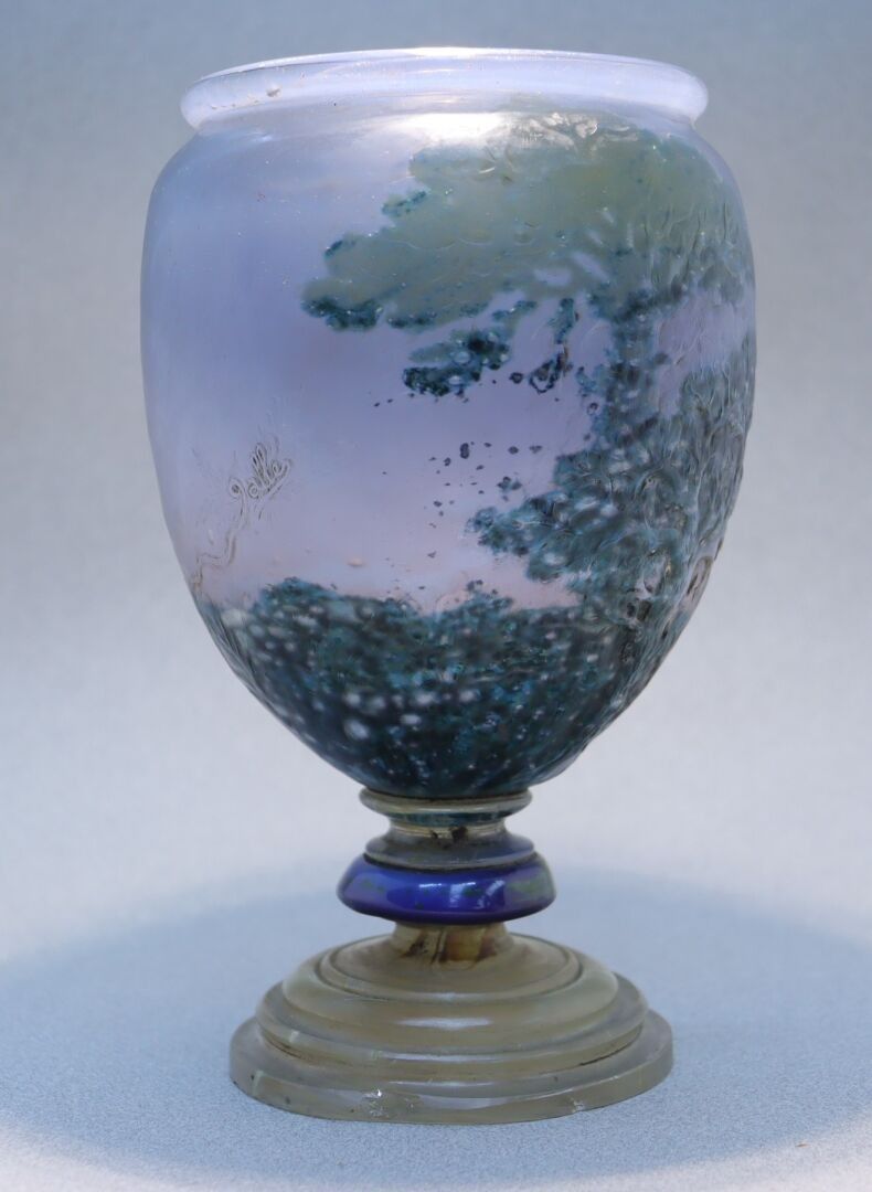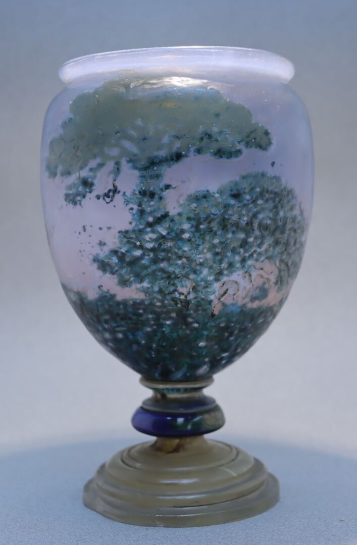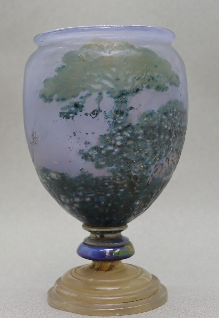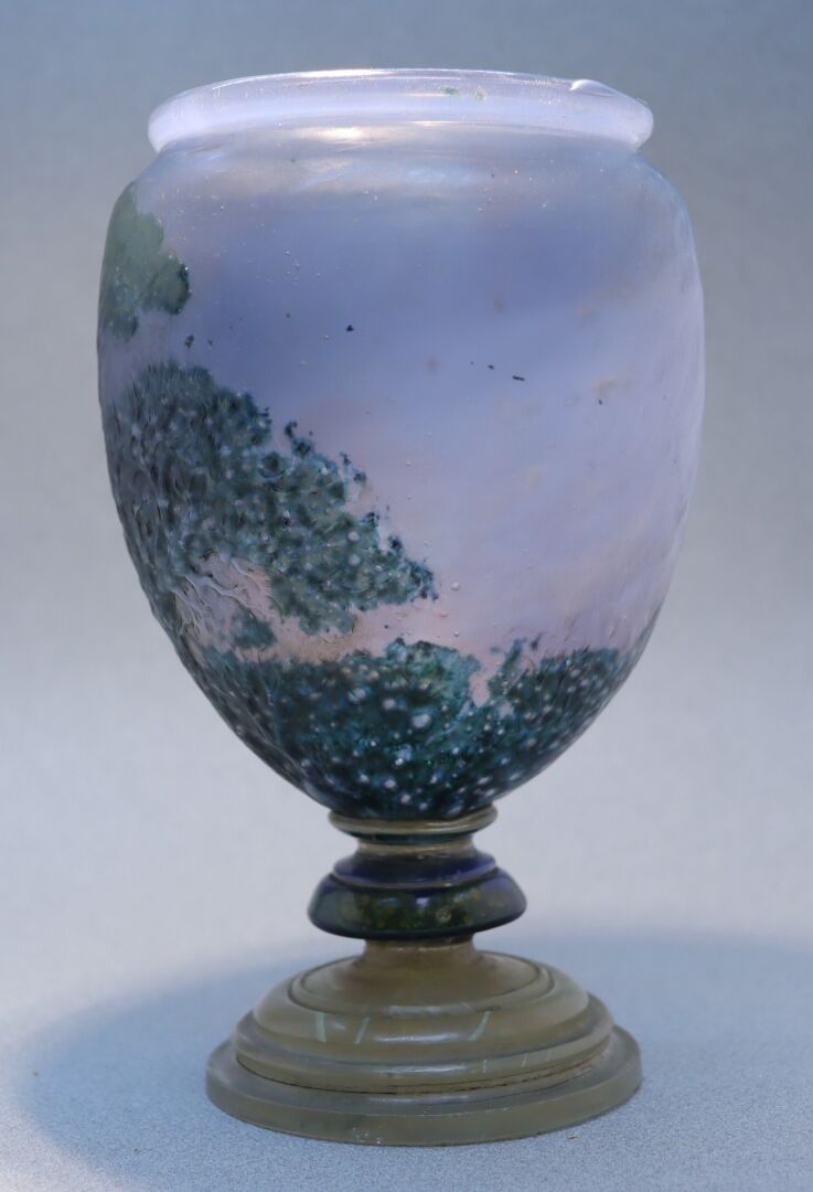 An ovoid vase with shoulders and a hemmed neck on a multi-stepped pedestal. Proof in pinkish blue glass with yellow ochre, green and blue bubbled decoration. A wheel-engraved design of leafy trees on a partially hammered background with small facets. Hot-glued pedestal in yellow grooved white glass and ring in green and yellow blue glass (foot ground, two chips to pedestal, small bubbles to neck).