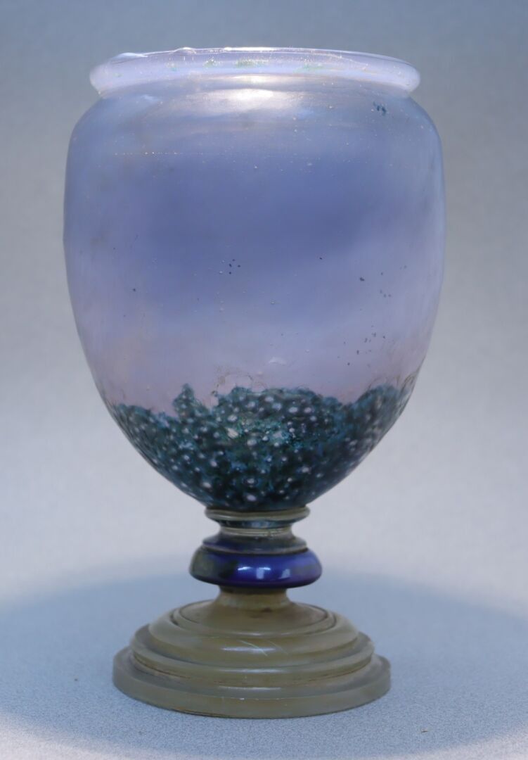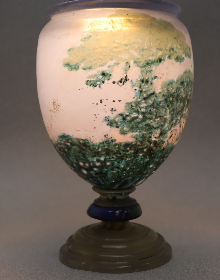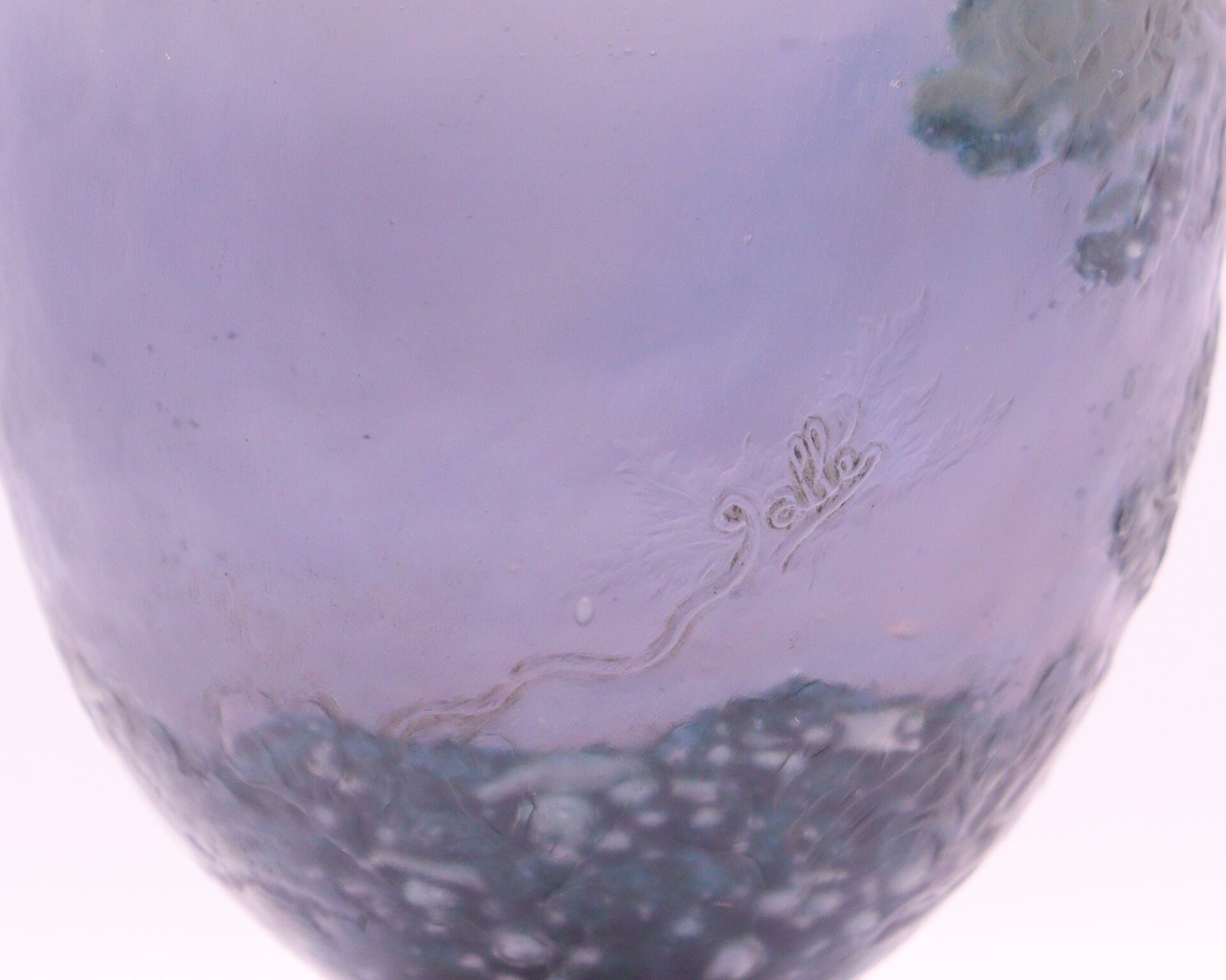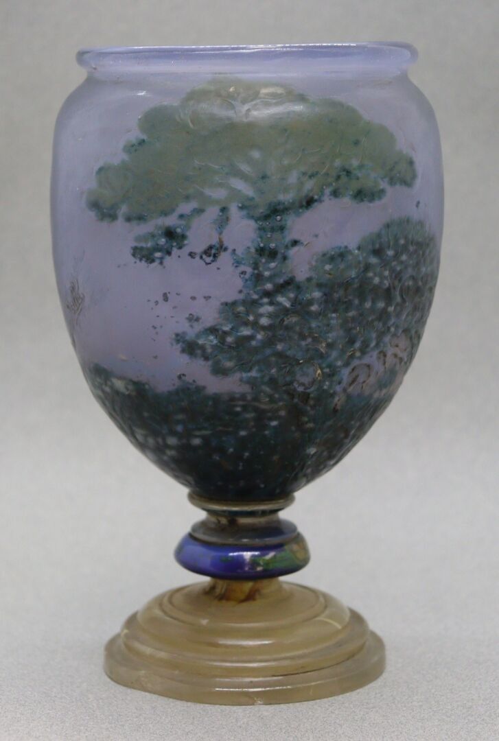 An ovoid vase with shoulders and a hemmed neck on a multi-stepped pedestal. Proof in pinkish blue glass with yellow ochre, green and blue bubbled decoration. A wheel-engraved design of leafy trees on a partially hammered background with small facets. Hot-glued pedestal in yellow grooved white glass and ring in green and yellow blue glass (foot ground, two chips to pedestal, small bubbles to neck).