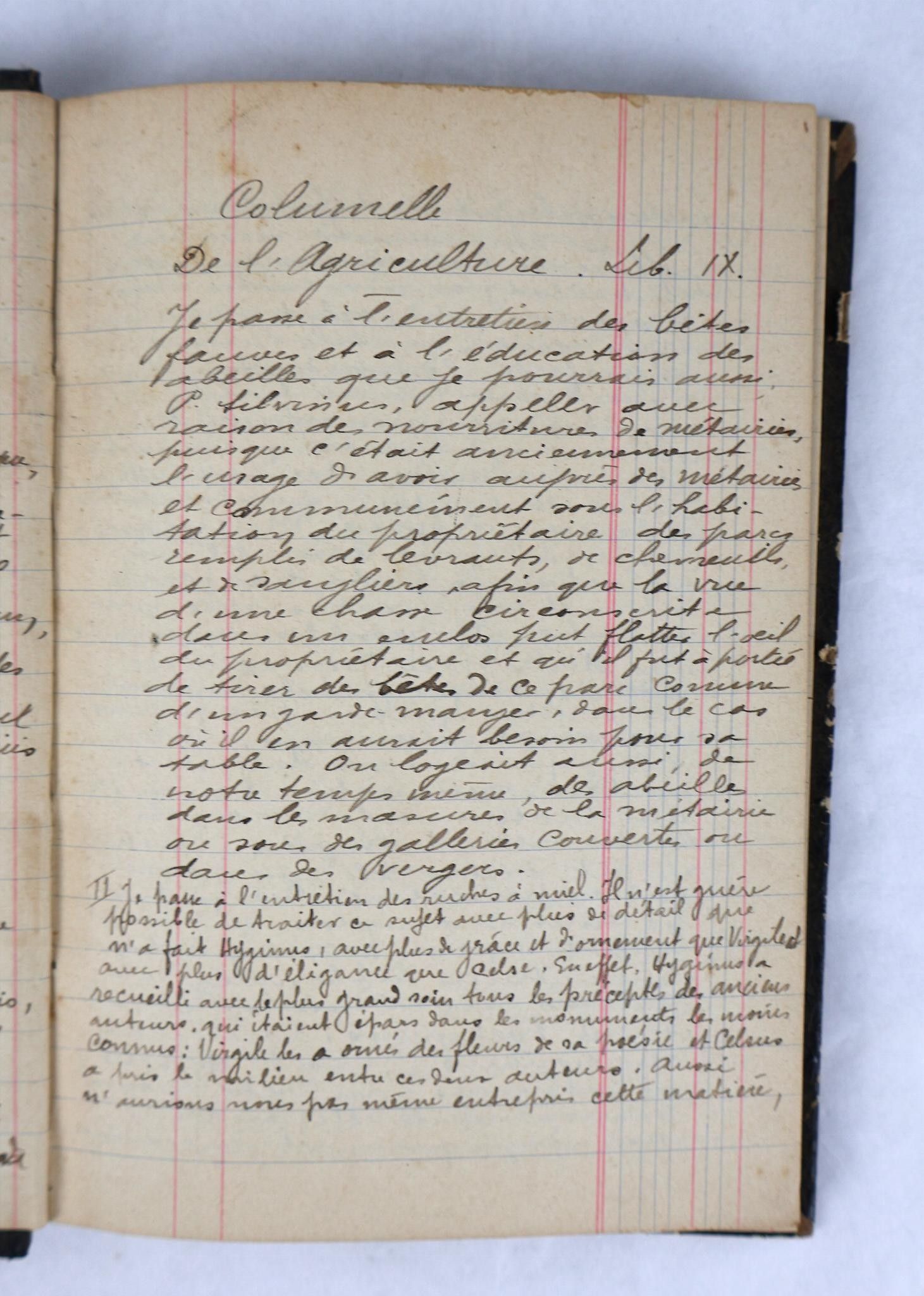 COLUMELLE. De re rustica. Liber IX. Manuscript in French with the Latin text opposite, circa 1900. 100 pp. small squares, in-8° black half-chagrin notebook, gilt cross on upper cover.