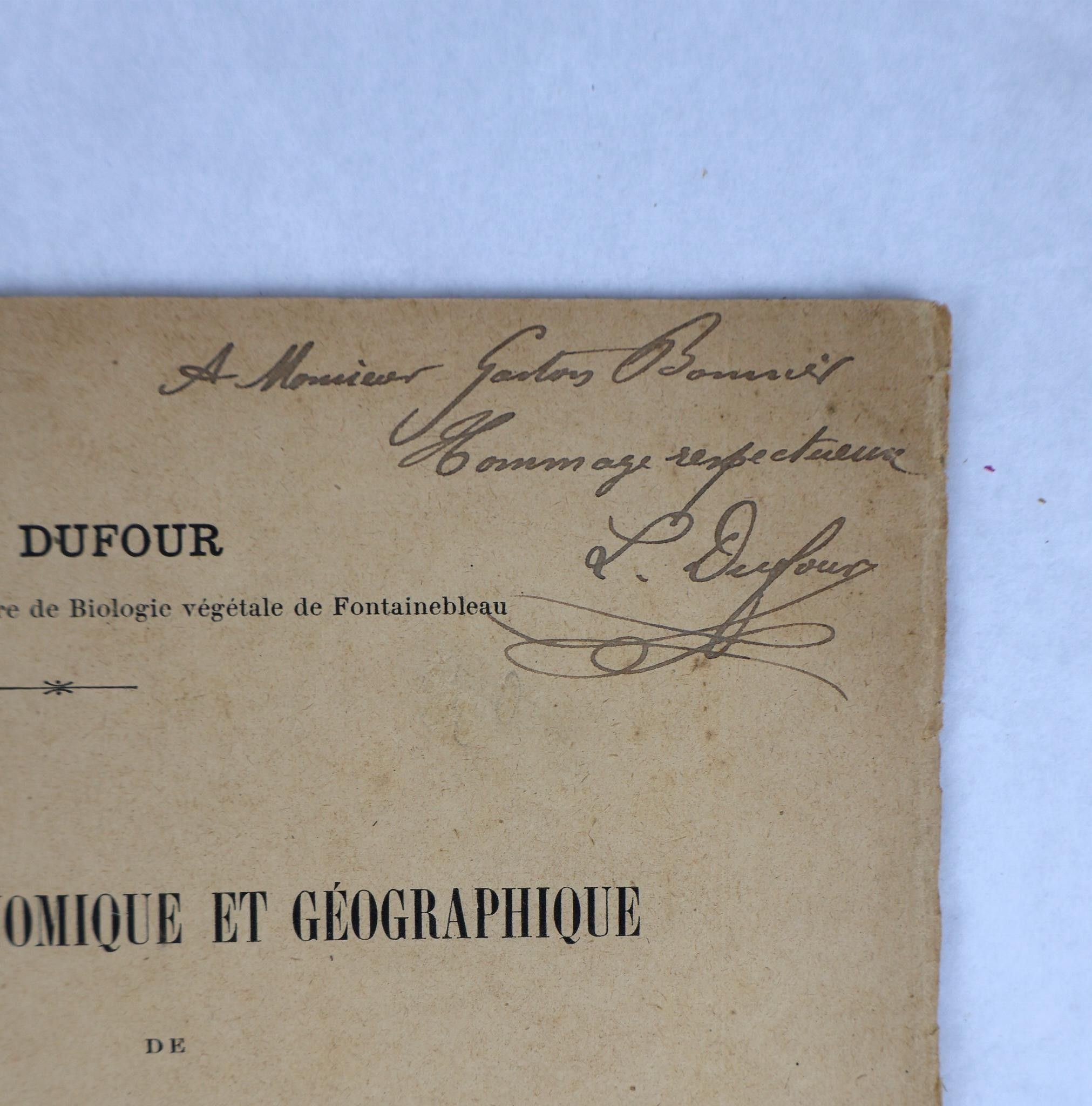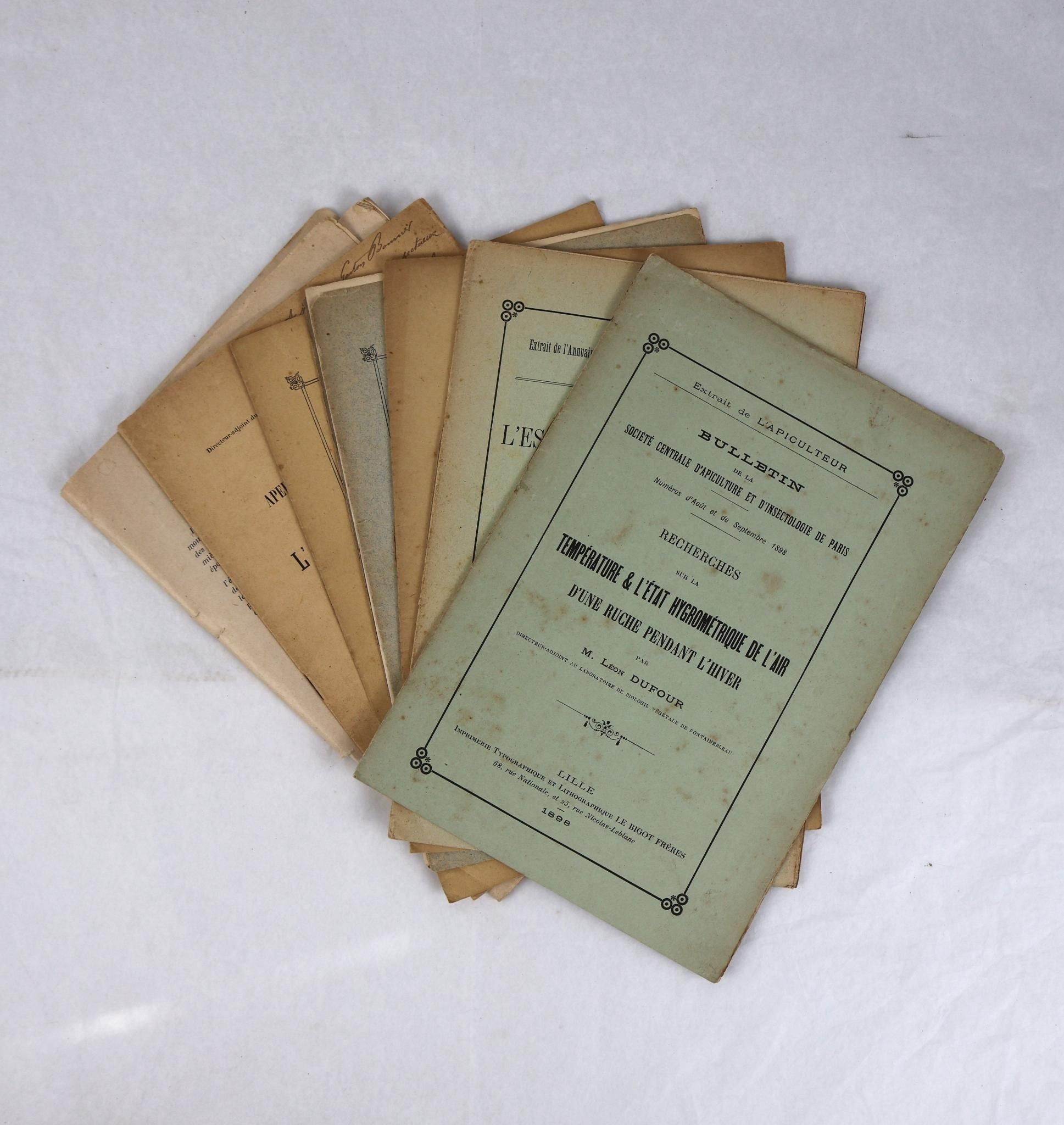 DUFOUR (Léon). 6 fascicules in-8°. ● Recherches sur la Température & l'Etat hygrométrique de l'air d'une ruche pendant l'hiver. Lille, Le Bigot Frères, 1898. 15 pp. ● L'Essaimage artificiel et l'Expérience des quatre Bascules. Id. 1900. 13 pp. ● Recherches sur la ponte de la Reine. Id. 1901. 17 pp. ● Beekeeping in the French colonies. Id. 1902. 18 pp. ● La Mévente des miels. Id. 1903. 8 pp. ● Economic and geographical overview of French beekeeping. Paris, Secrétariat de l'Association, [1903]. PP. 1148-1166. With dispatch from the author "To Monsieur Gaston Bonnier. Respectful homage. L. Dufour.