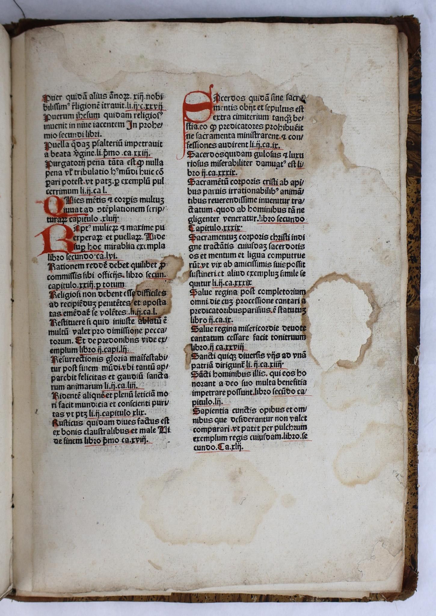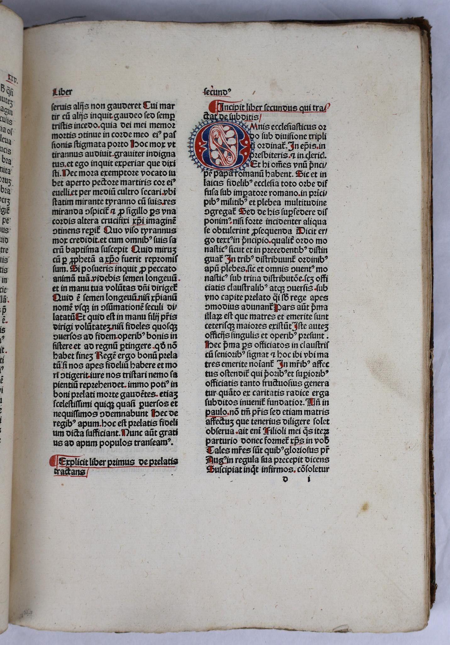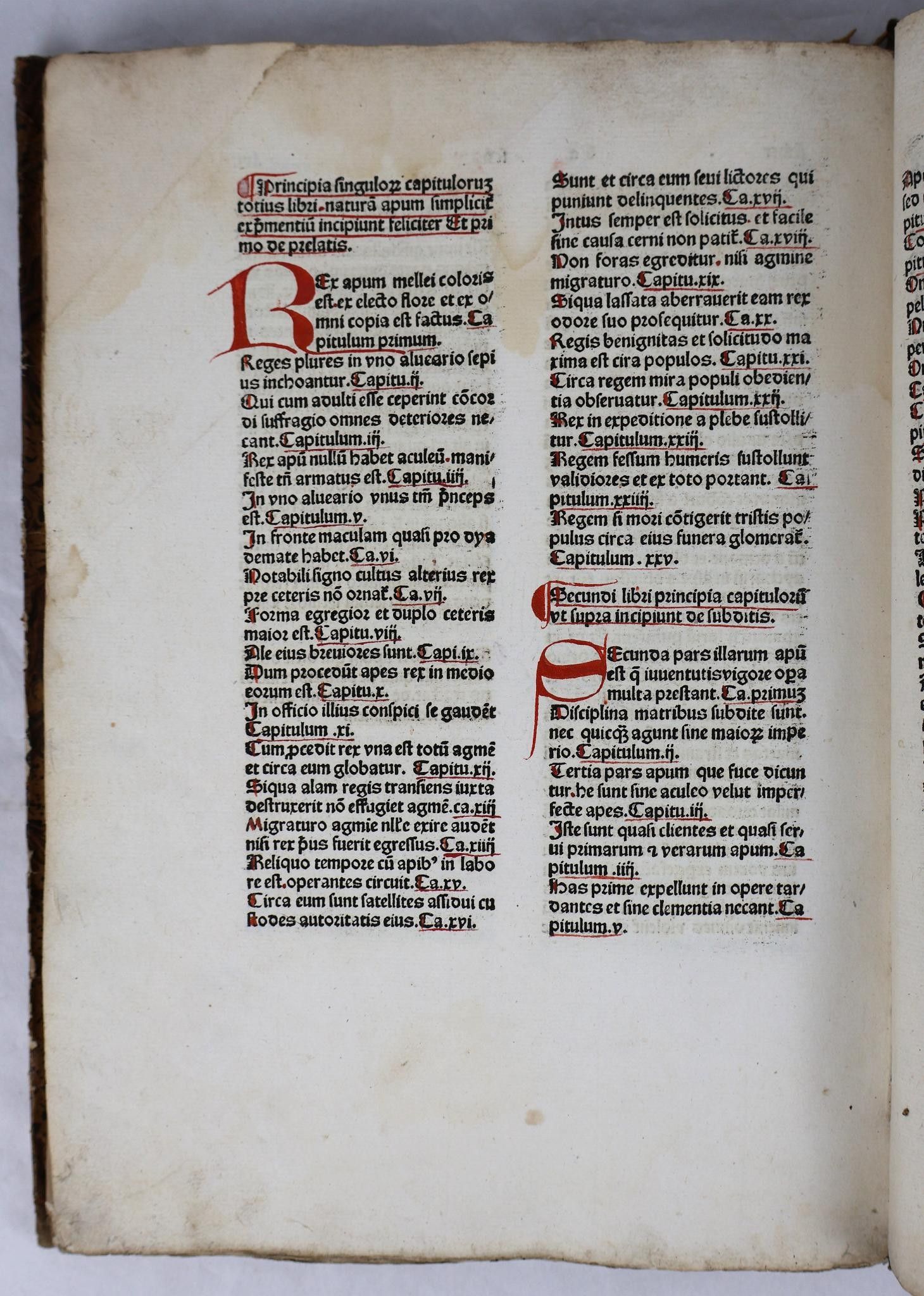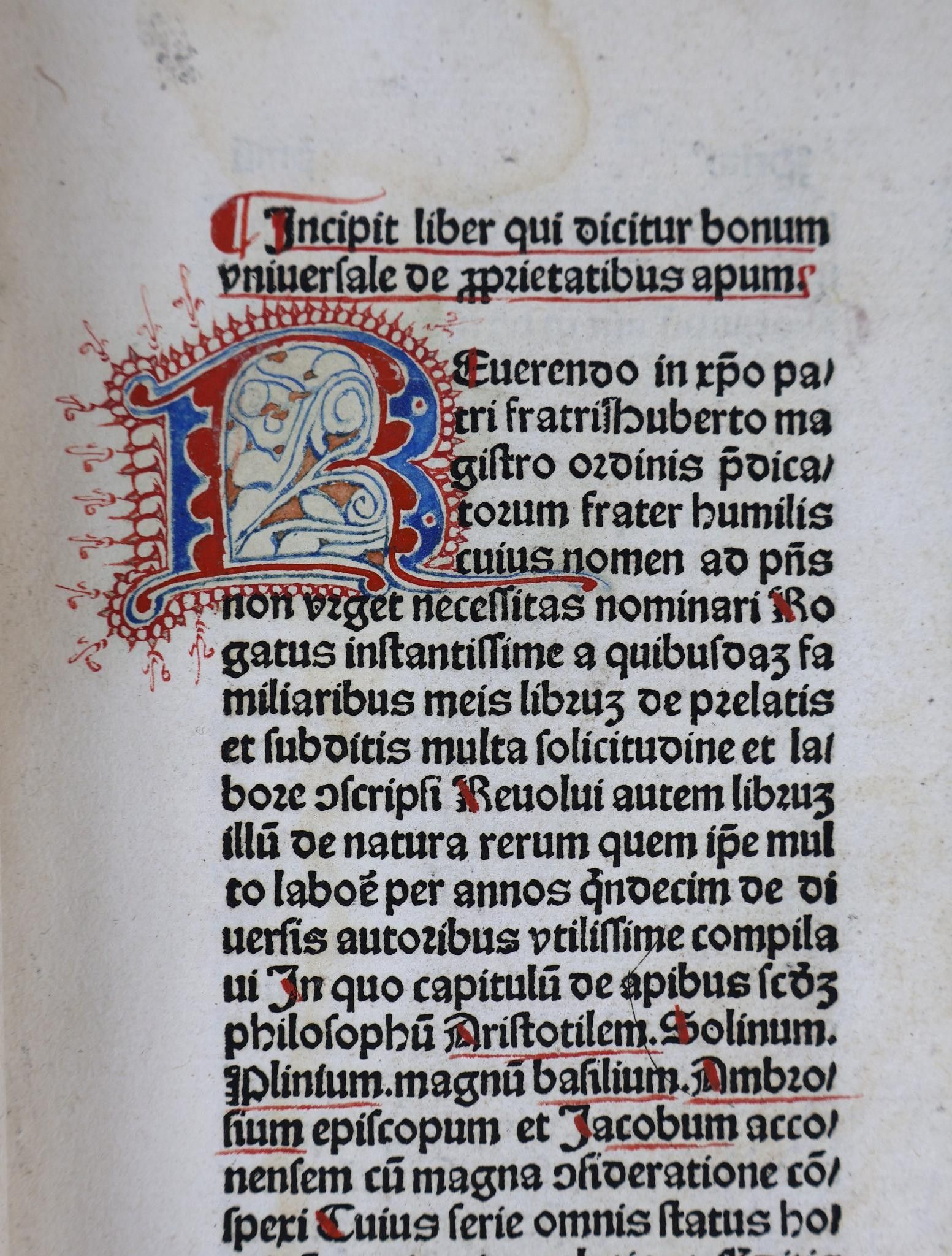 [Incunabulum]. THOMAS CANTIPRATENSIS [Thomas de Cantimpré]. Bonum universale de proprietatibus apum. [Cologne, Johann Koelhoff the Elder, c. 1478-80]. In-folio of 133 [of 134] ff (Signs: a-o8, p7, q8, r6). A rubricated copy, the initial of each of the two parts decorated in red and blue. Text on two columns of 39 lines. Half fawn basane, richly decorated smooth spine, fawn morocco t.p., boards covered with imitation shagreened basane paper (Binding circa 1830).