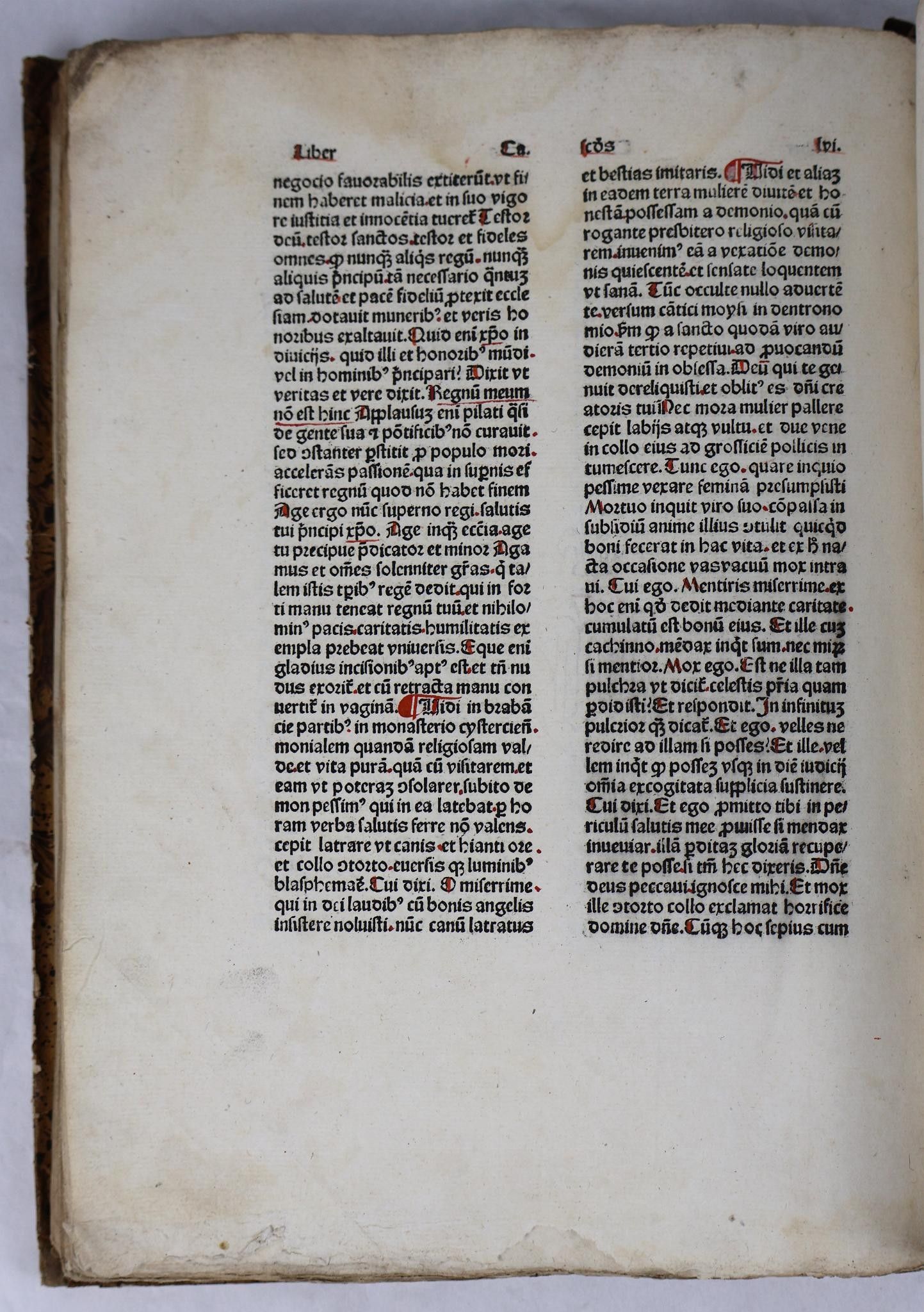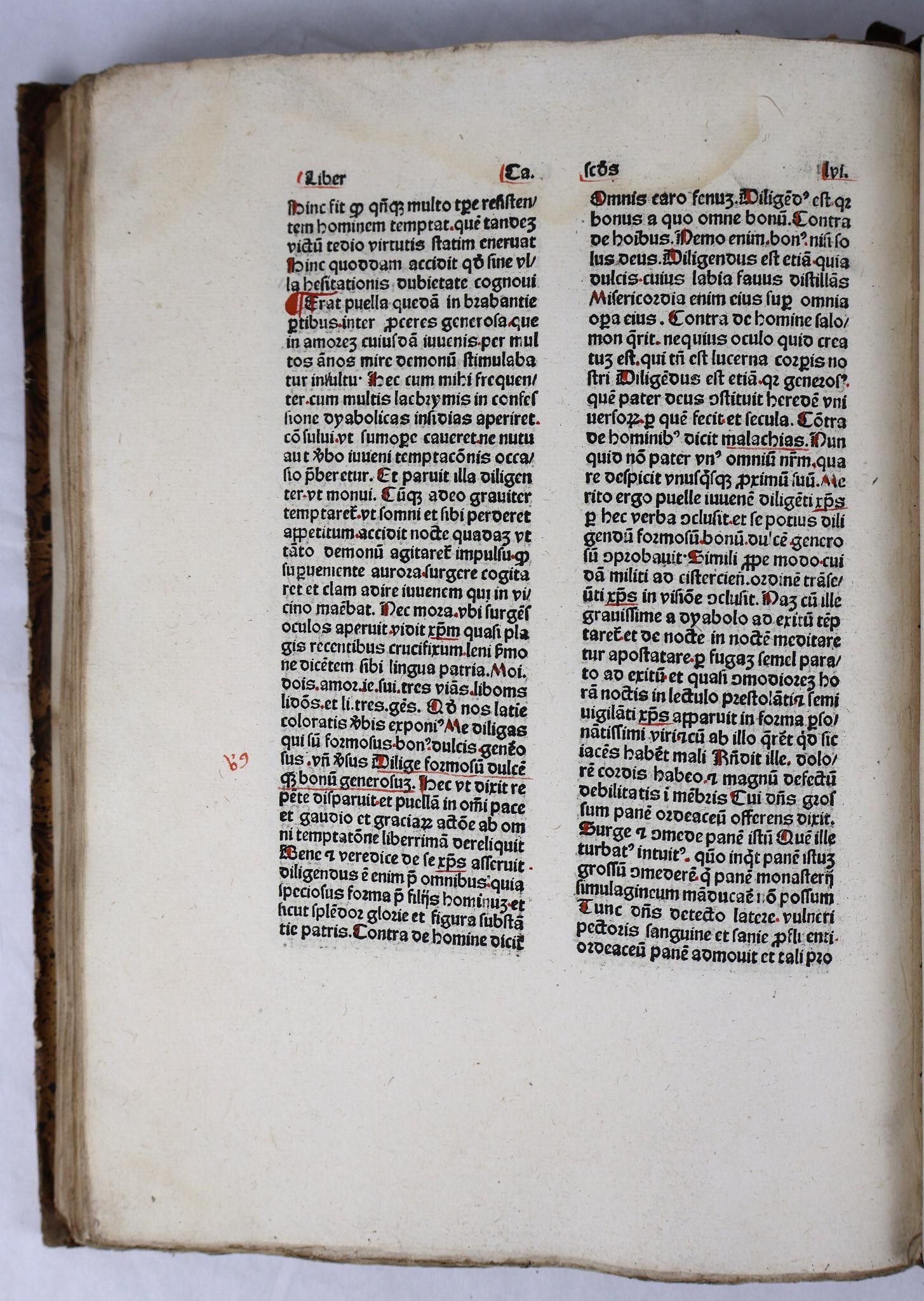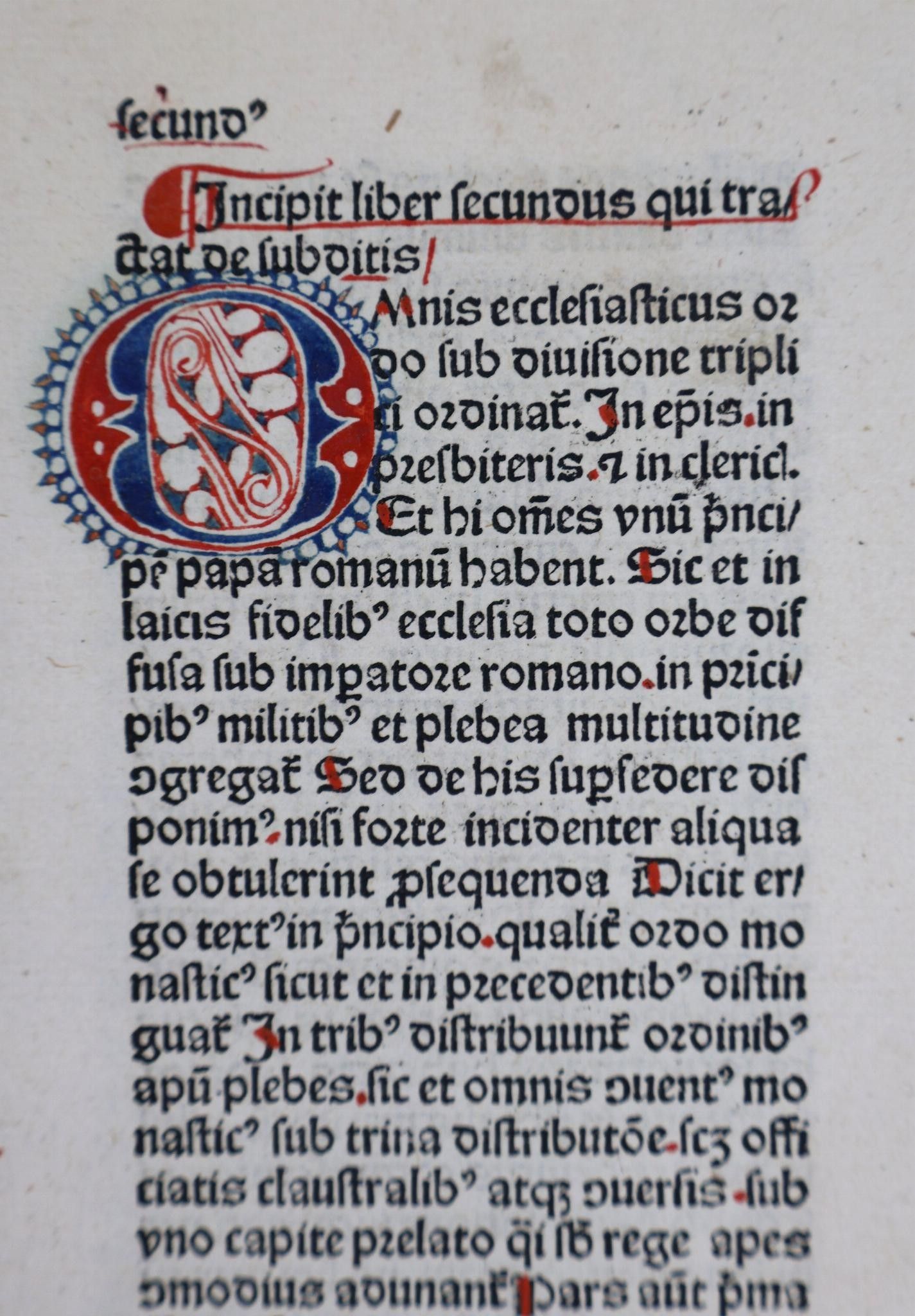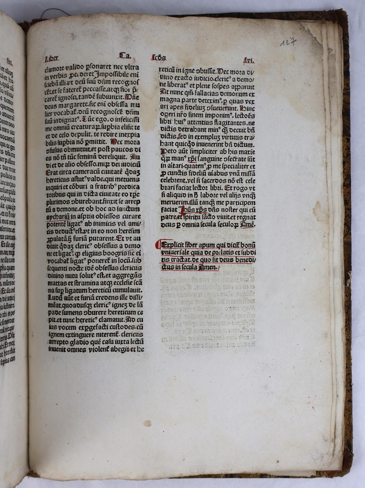 [Incunabulum]. THOMAS CANTIPRATENSIS [Thomas de Cantimpré]. Bonum universale de proprietatibus apum. [Cologne, Johann Koelhoff the Elder, c. 1478-80]. In-folio of 133 [of 134] ff (Signs: a-o8, p7, q8, r6). A rubricated copy, the initial of each of the two parts decorated in red and blue. Text on two columns of 39 lines. Half fawn basane, richly decorated smooth spine, fawn morocco t.p., boards covered with imitation shagreened basane paper (Binding circa 1830).
