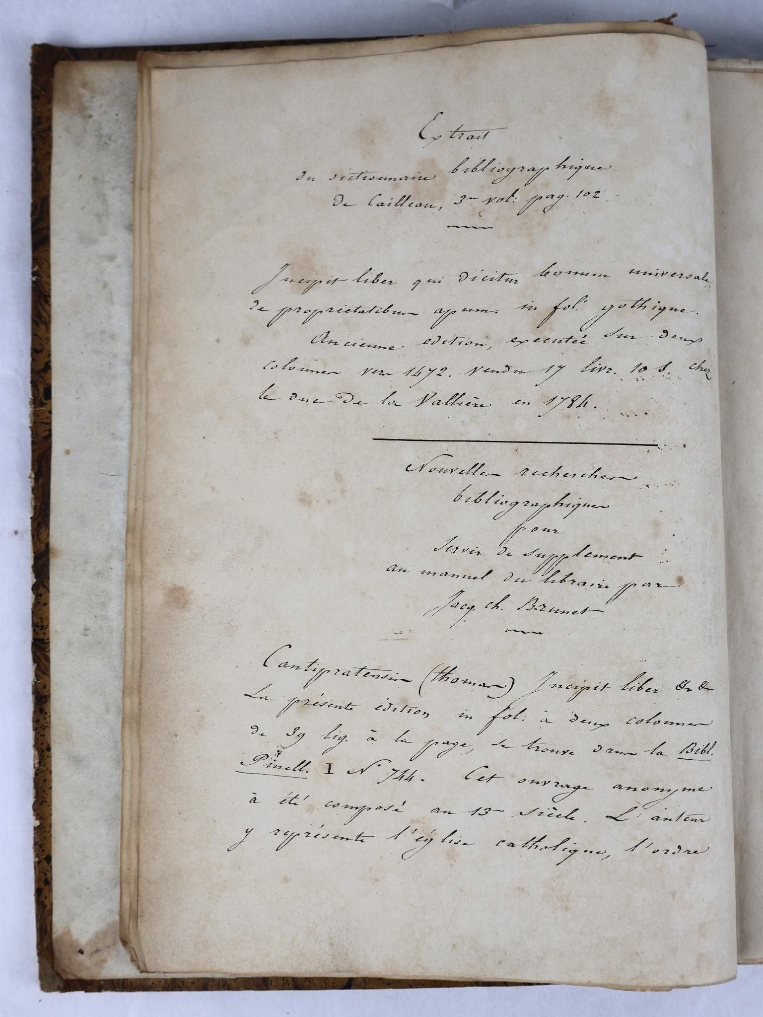 Rare incunabulum of the work by the theologian, hagiographer and encyclopaedist, the Flemish Dominican Thomas de CANTIMPRE (1201- 1272), Le bien universel ou les abeilles mystiques, written between 1256 and 1263, a work of moral and spiritual edification supported by examples and similitudes drawn from the life of bees which are used allegorically; "convents in particular are the emblem of the beehive" (long handwritten bibliographical note at the head of the work, probably written in the early 19th century). This copy contains valuable information on beekeeping in the Middle Ages. Some period headlines and marginal annotations in red ink.
