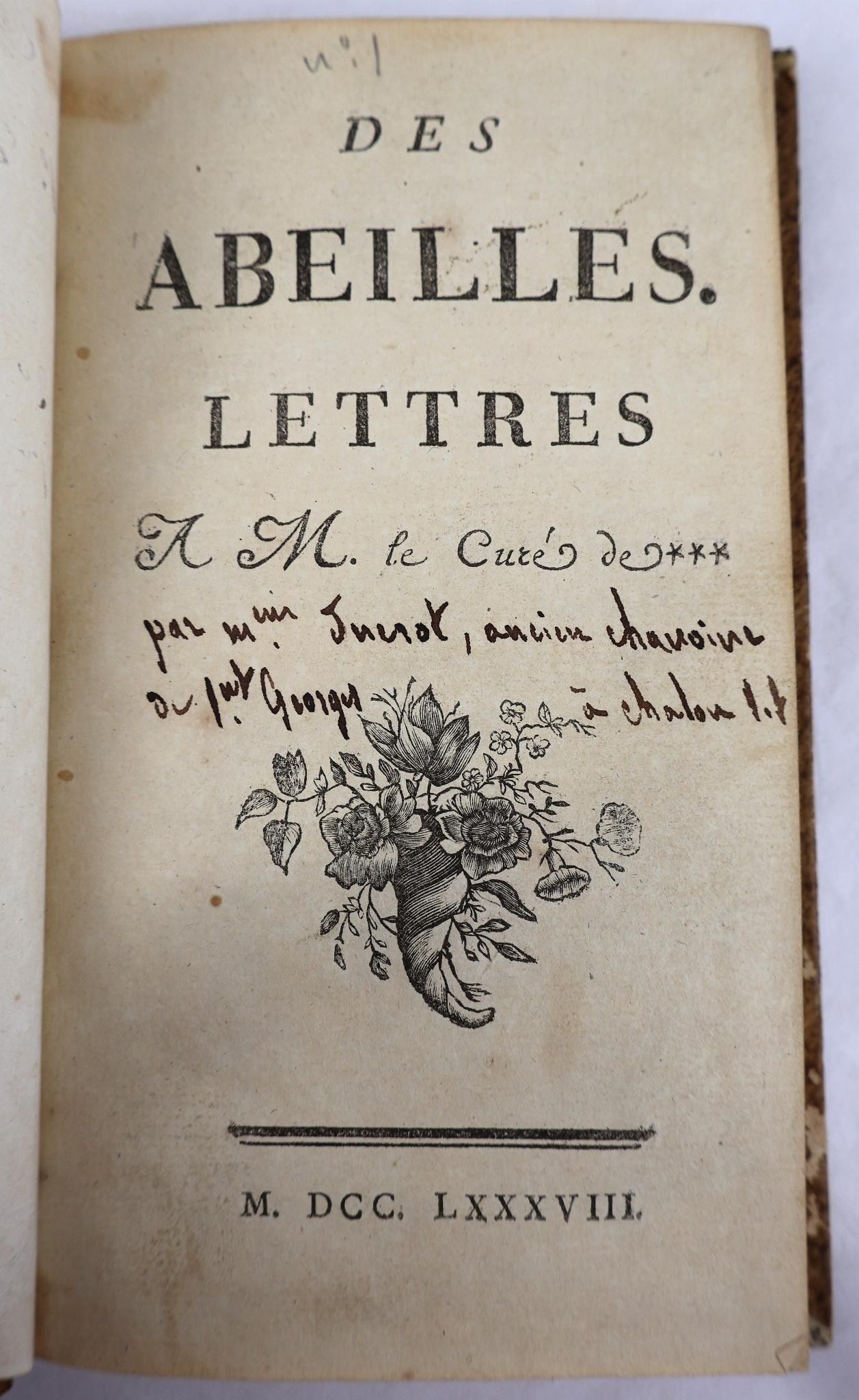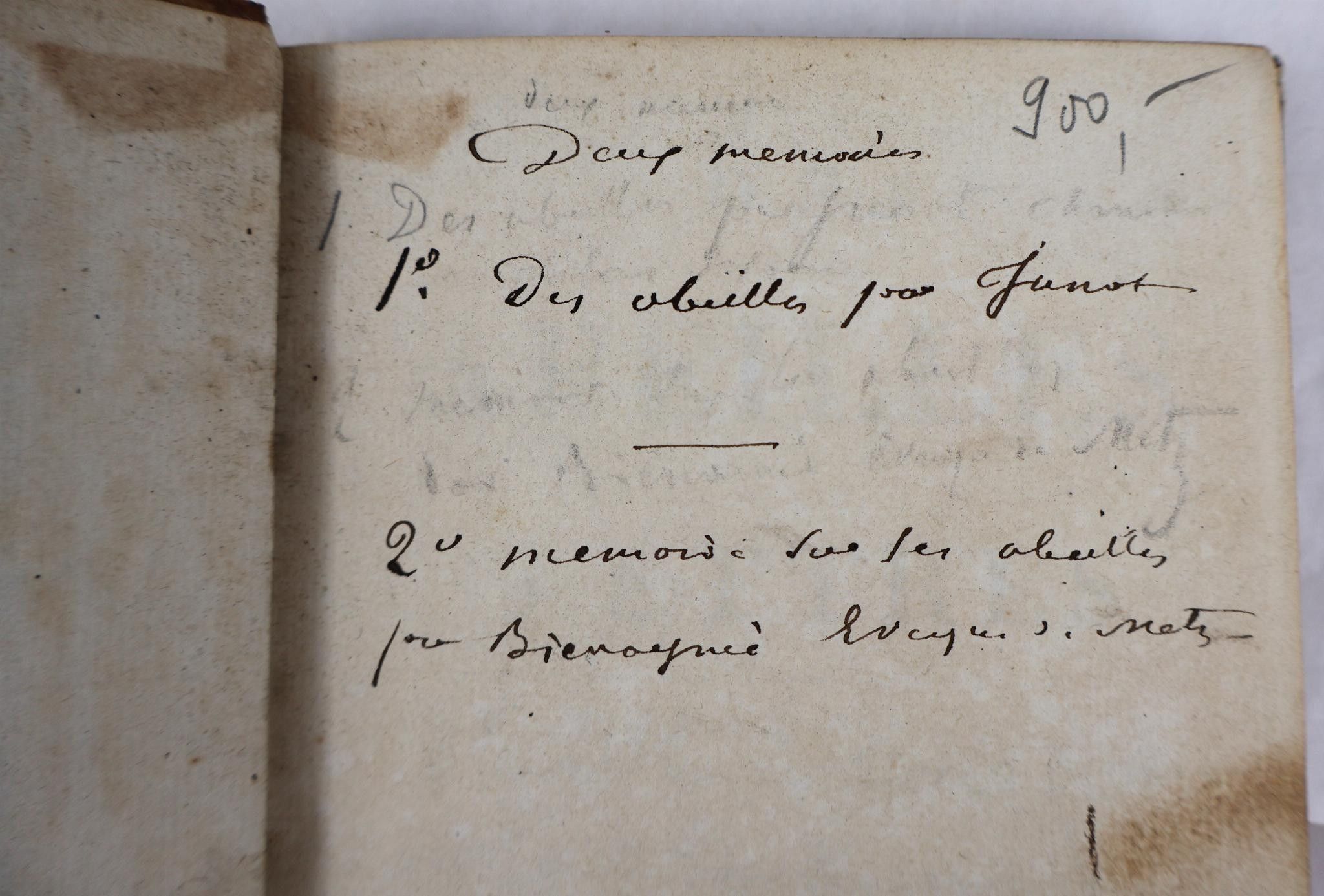 [JUNOT, former canon of St Georges in Châlons-sur-Saône]. Bees. Letters to M. le Curé de ***. Sans lieu ni nom, 1788. In-8° of 72 pp. [followed by 6 pp. of formerly ms. comments, then by 5 bl. ff]. [Bound at the end:] BIENAYME (Pierre-François, évêque de Metz). Memoir on bees. Nouvelle manière de construire des ruches en paille, et la façon de gouverner les Abeilles. New edition. Metz, Collignon, An XII - 1803. In-12 of [2], 76, [4] pp. 2 folding plates [followed by 4 pp. of formerly ms. comments, then 6 bl. ff.]. Demi-basane, smooth spine decorated, green morocco t.p., spotted edges (contemporary binding).