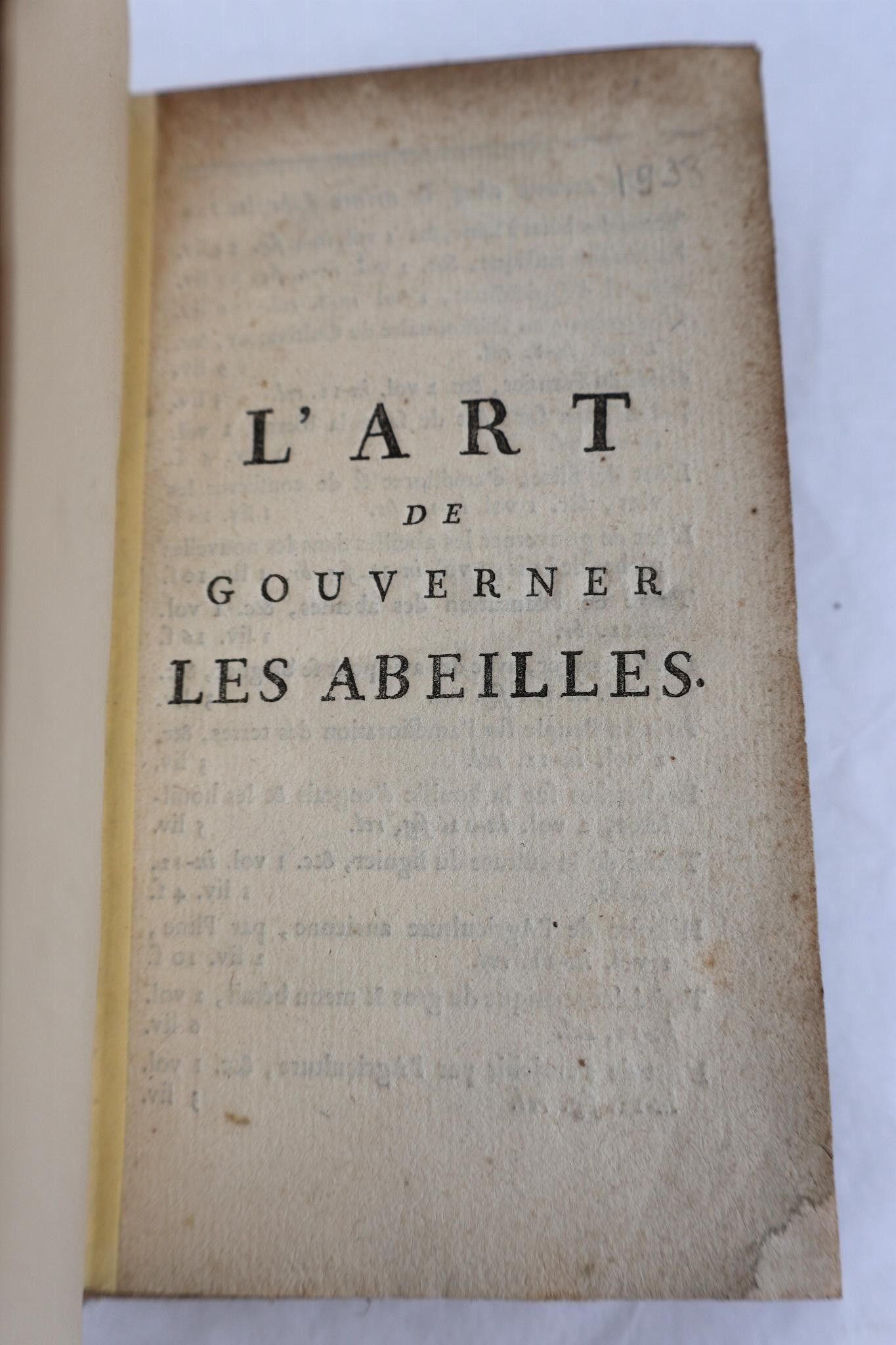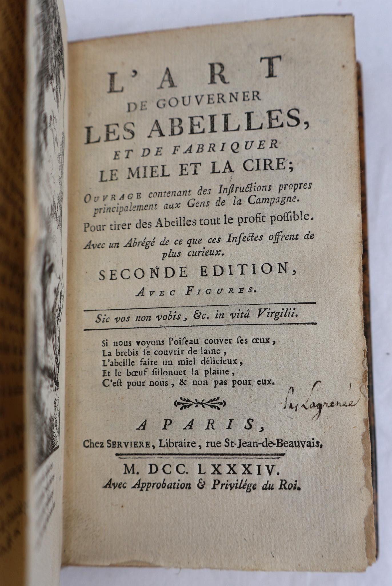 [LAGRENEE (C.-L.)]. L'Art de gouverner les abeilles, et de fabriquer le miel et la cire sans méprises [...] Pour tirer des Abeilles tout le profit possible. Avec un Abrégé de ce que les Insectes offrent de plus curieux. Paris, Serviere, 1784. In- 12 of 250, [2] pp. front. and 3 h.-t. plates. Marbled beige basane, spine with 5 false rings, gilt title (Modern binding).
