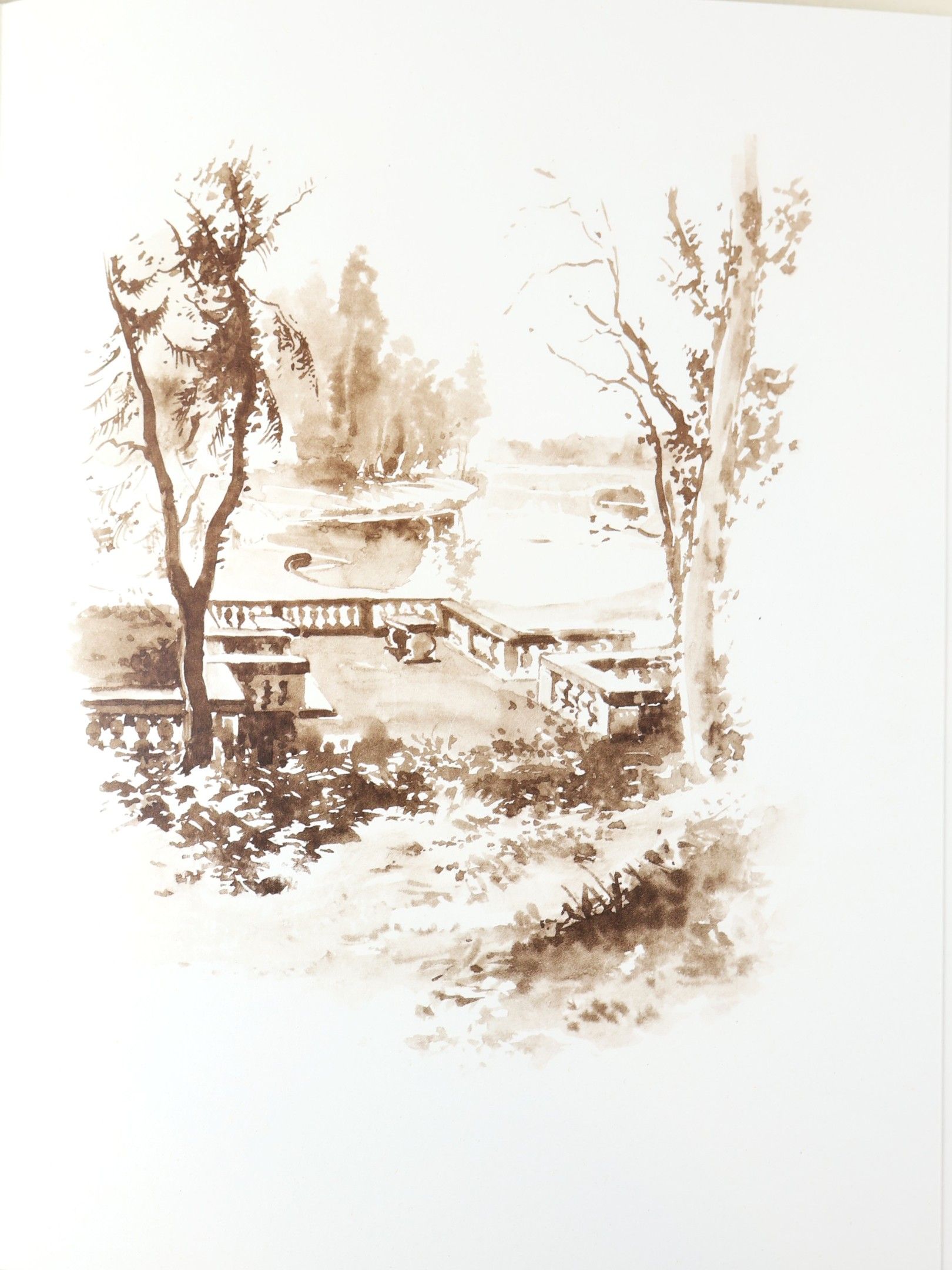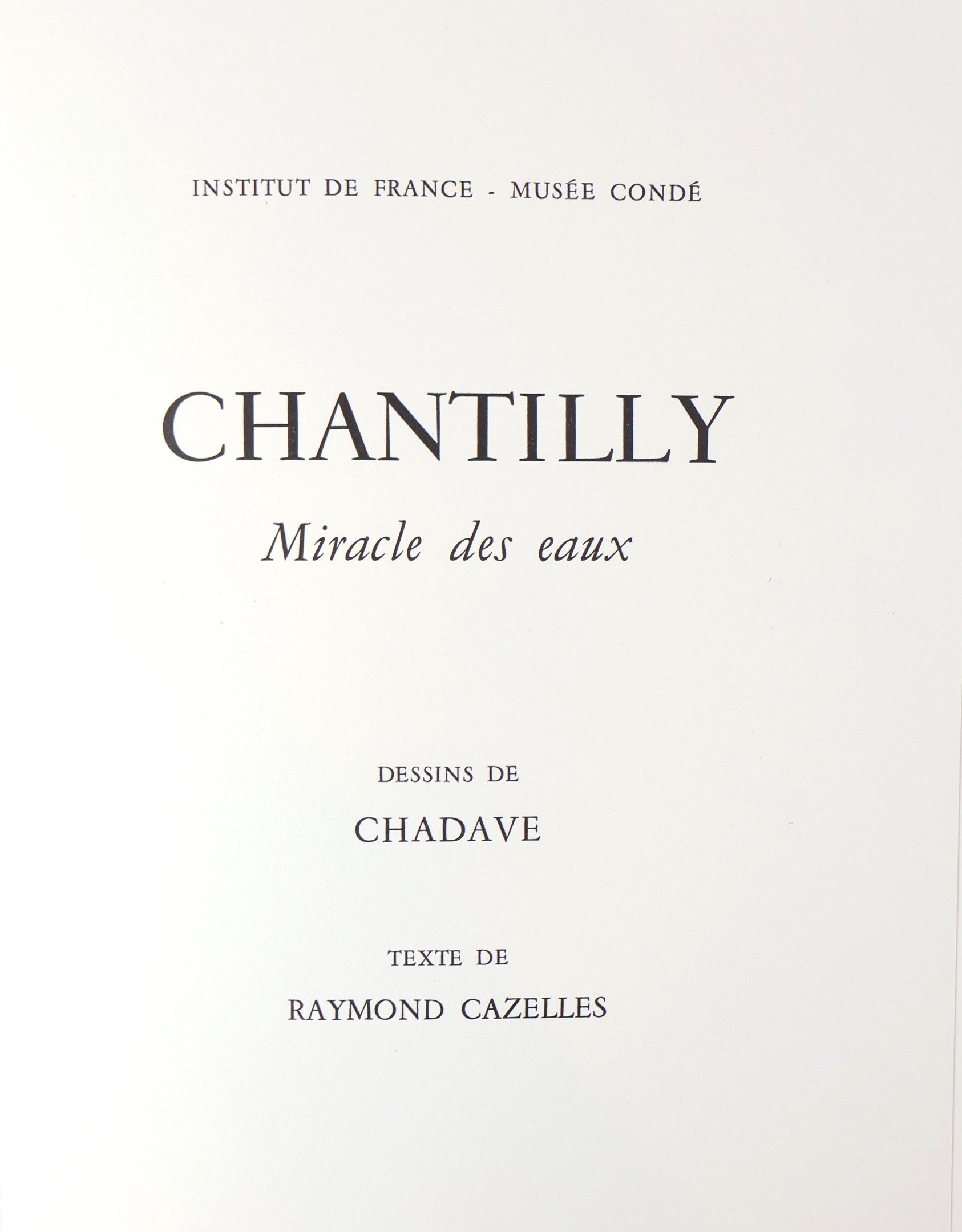 CAZALLES (Raymond). Chantilly, Miracle of the Waters. Paris, Institut de France - Musée Condé, 1976. In-4° of 59 pp. Original drawings by CHADAVE in the text. In sheets, filled illustrated cover, brown cardboard slipcase.