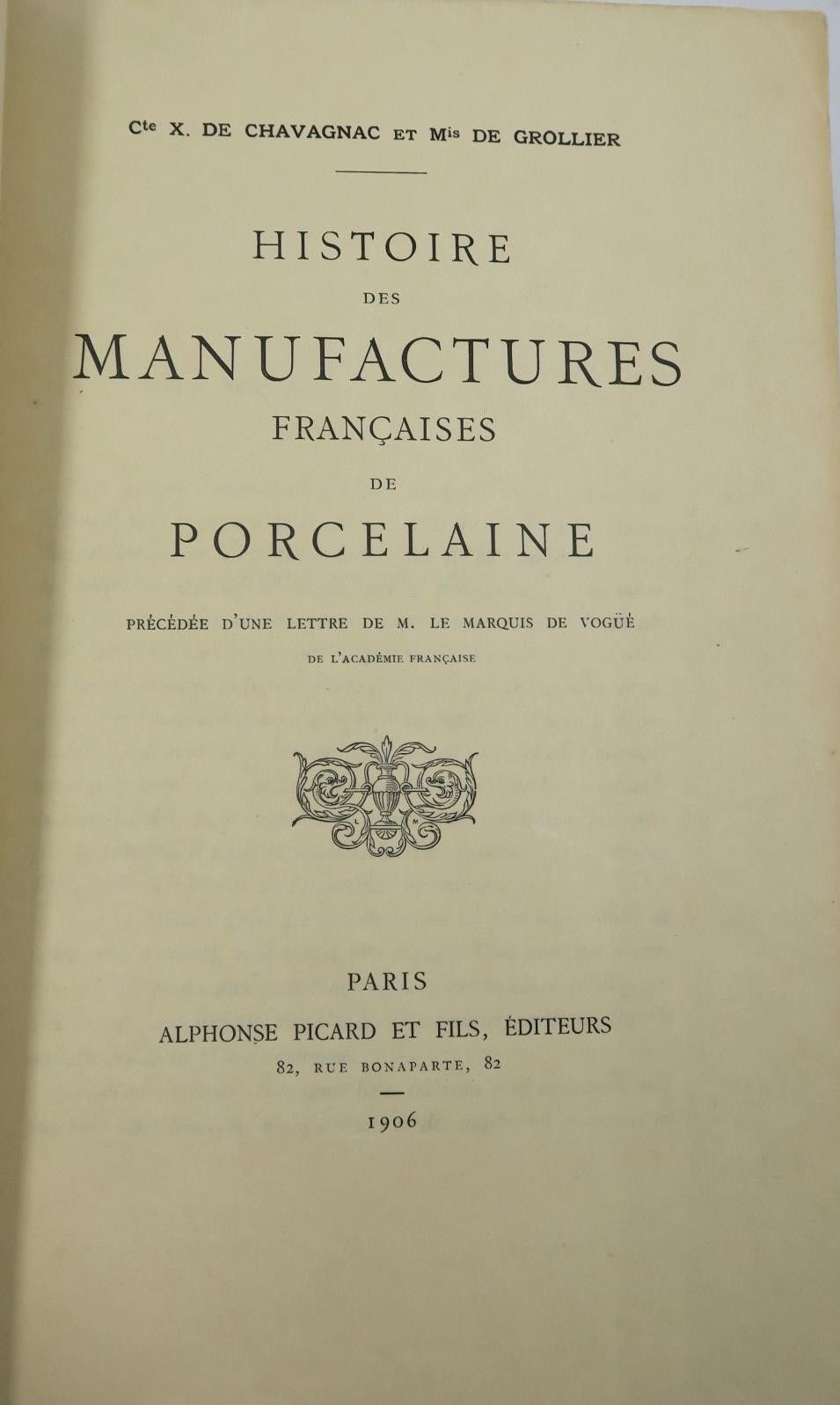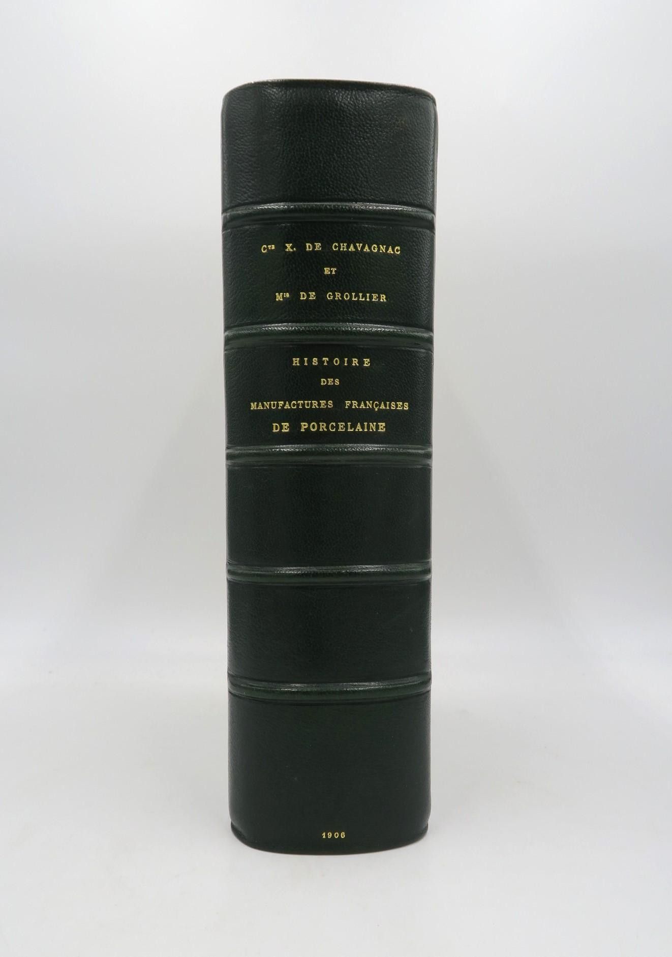Chavagnac, comte X. de & Grollier, marquis de. Histoire des Manufactures françaises de porcelaine. Preceded by a letter from M. Le Marquis de Vogüé. Paris, Alphonse Picard et Fils, 1906. Large in-8° of XXVIII, 966, [1] pp. h.-t. plates and folding tables. Green half-maroquin, spine with 5 raised bands, title gilt, year gilt at foot. First edition. A nominative copy on printed Japon for Gustave Auguste Macon (1865-1930), private secretary to the last Duc d'Aumale and archivist of the Château de Chantilly between 1883 and 1892, then, in accordance with the wishes expressed by Henri d'Orléans in his will, first assistant curator of the Musée Condé, a position he held for life. The authors are indebted to him for giving them access to numerous sources for this work. With a few annotations in pencil.