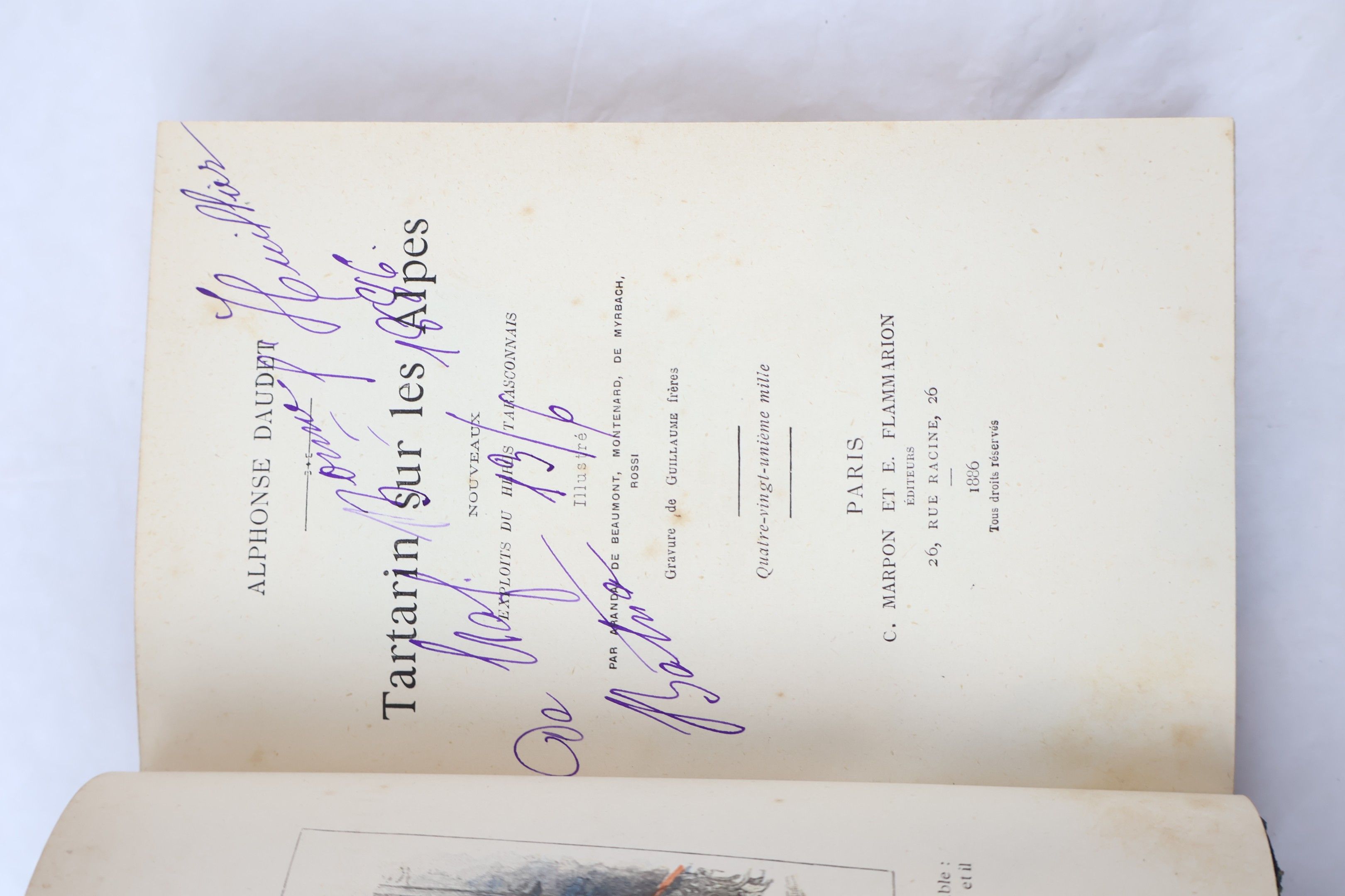 DAUDET (Alphonse). Tartarin sur les Alpes. Nouveaux Exploits du héros Tarasconnais. Paris, C. Marpon et E. Flammarion, 1886. In-8° of 365, [5] pp. Front. in colour and ill. in the text. Blue half-basane, long spine, gilt title, spotted edges (Binding of the period).