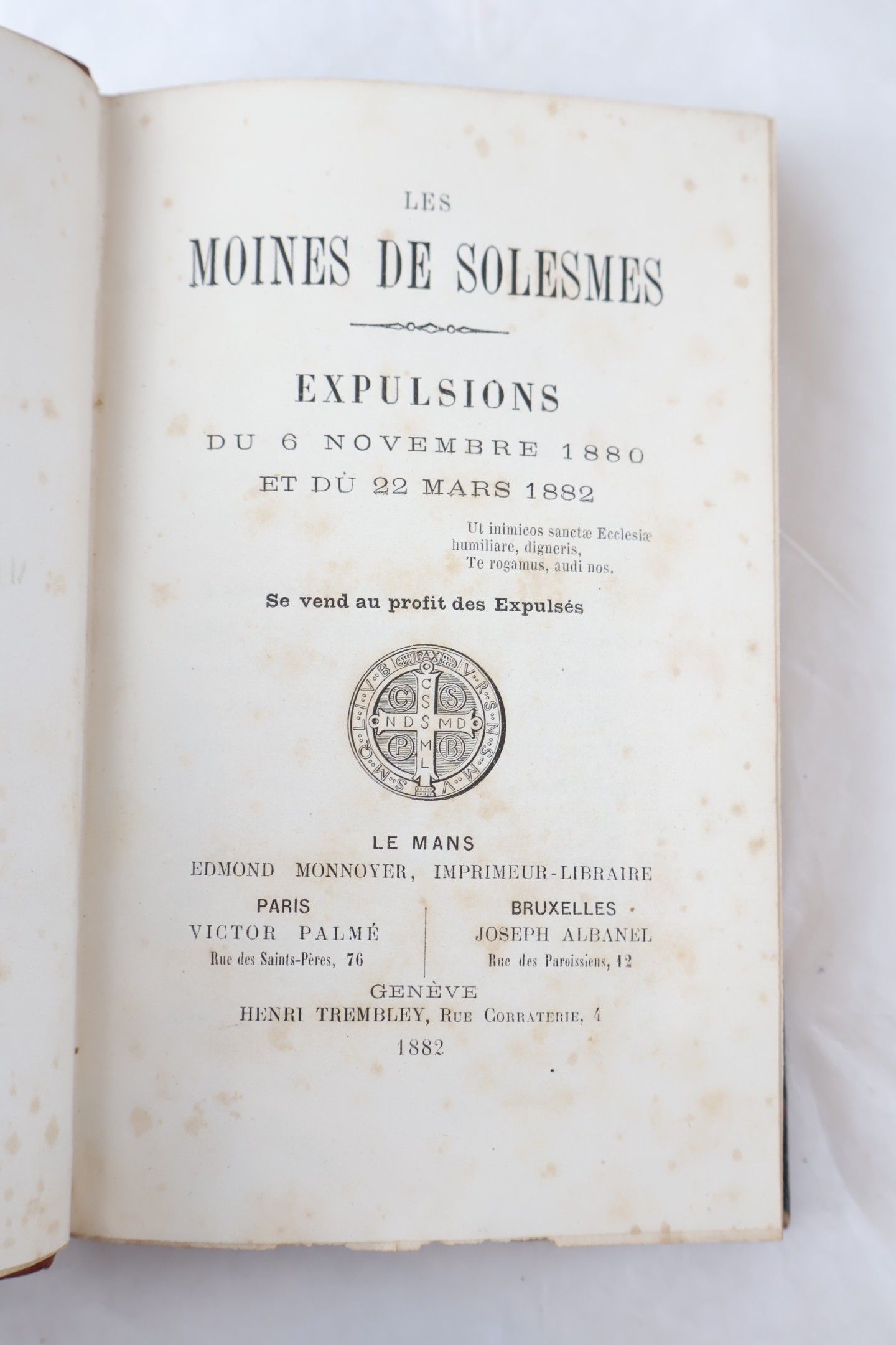 [GUERANGER (Dom Prosper) and CARTIER (E.). Les Moines de Solesmes - Expulsions du 6 novembre 1880 et du 22 Mars 1882. Le Mans, Monnoyer, Paris, Palmé, Bruxelles, Albanel et Genève, Trembley, 1882. In-18, 391 pp. Half tan basane, smooth spine, blue morocco t.p., speckled edges (Binding of the period).