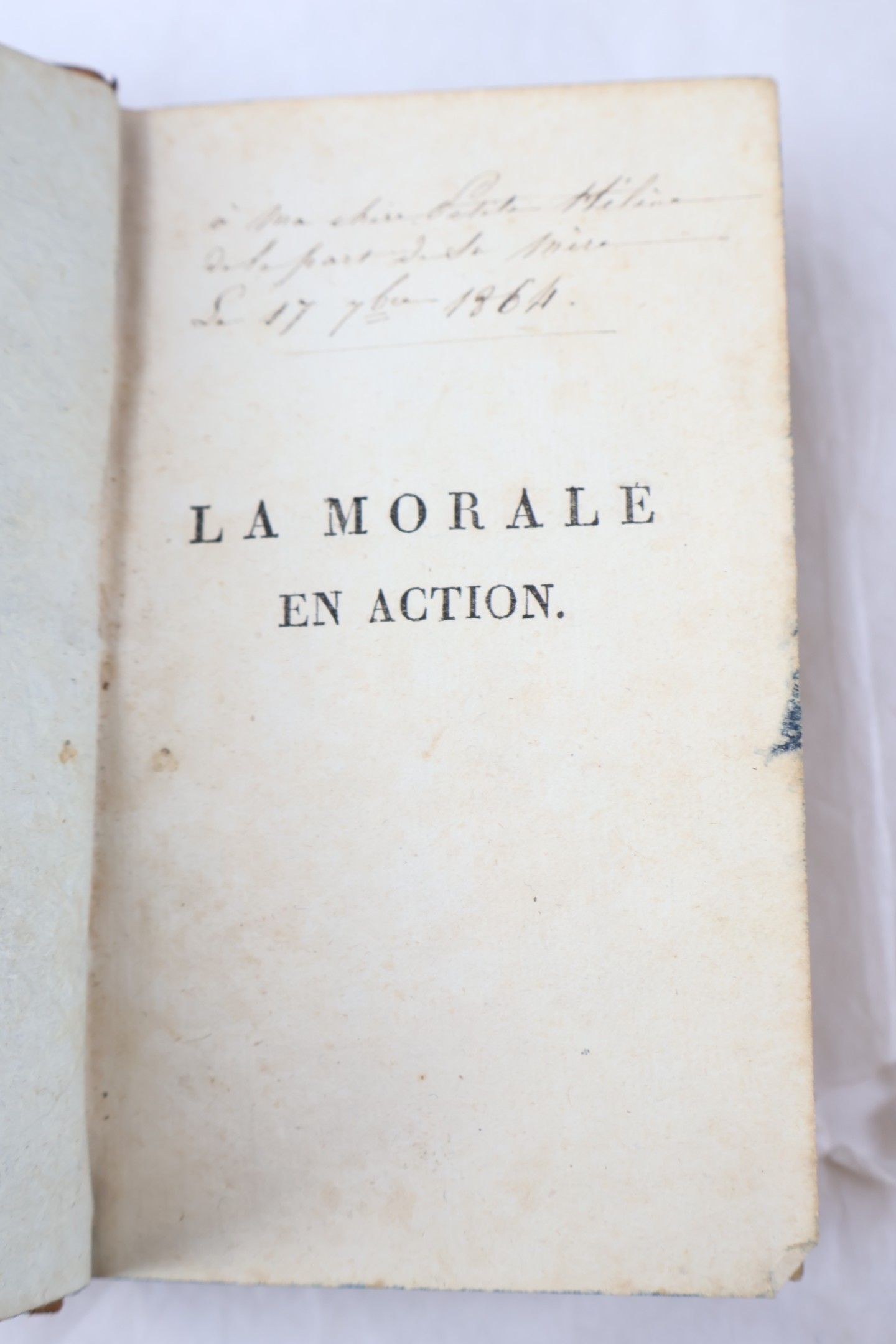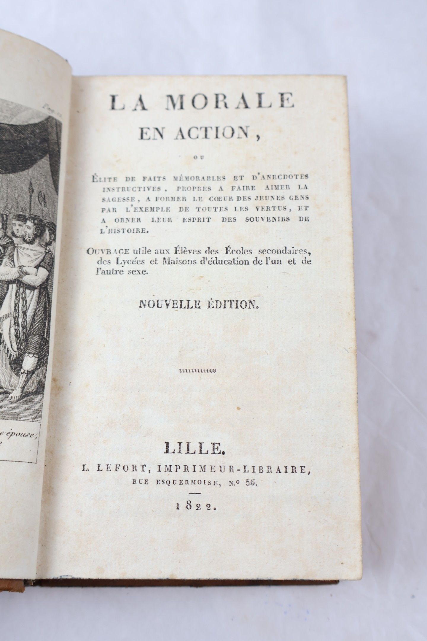 [Anonymous]. La morale en action, ou Elite de faits mémorables et d'anecdotes instructives, propres à faire aimer la sagesse, à former le cœur des jeunes gens par l'exemple de toutes les vertus, et à orner leur esprit des souvenirs de l'histoire. A useful work for pupils in secondary schools, lycées and educational establishments of both sexes. Lille, L. Lefort, 1822. In-12 of viij, 384, [2] pp. fron. and 3 gr. h.-t. Basane fauve racinée, long spine decorated, black morocco t.p., gilt roulette on the edges, marbled edges (Binding of the period).
