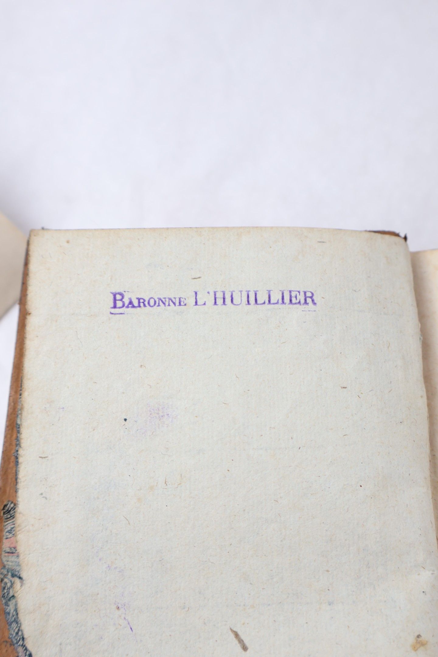 Blue stamp of the Baroness de L'HUILLIER; ex-dono ms. "to my dear little Hélène on behalf of her mother, 17 September 1864". Prize label from Madame LEGRAND's boarding school, 1st prize in Reading obtained by Mlle De FOURMESTRAULX in 1823.