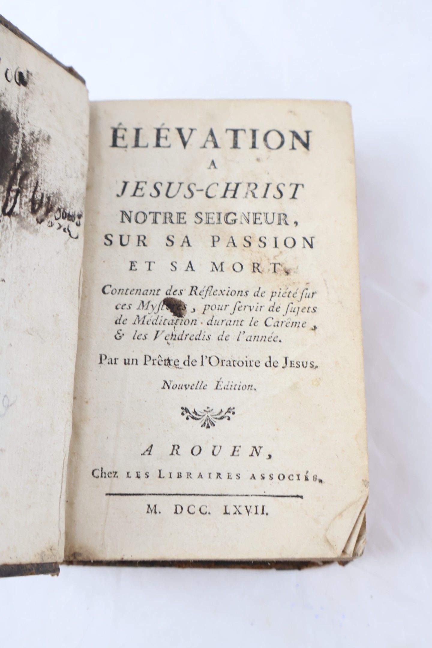 Attached: [QUESNEL (Pasquier)]. Elévation à Jésus- Christ Notre-Seigneur sur sa Passion et sa Mort, contenant des réflexions de piète sur ces mystères, pour servir de sujets de méditation durant le Carême, & les vendredis de l'année. By a priest of the Oratory of Jesus. New edition. Rouen, Les Libraires associés, 1767. In-12 of xxxvj, 335, [5] pp. contemporary fawn basane. [Incomplete table, old graffiti, worn binding].