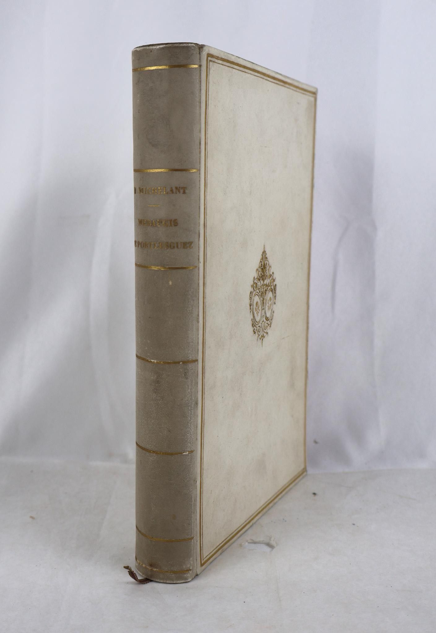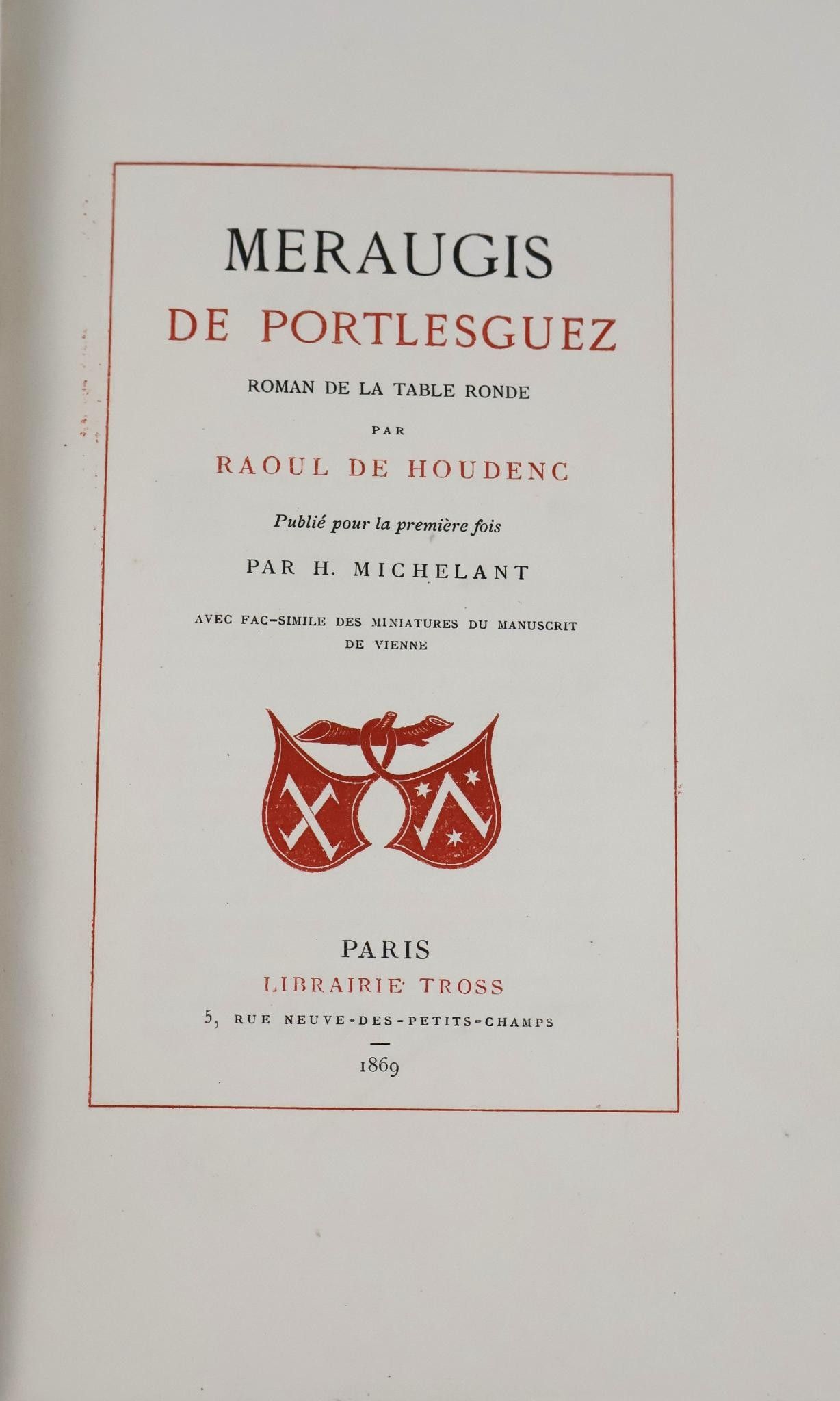 HOUDENC (Raoul de). Meraugis de Portlesguez. Roman de la Table ronde. Paris, Tross, 1869. In-8° of XX, 270 pp. Ivory vellum, smooth spine, gilt title, double gilt fillet on covers with, in the centre, a gilt iron with two floral medallions, gilt fillet on edges, gilt roulette on covers, red edges (Binding of the period).