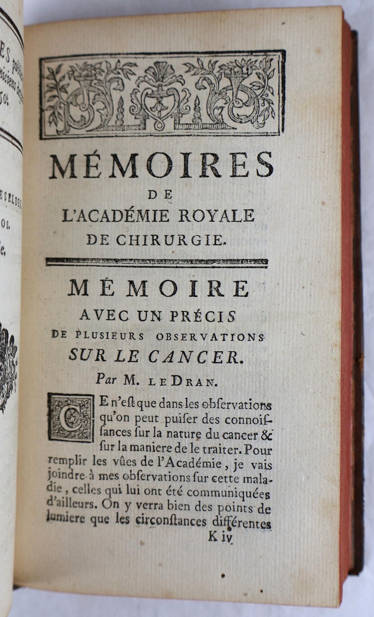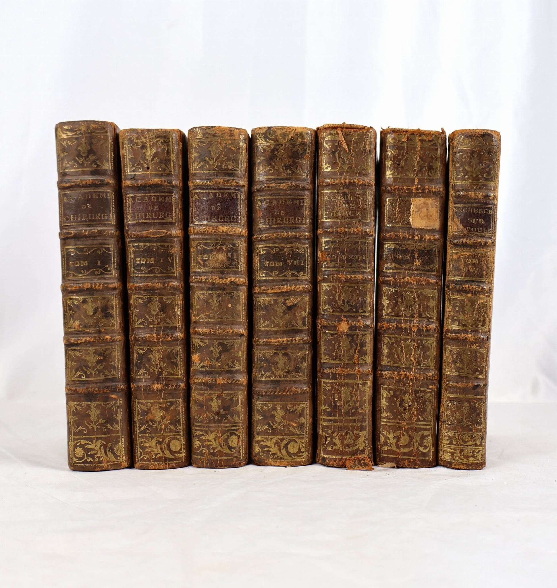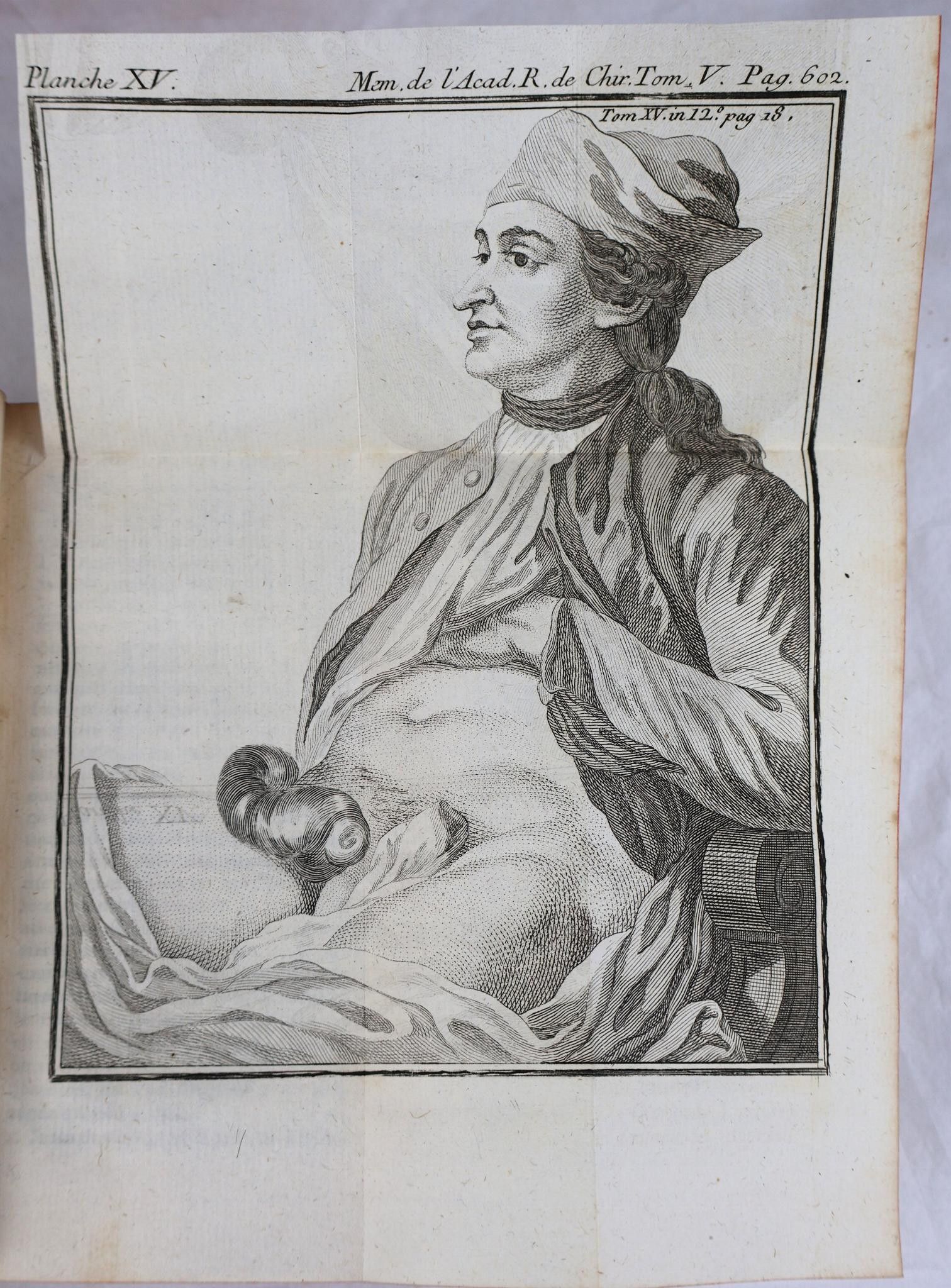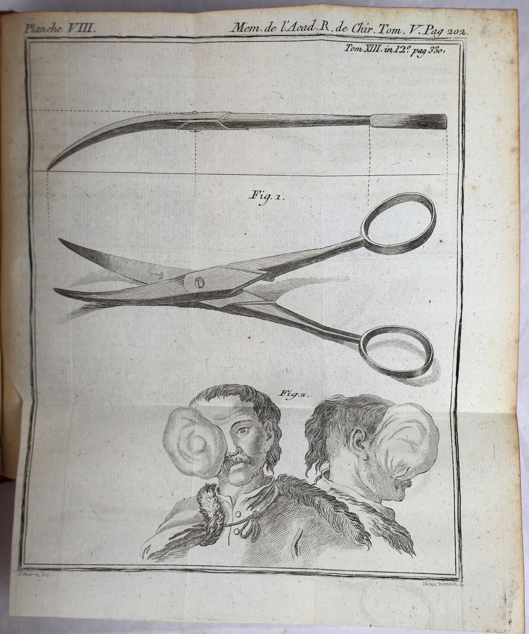 PART IV. Paris, Delaguette, 1753. xij, clxxiv, 232 pp. 4 folding plates h.-t. [Rules of the Academy, hernia, torn limbs, machine to stop arterial blood, lacrimal fistula, fractures, cataract operations, etc.] ? Volume VII. Id. 1757. 432 pp. 3 folded plates. [Cancers, including breast cancer, hydrocele, etc.] ? Volume VIII. Id. 1757. 456 pp. 5 folded plates. [Hernias, kidney stones, organ descent, etc.]. One plate torn but not missing] ? Volume XIII. Paris, P. Fr. Didot, 1774. xlviij, 431 pp. 9 folding h.-t. plates. [Sinus, trepan, eyelid inversion, ophthalmology, etc.] ? Volume XV. vij, [1], 544 pp. 5 folding plates h.-t. [Unnatural anus, hernias, childbirth, amputations, dislocations, ulcers, etc.]. Marbled fawn calf, 5 ribbed spine with flowers, t. and tom. pages in fawn morocco, cold fillet on covers, gilt on edges, red edges (Binding of the period).