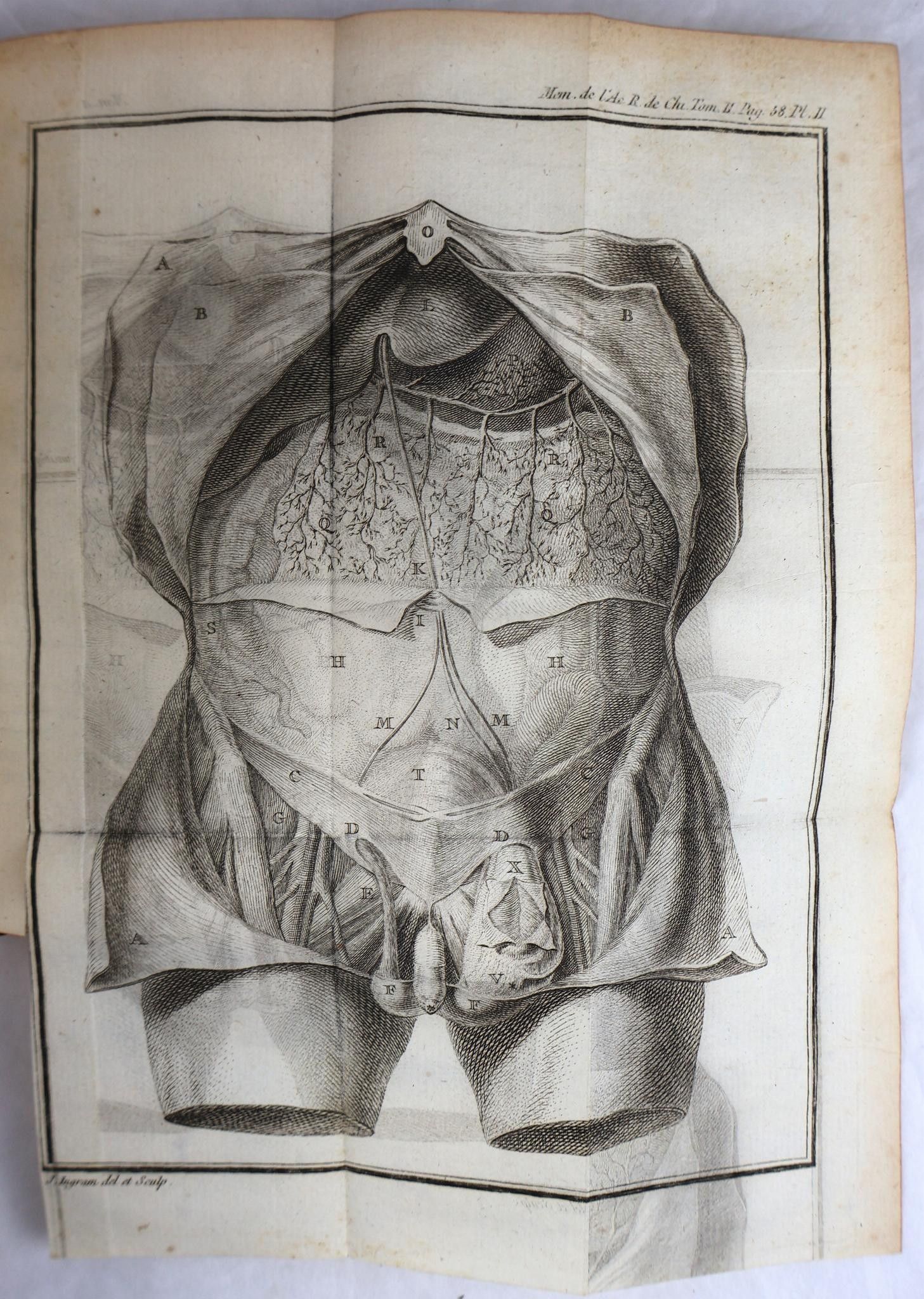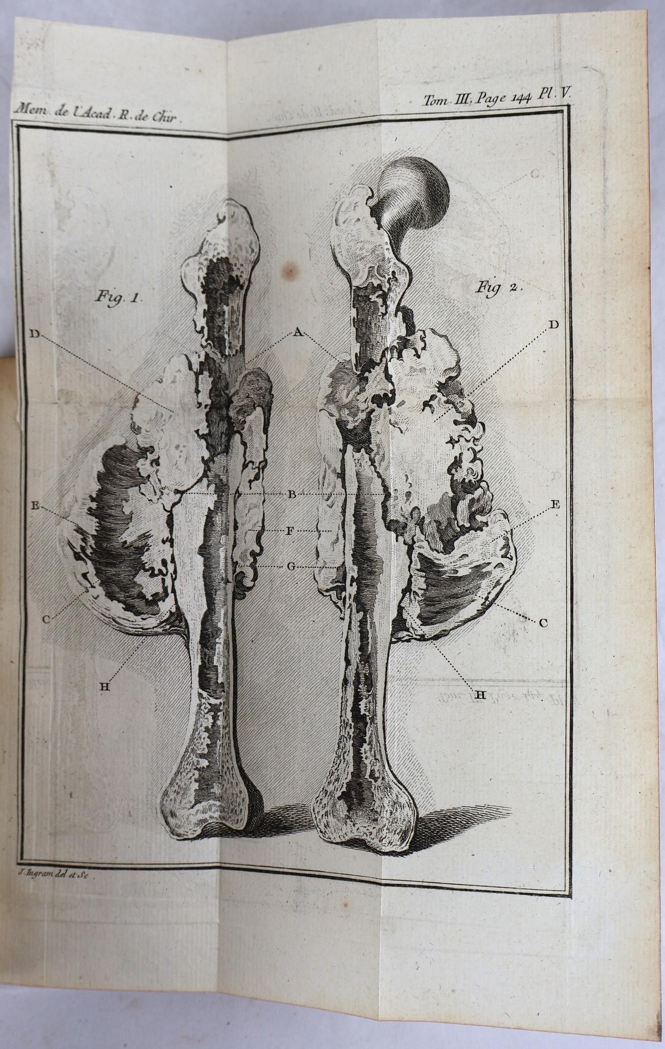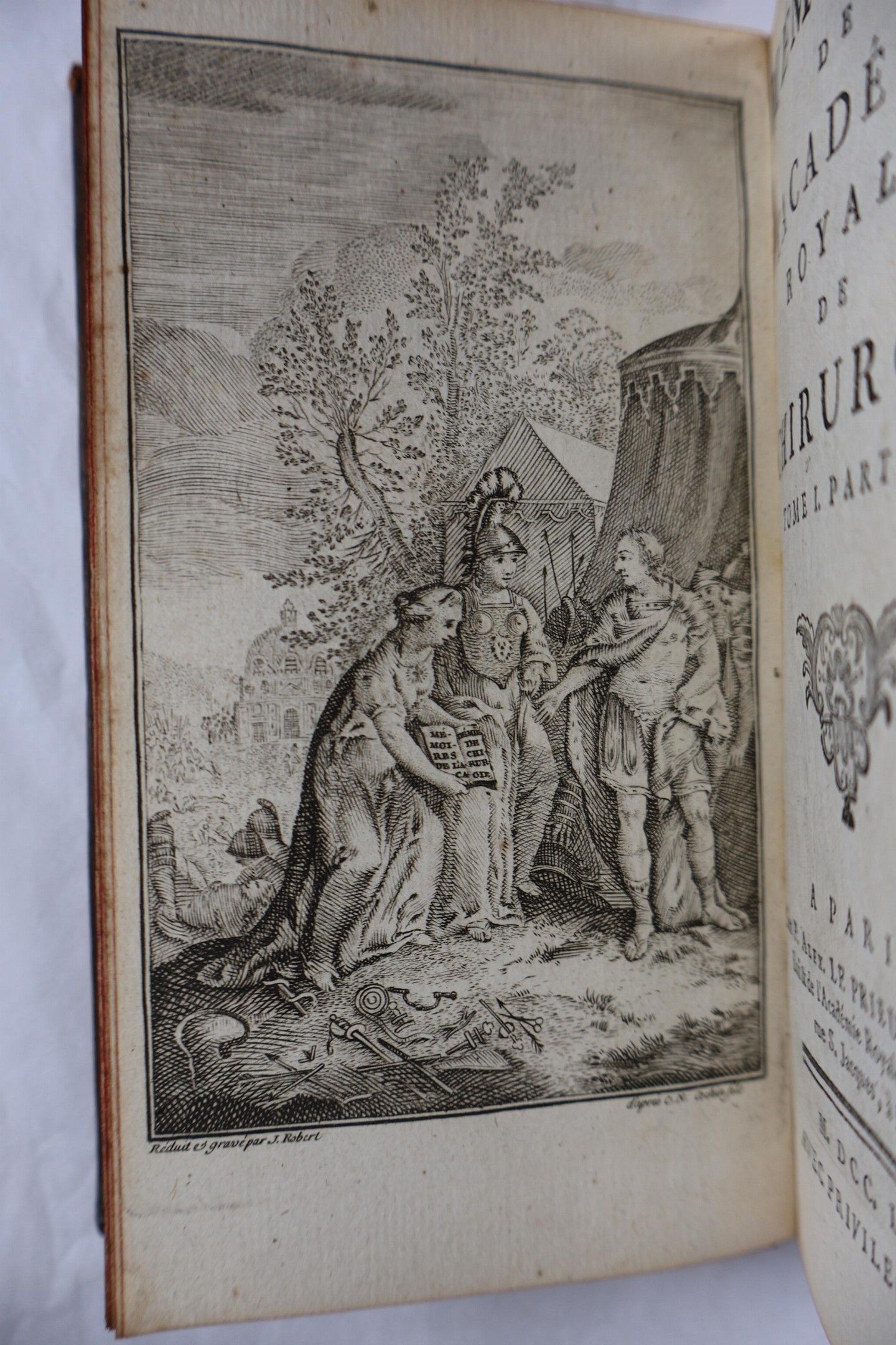PART IV. Paris, Delaguette, 1753. xij, clxxiv, 232 pp. 4 folding plates h.-t. [Rules of the Academy, hernia, torn limbs, machine to stop arterial blood, lacrimal fistula, fractures, cataract operations, etc.] ? Volume VII. Id. 1757. 432 pp. 3 folded plates. [Cancers, including breast cancer, hydrocele, etc.] ? Volume VIII. Id. 1757. 456 pp. 5 folded plates. [Hernias, kidney stones, organ descent, etc.]. One plate torn but not missing] ? Volume XIII. Paris, P. Fr. Didot, 1774. xlviij, 431 pp. 9 folding h.-t. plates. [Sinus, trepan, eyelid inversion, ophthalmology, etc.] ? Volume XV. vij, [1], 544 pp. 5 folding plates h.-t. [Unnatural anus, hernias, childbirth, amputations, dislocations, ulcers, etc.]. Marbled fawn calf, 5 ribbed spine with flowers, t. and tom. pages in fawn morocco, cold fillet on covers, gilt on edges, red edges (Binding of the period).
