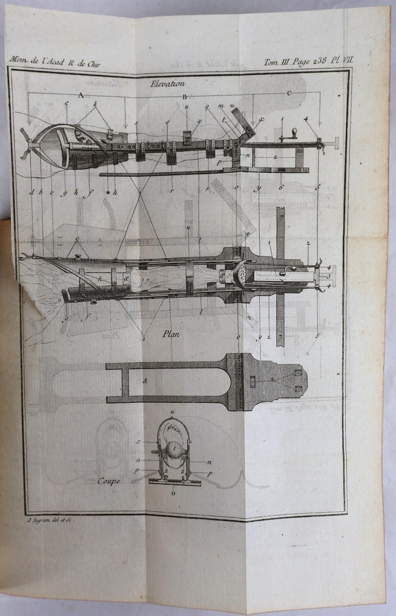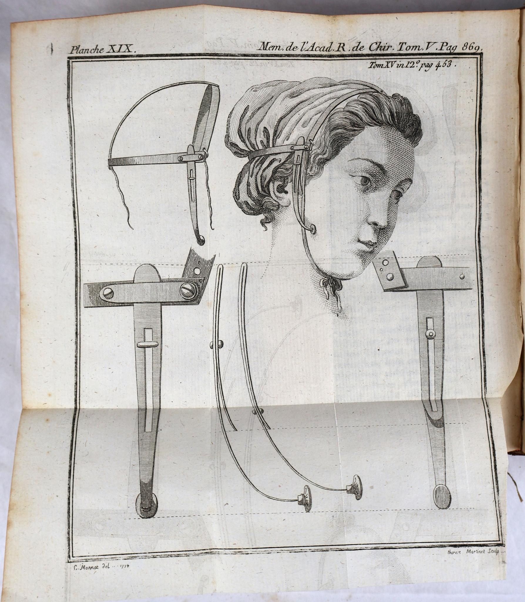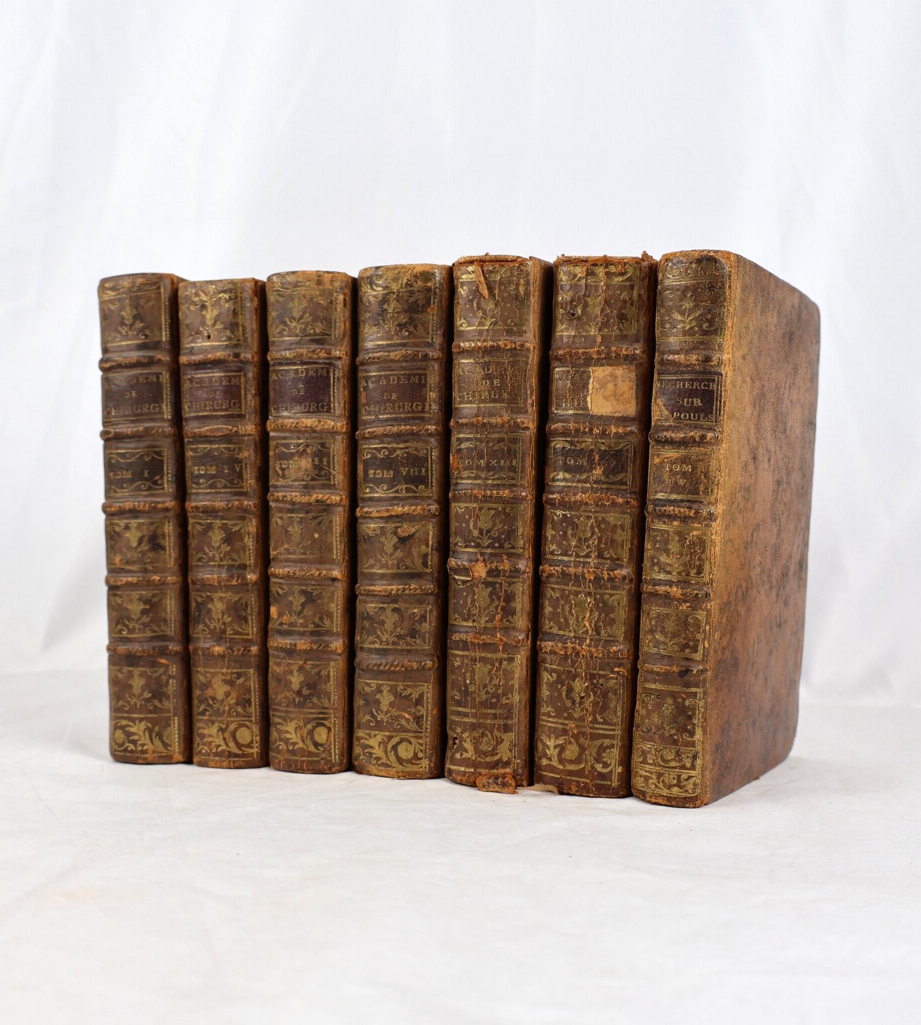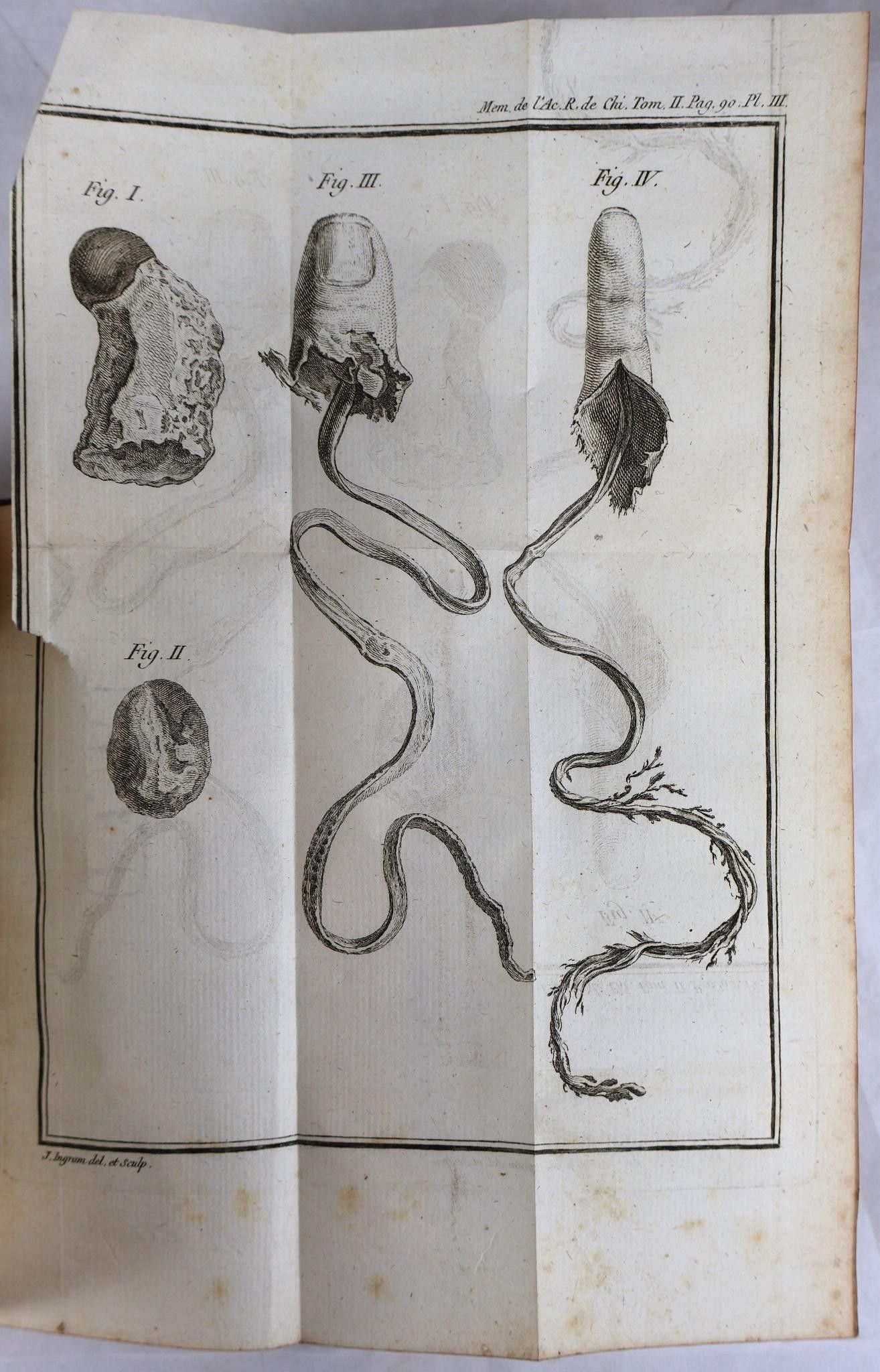 PART IV. Paris, Delaguette, 1753. xij, clxxiv, 232 pp. 4 folding plates h.-t. [Rules of the Academy, hernia, torn limbs, machine to stop arterial blood, lacrimal fistula, fractures, cataract operations, etc.] ? Volume VII. Id. 1757. 432 pp. 3 folded plates. [Cancers, including breast cancer, hydrocele, etc.] ? Volume VIII. Id. 1757. 456 pp. 5 folded plates. [Hernias, kidney stones, organ descent, etc.]. One plate torn but not missing] ? Volume XIII. Paris, P. Fr. Didot, 1774. xlviij, 431 pp. 9 folding h.-t. plates. [Sinus, trepan, eyelid inversion, ophthalmology, etc.] ? Volume XV. vij, [1], 544 pp. 5 folding plates h.-t. [Unnatural anus, hernias, childbirth, amputations, dislocations, ulcers, etc.]. Marbled fawn calf, 5 ribbed spine with flowers, t. and tom. pages in fawn morocco, cold fillet on covers, gilt on edges, red edges (Binding of the period).