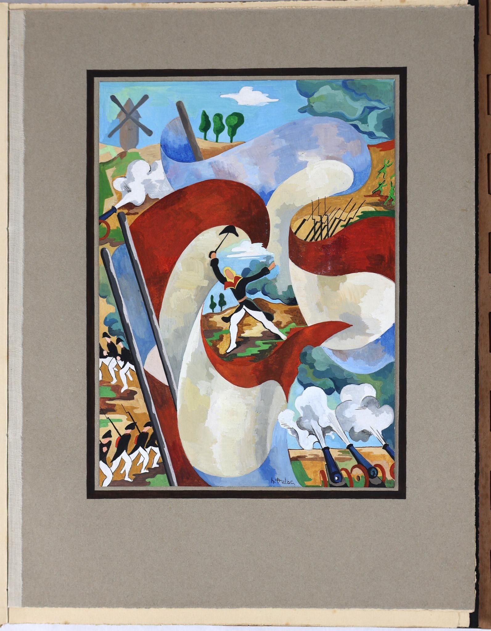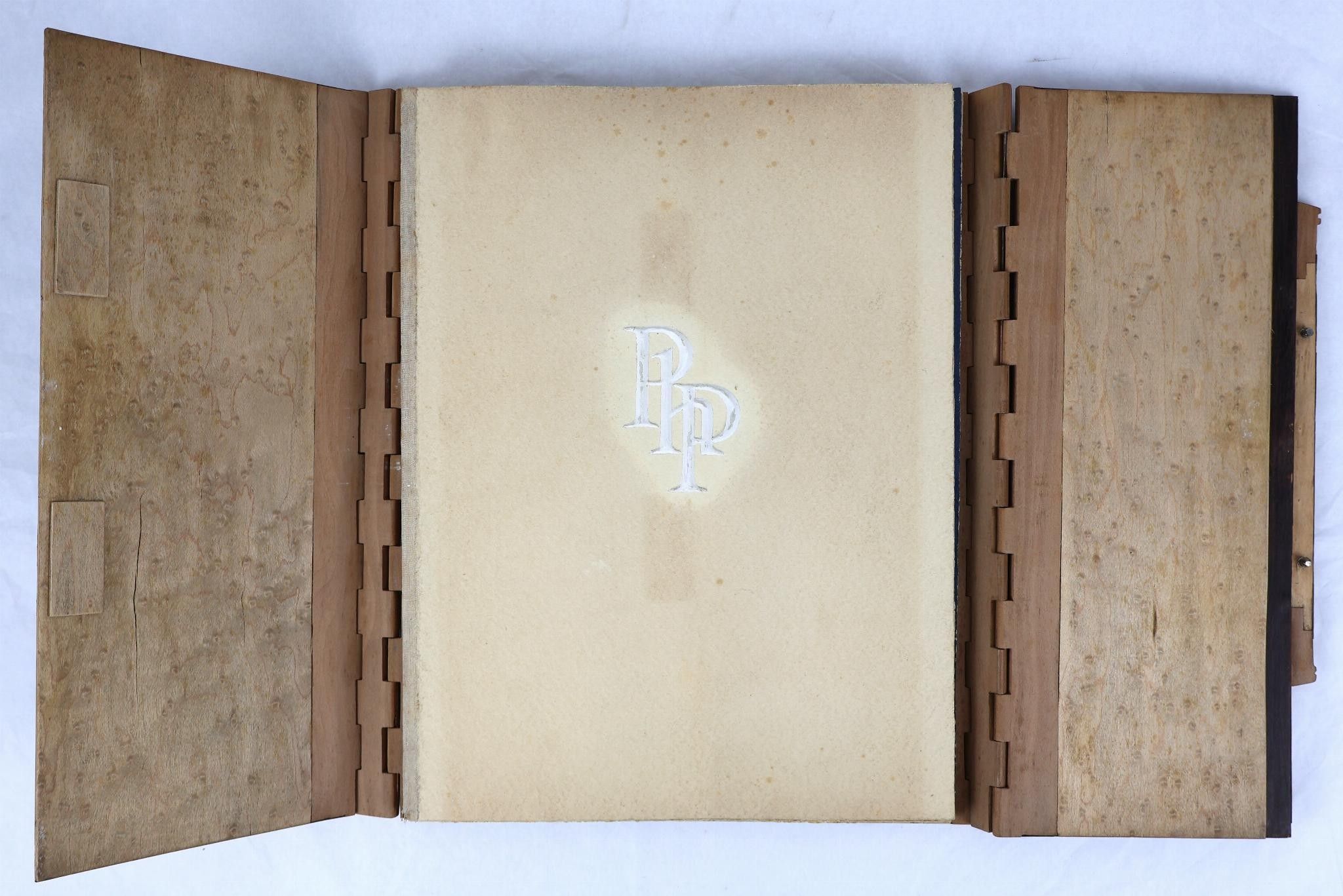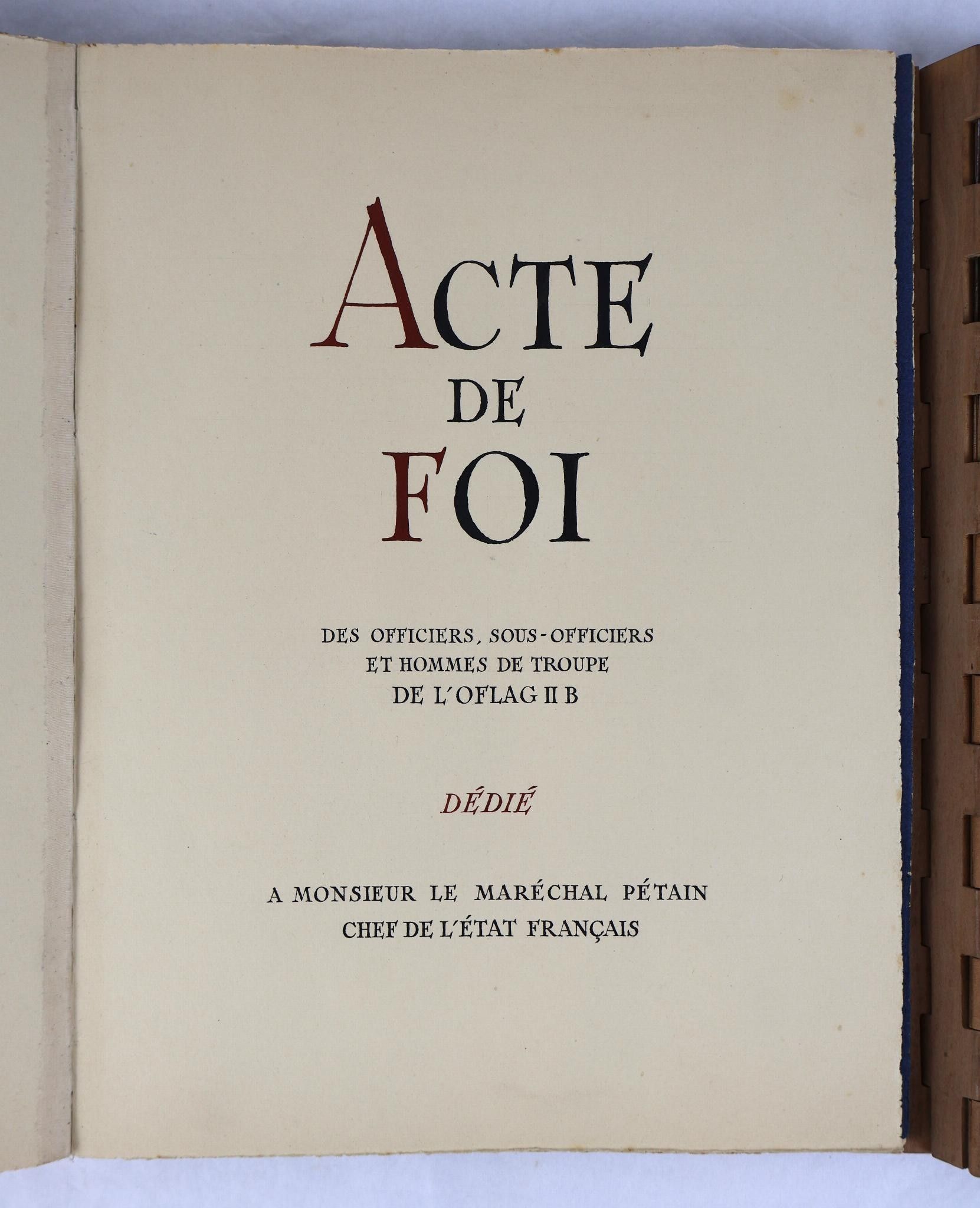 [Collective]. Act of Faith of the Officers, Non-Commissioned Officers and Troops of Oflag II B dedicated to Marshal Pétain, Head of the French State. Offlag II B [Arnswalde (Choszczno, Poland)], 15 August 1942. Manuscript in-4° (31.7 x 23.8 cm) with 1 bl. f., title, 13 ff. and 8 full-page illustrations in gouache and wash. 1 bl. f. Paperback, cream cover with embossed initials of Philippe PETAIN, preserved in an inlaid wooden case opening in two flaps, presenting on the upper cover a Marshal's baton with a francisque decorated with 10 metal stars on its handle, placed on the map of France with the coats of arms of its regions, dated "anno d[omi]ni MCMXLII", and, on the lower cover, "Oflag II