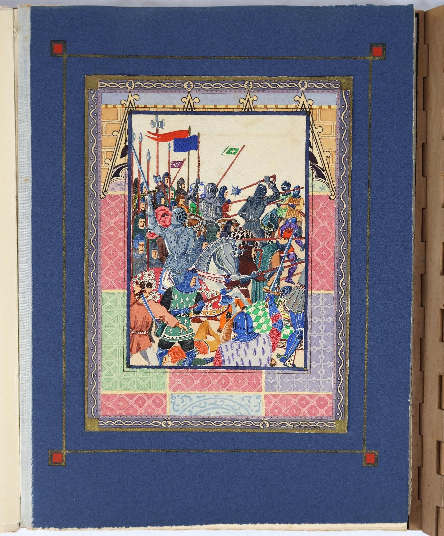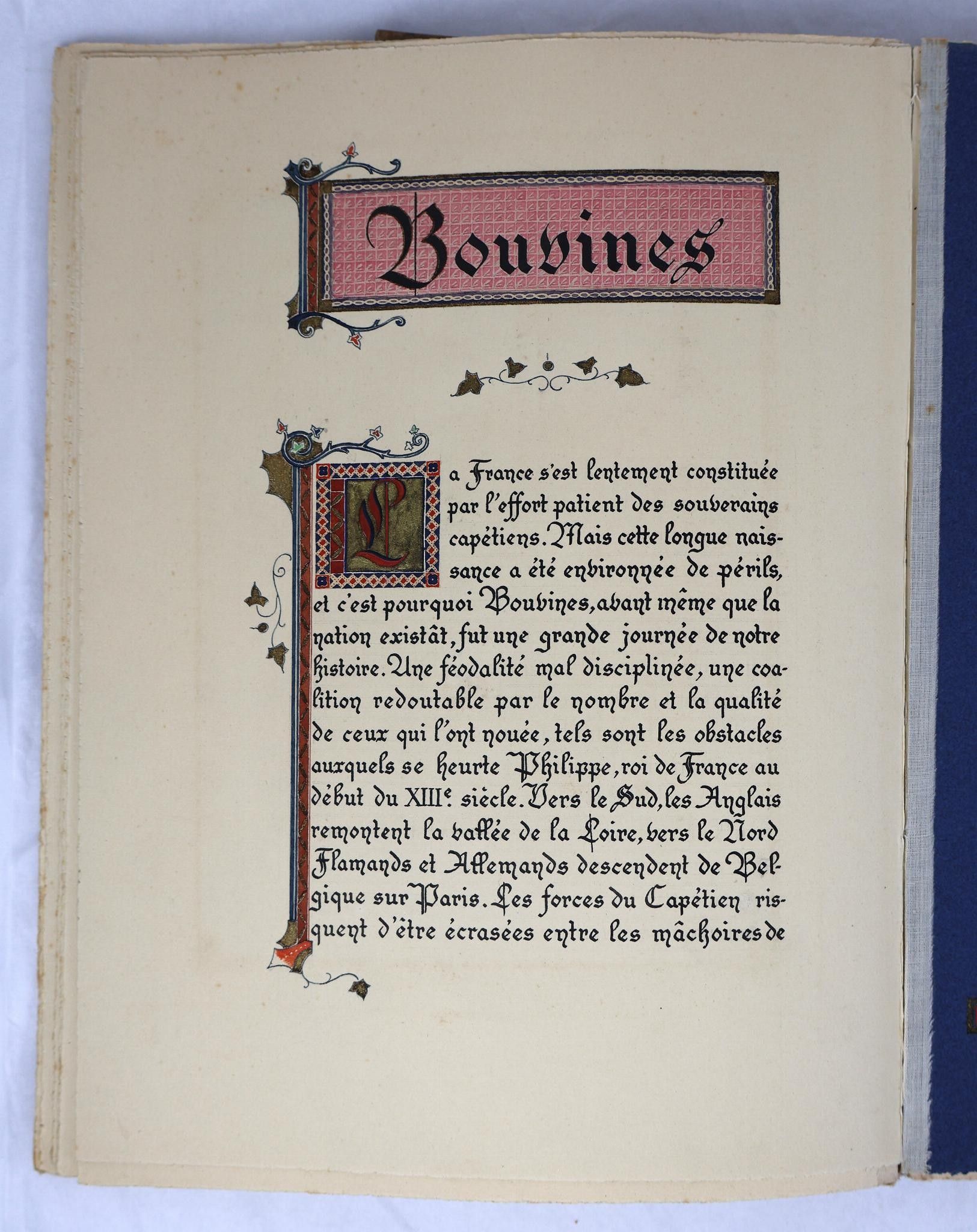Each of the 7 illustrations is mounted on coloured paper, in a frame, with the text opposite decorated with an initials and sometimes illuminations. Some of the artists have signed: LAMBERT-NAUDIN, J. BAYARD, H. DULAC, LANOUX.