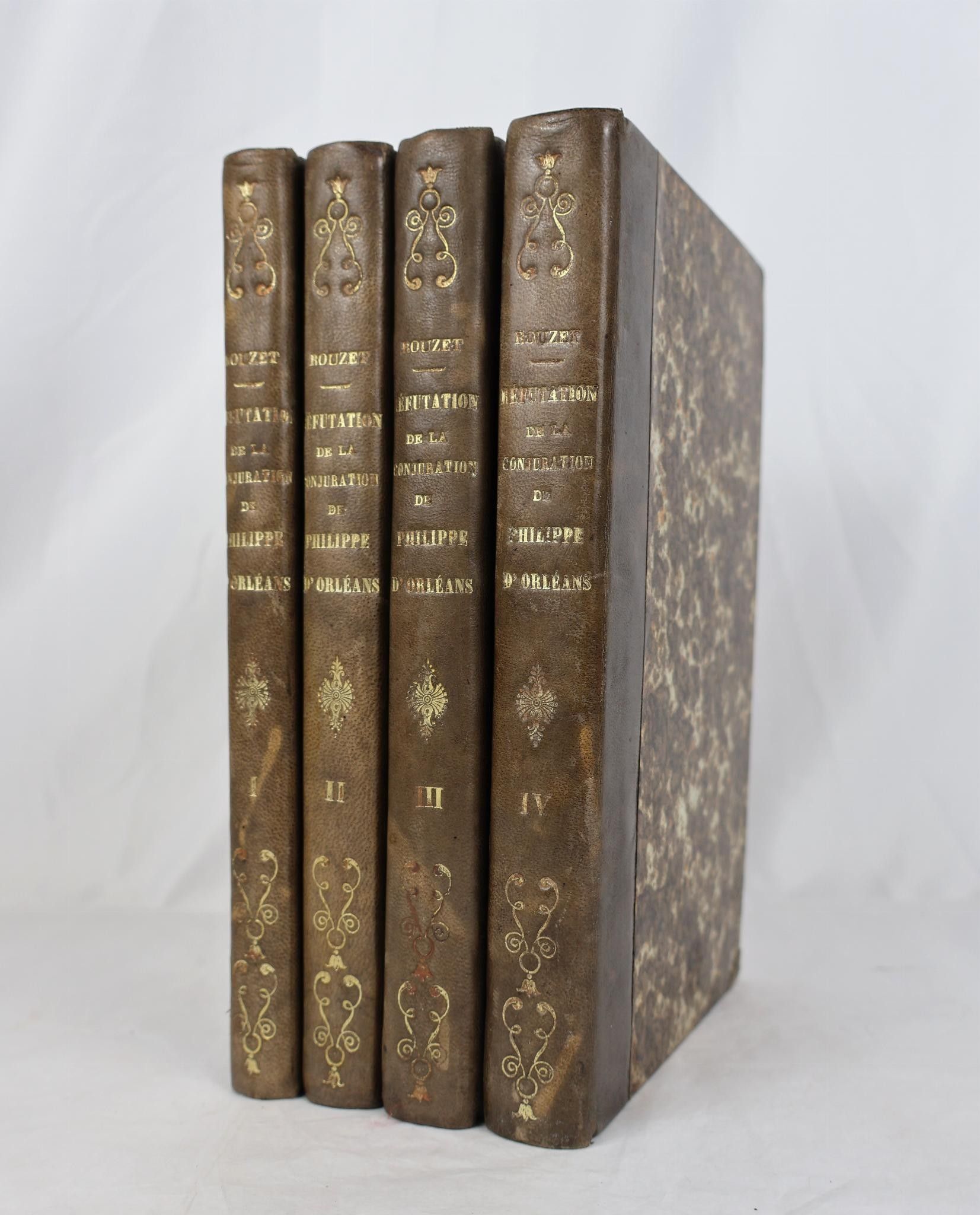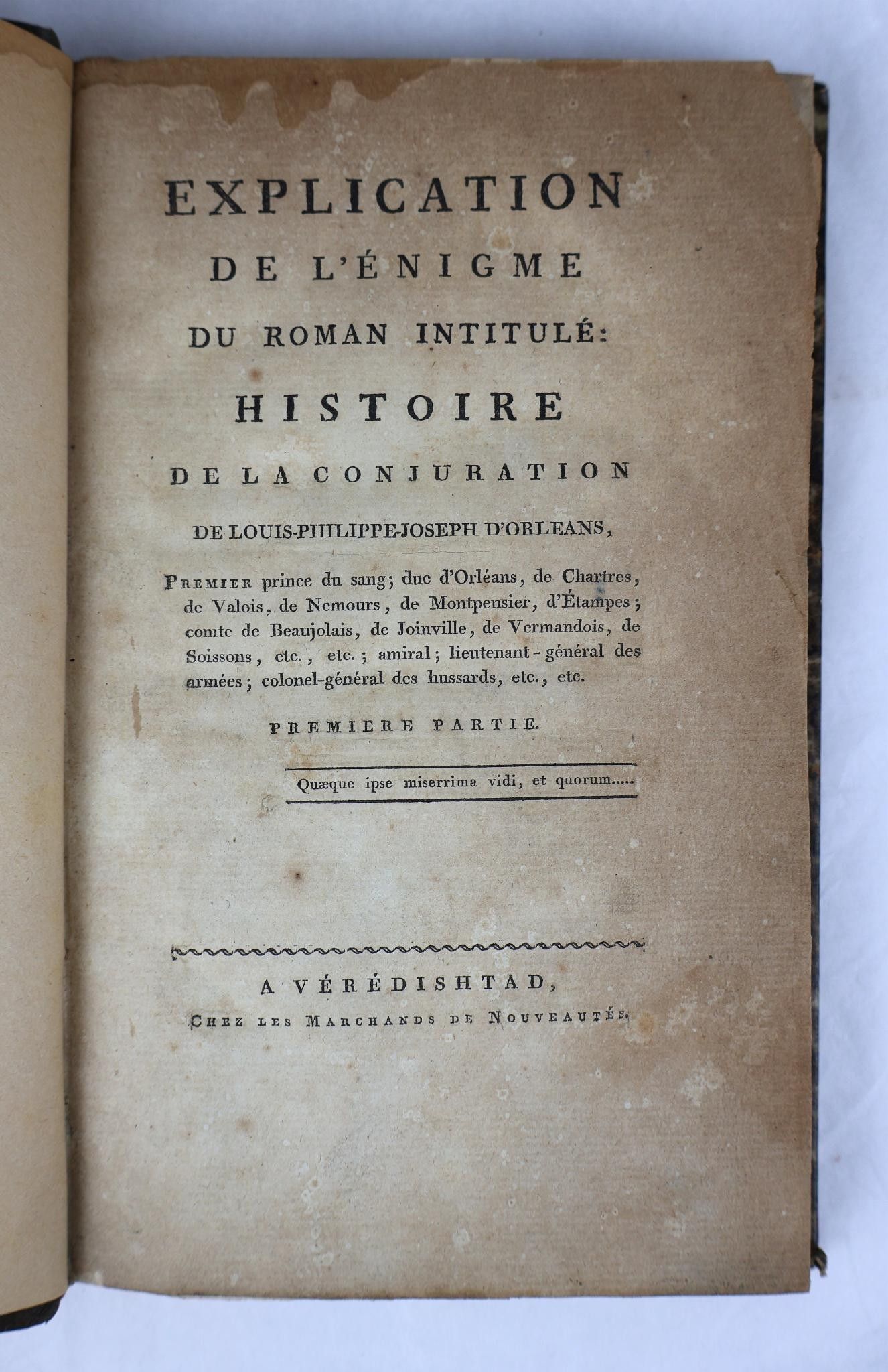 [ROUZET DE FOLMON (Jacques-Marie). Explanation of the enigma of the novel entitled: Histoire de la Conjuration de Louis-Philippe-Joseph d'Orléans [...]. Veredishtad, les Marchands de nouveautés, no date [ca. 1814]. 3 parts in 4 vol. in-8° of 220 pp ; viij, 296 pp. ;