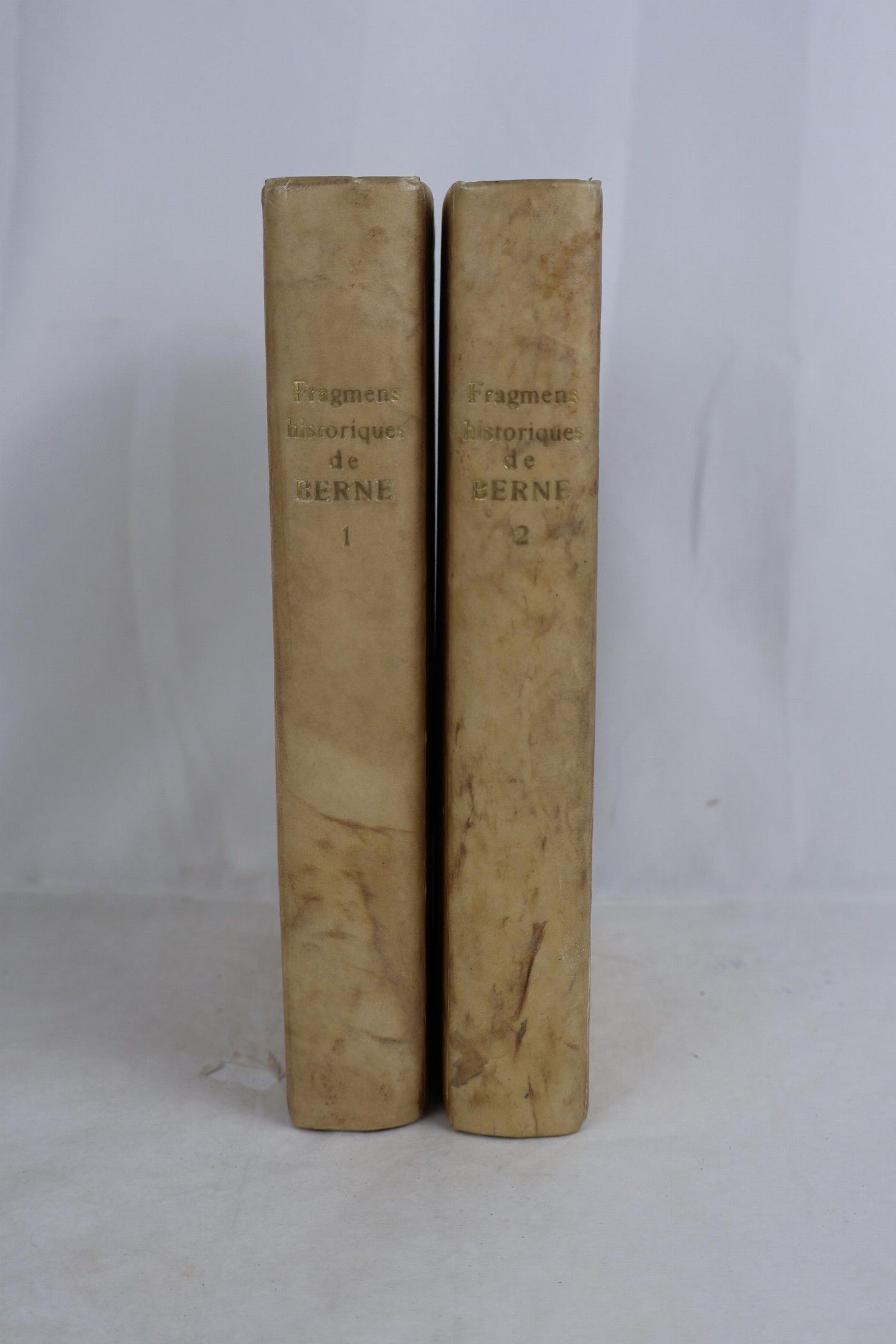 [GRUNER (Johann Rudolf). Fragmens historiques de la Ville & République de Berne. Neuchatel, Impr. des Edit. du Journ. Helvet, 1759. 2 vol. in-8° of 451 pp. ; 406, [10] pp. ivory vellum, long spine, gilt title and tom. (Modern binding).