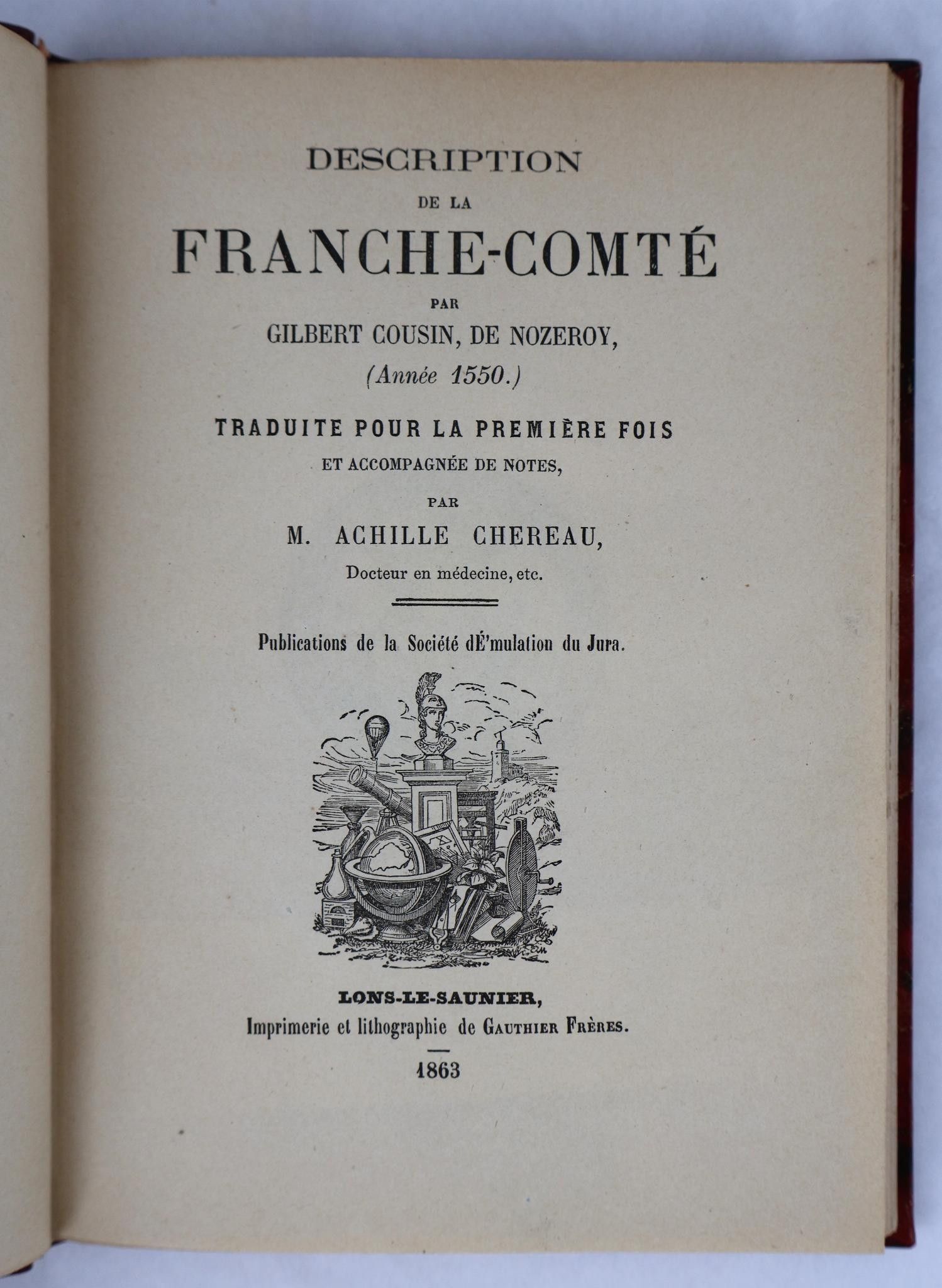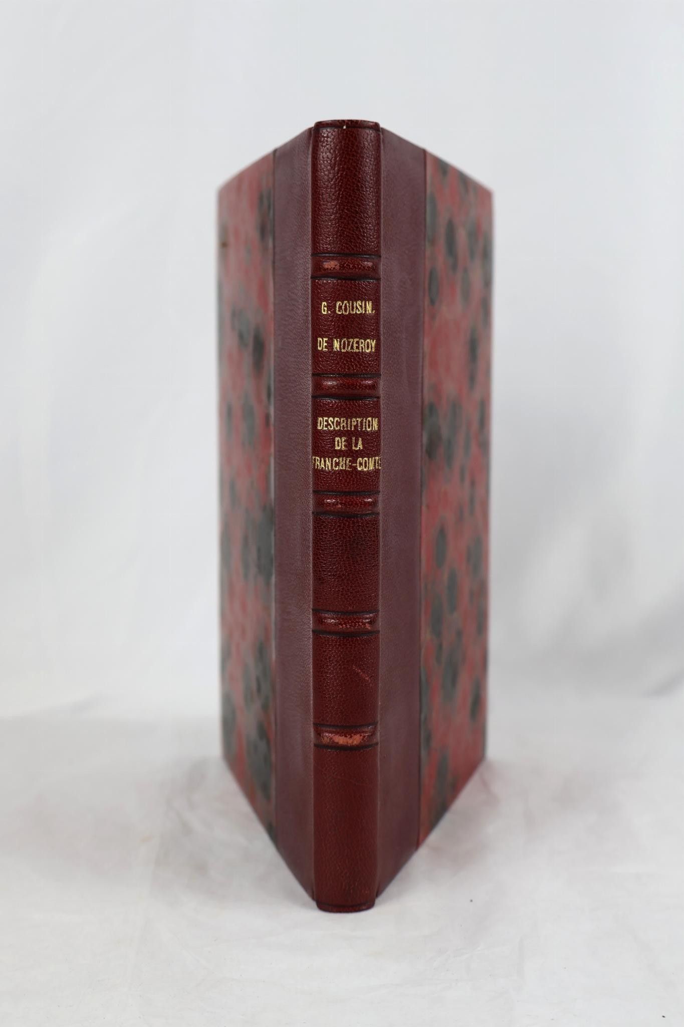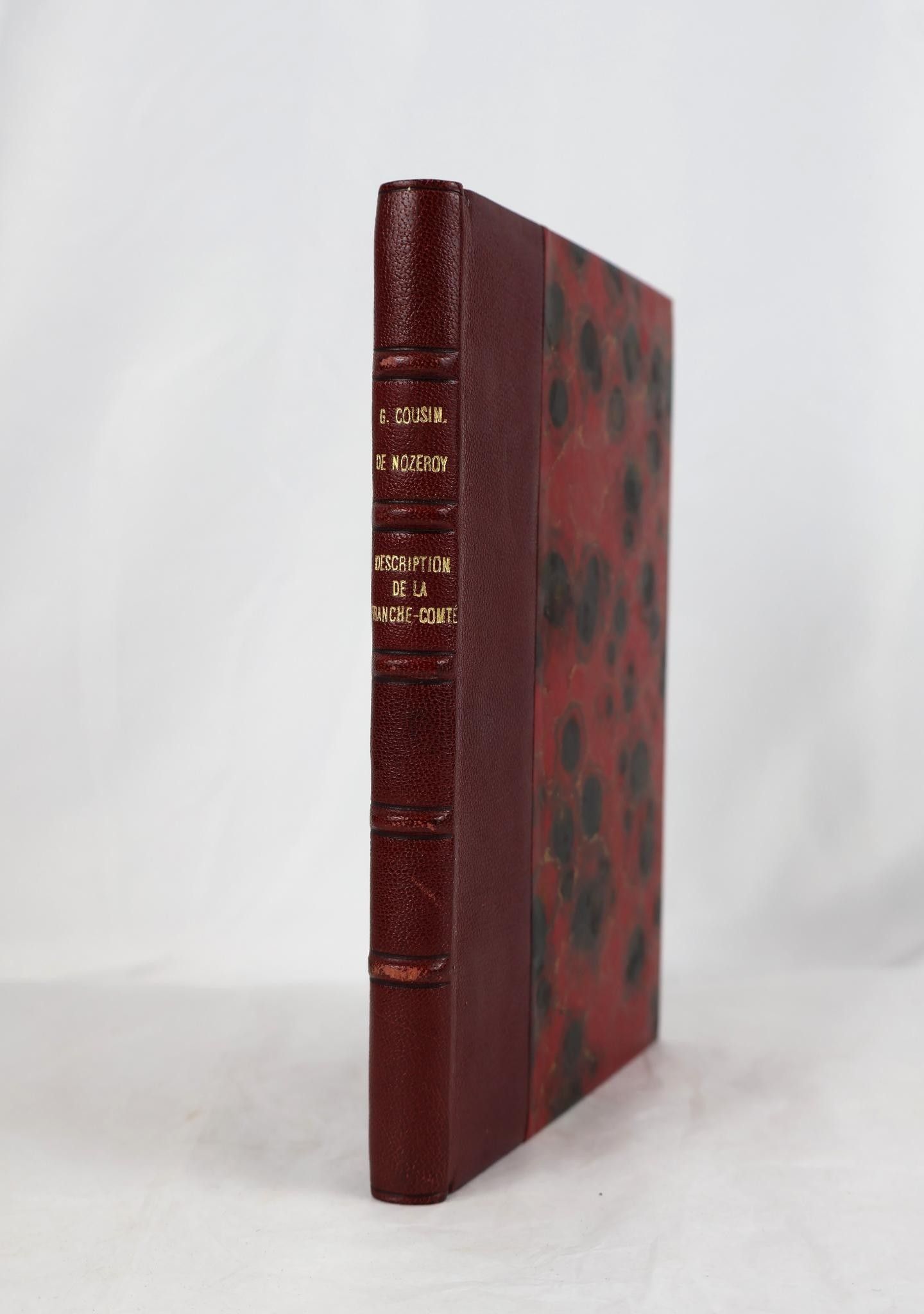 COUSIN DE NOZEROY (Gilbert). Description de la Franche-Comté [...] translated for the first time and accompanied by notes, by M. Achille Chéreau. Lons-le-Saunier, Gauthier Frères, 1863. In-8° of LXIII, 1 bl., 144 pp. 5 gr. in the text including 2 full page. Burgundy half-chagrin, spine with 5 raised bands, gilt title, covers cons.