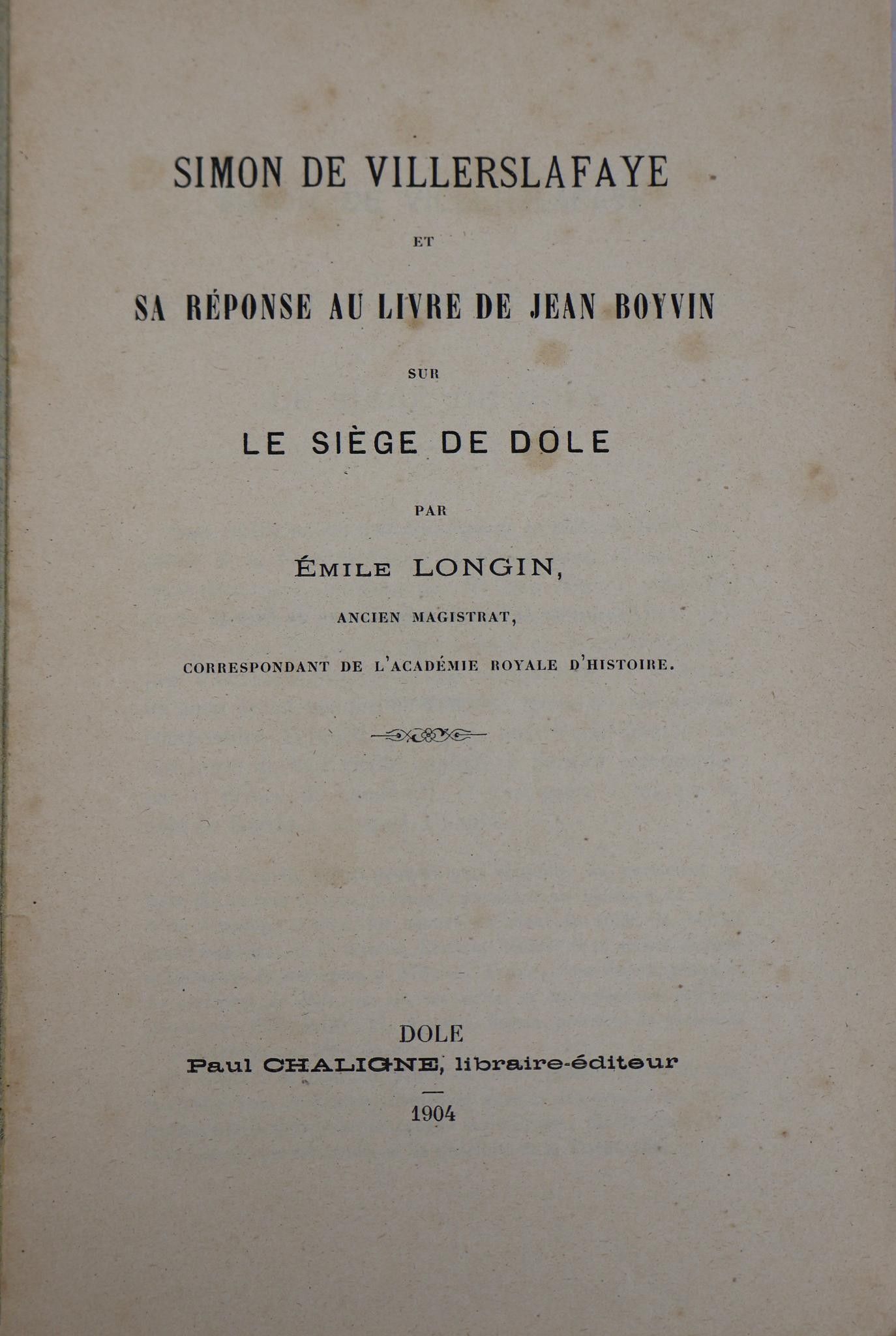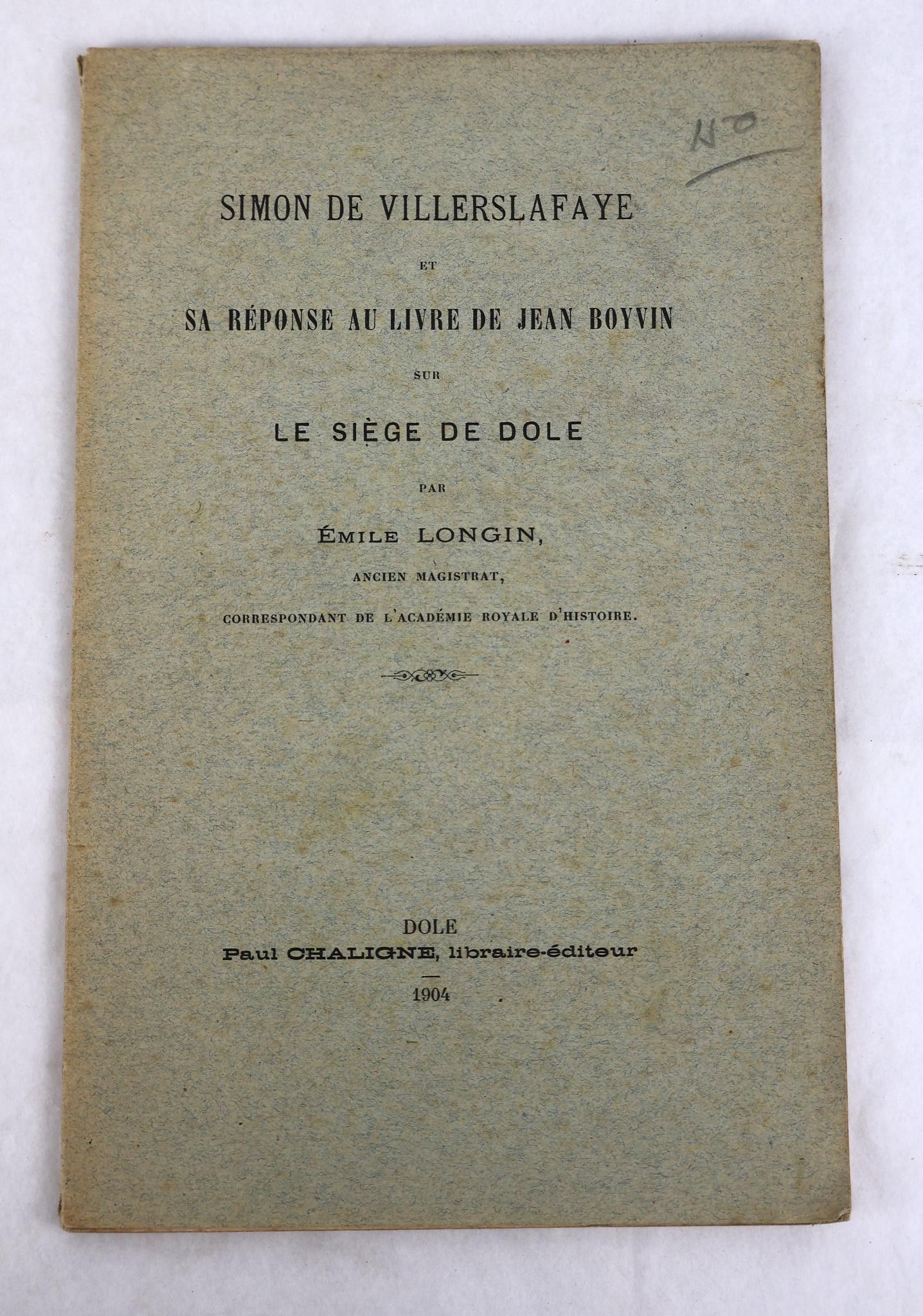 LONGIN (Emile). Simon de Villerslafaye et sa Réponse au livre de Jean Boyvin sur le siège de Dole. Dole, Paul Chaligne, 1904. In-8° of 58 pp. Paperback.