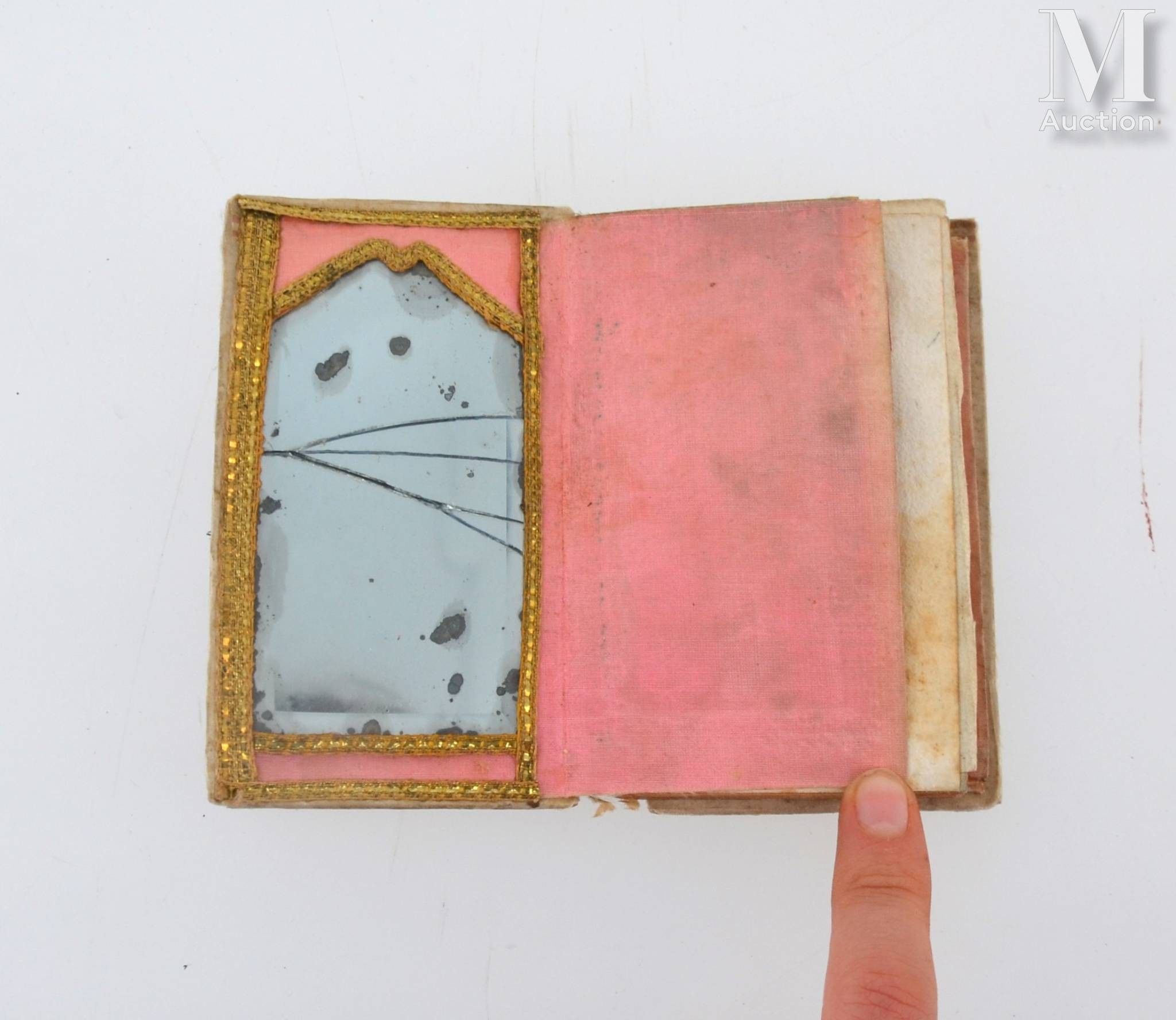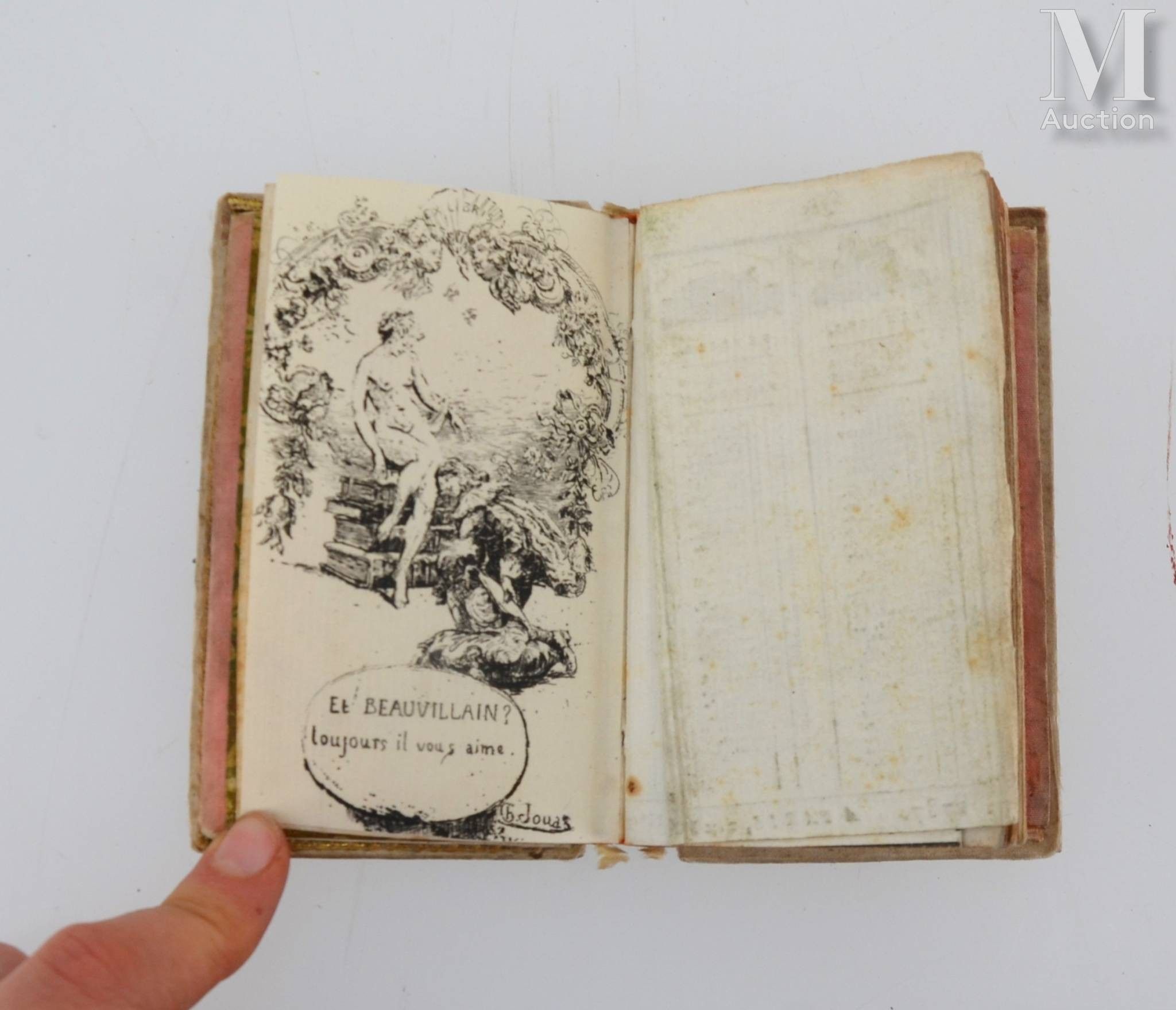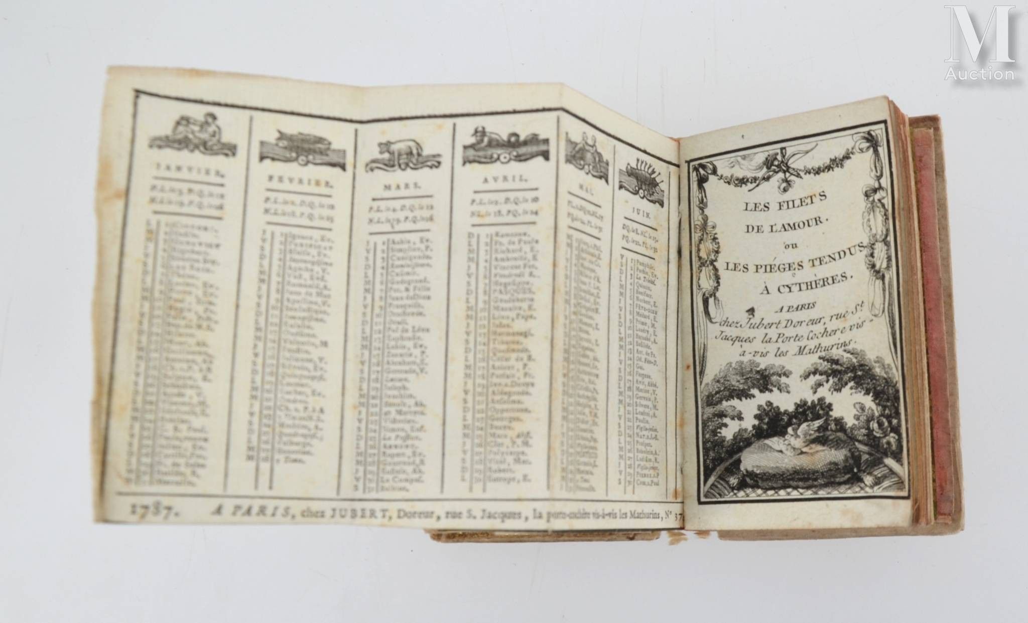Les Filets de l'amour ou Les Pièges tendus à Cythère. Paris, Jubert, s.d. In-12, raw silk, thread decoration with sequins, gouache under glass with gilt metal frame, mirror (broken), pink moire lining, inner gusset, calendar on both sides (Period binding).