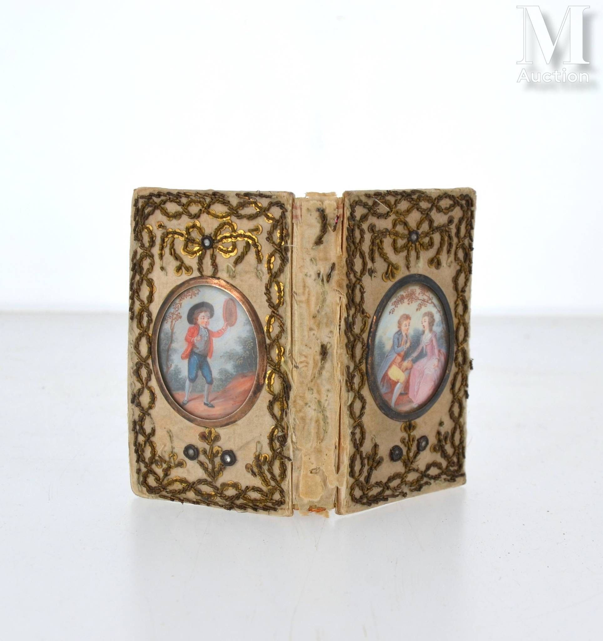 Binding embroidered with gold thread and decorated with 2 fine original gouaches.