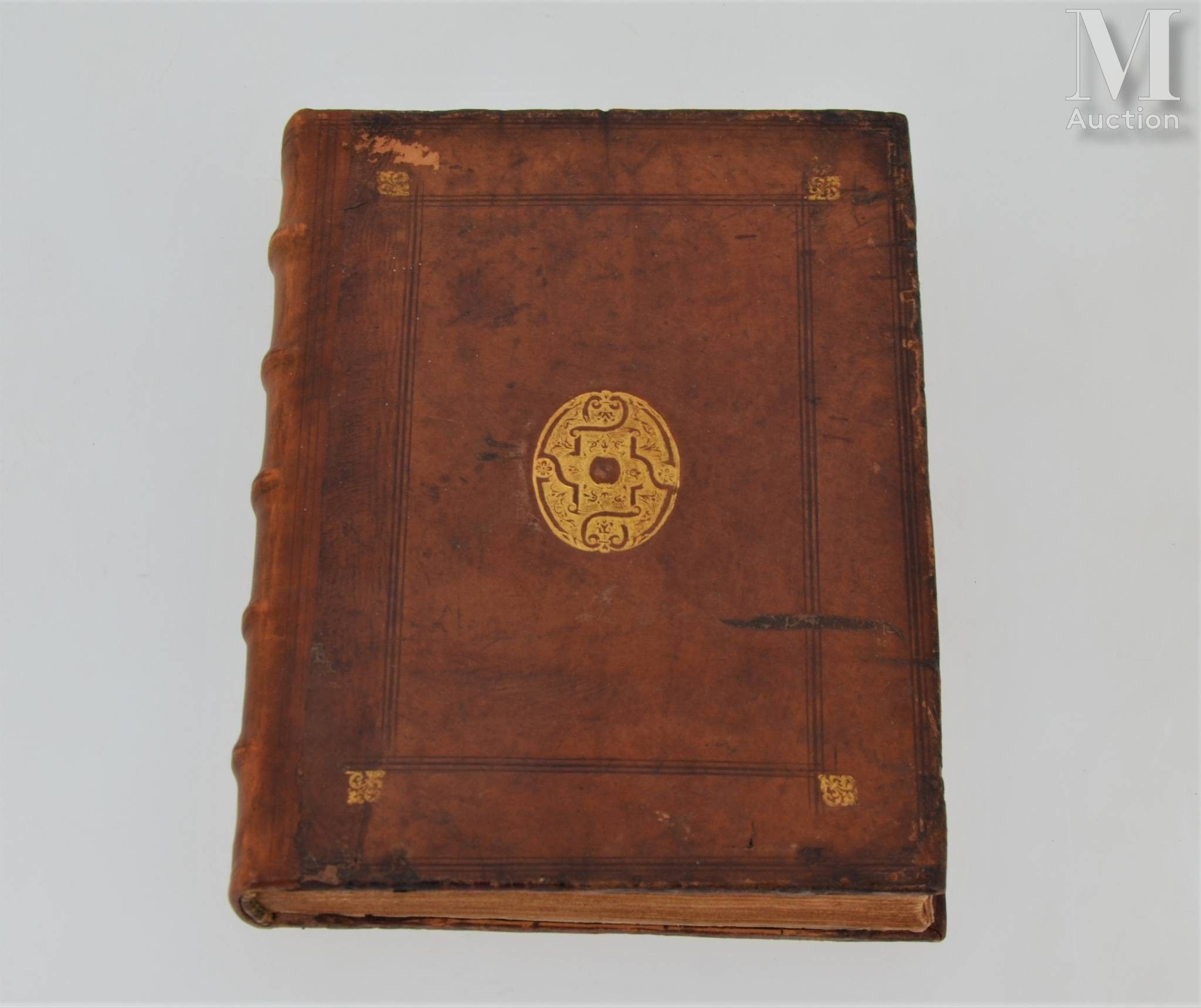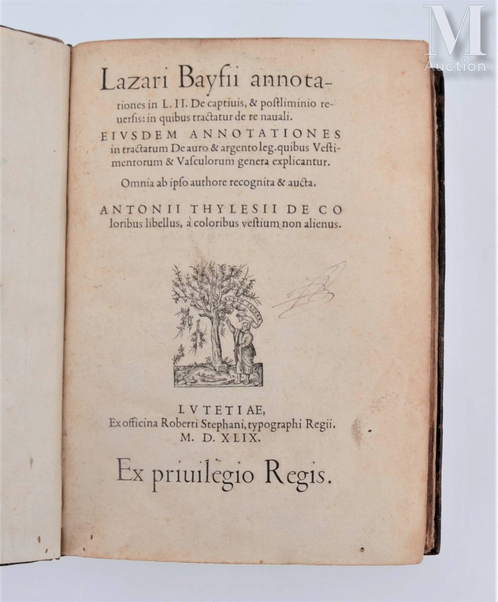 Annotationes in L.II. De captivis... de Re navali... De auro & argento leg. quibus Vestimentorum & Vasculorum. Paris, Robert Estienne, 1549. 2 parts in one volume in-4, fawn calf, double framed with three cold fillets, small gilt fleuron at the corners, medallion in the centre decorated with interlacing on an azure background, spine decorated (Binding of the period).