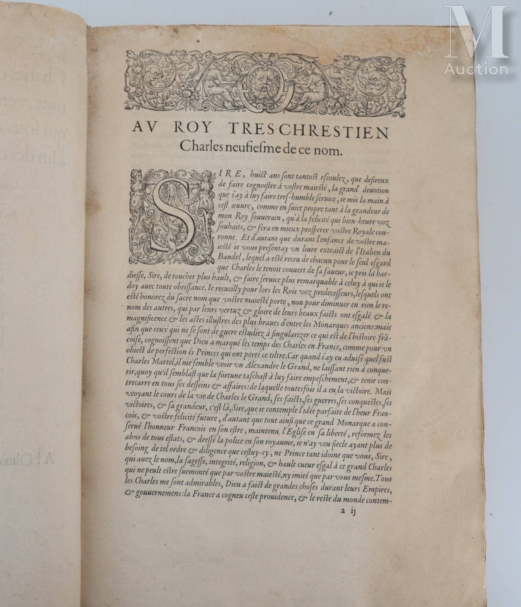 L'Histoire des neuf roys Charles de France: contenant la fortune, vertu, & heur fatal des Roys, qui sous ce nom de Charles ont mis à fin des choses merveilleuses. Paris, Pierre L'Huillier, 1570, folio, calf turned over, cold fillet, fleuron with arabesque motifs in the centre (17th century binding).