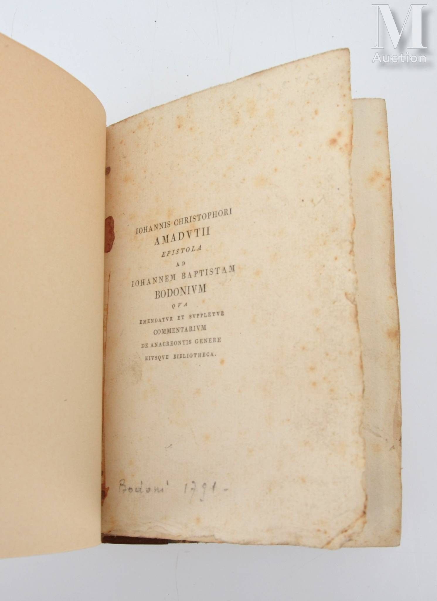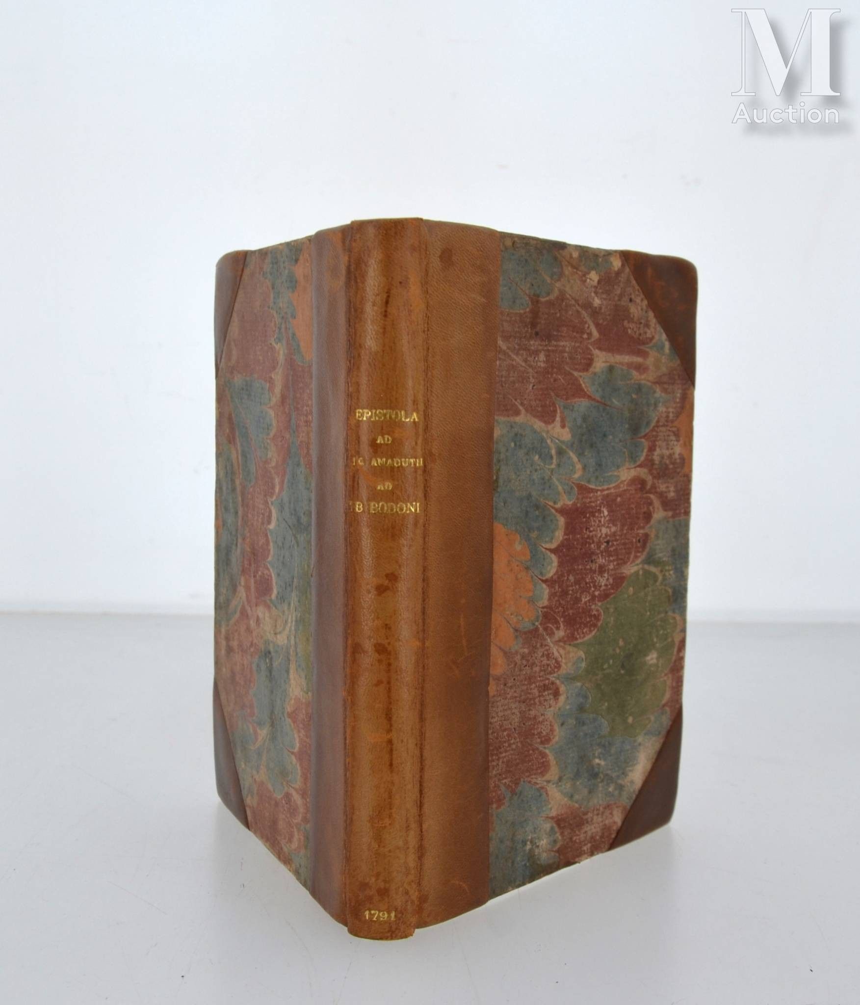 AMADUZZI (Giovanni Cristofano). Epistola ad Johannem Baptistam Bodonium [...]. Parma, Bodoni, 1791. In-12, half calf with corners (Modern binding).