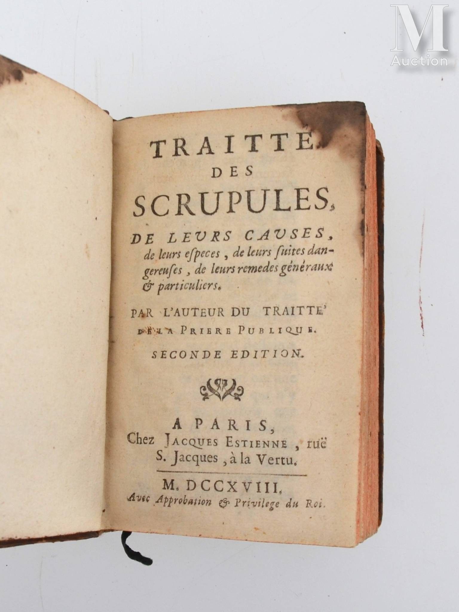 Traité des scrupules, de leurs causes, de leurs espèces, de leurs suites dangereuses, de leurs remèdes généraux & particuliers. Paris, Jacques Estienne, 1718. In-12, brown calf, spine decorated, red edges (Binding of the period).
