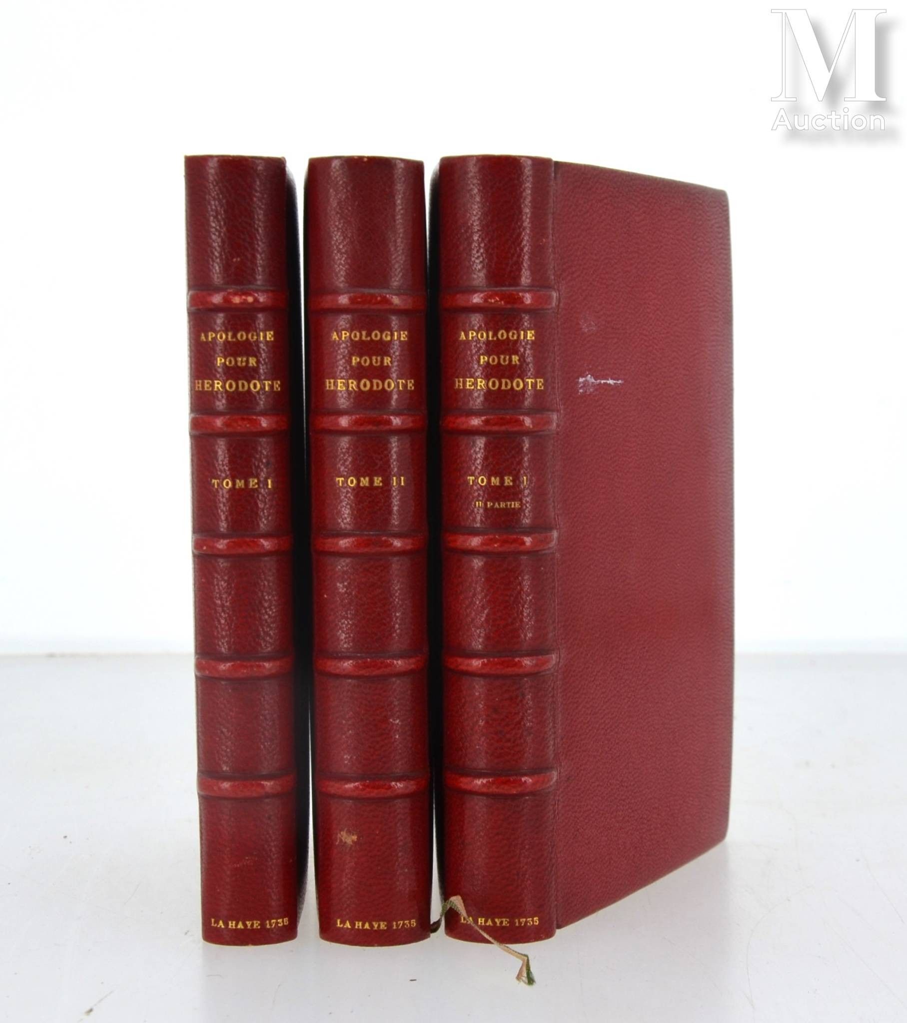 Apology for Herodotus. Or Traité de la conformité des merveilles anciennes avec les modernes. La Haye, Henri Scheurleer, 1735. 2 volumes in 3 volumes in-12, red jansenist morocco, inner lace, blue morocco lining, double endpapers, gilt edges, untrimmed (Cuzin - Marius Michel doreur).