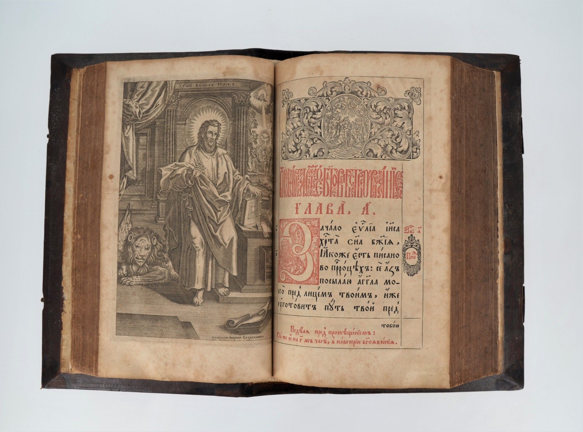Holy Gospel in Slavonic (?). S.l.n.d. [late 16th century?] In-folio, cold-stamped brown calf, gilt and chased edges (Binding circa 1600).