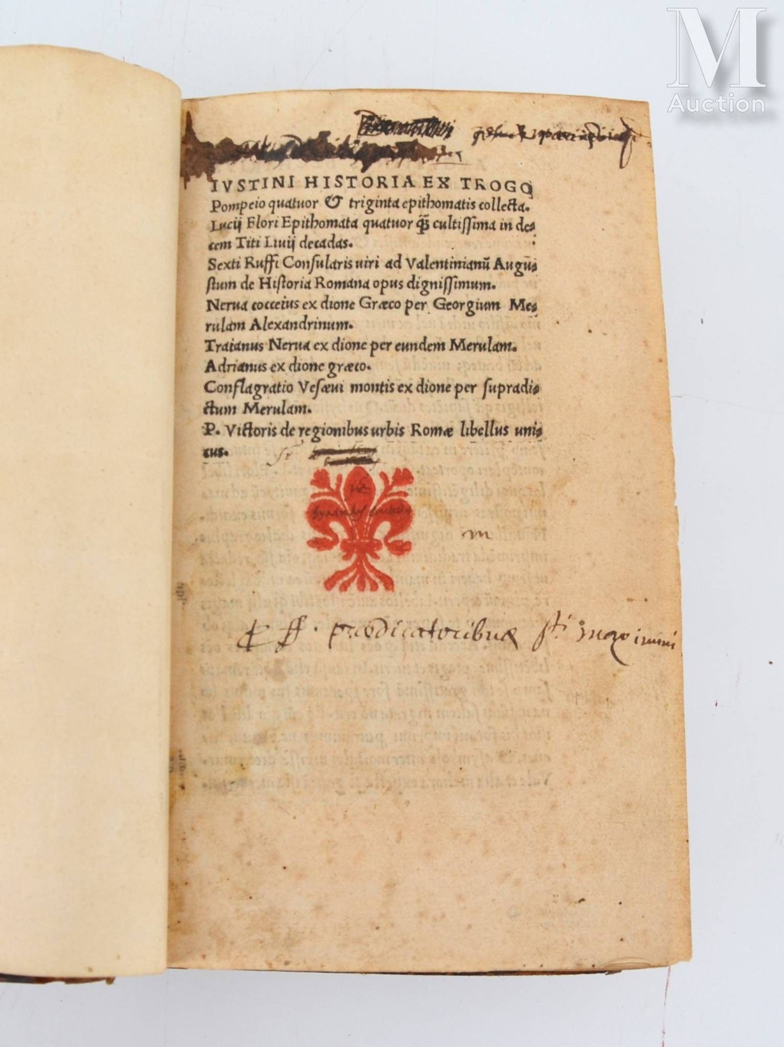Historia ex Trogo quator & trigina epithomatis collecta. Lyon, s.n. [Giunta?], 1519. In-8, brown calf on aisle, cold decoration on boards, remains of clasp (Period binding).