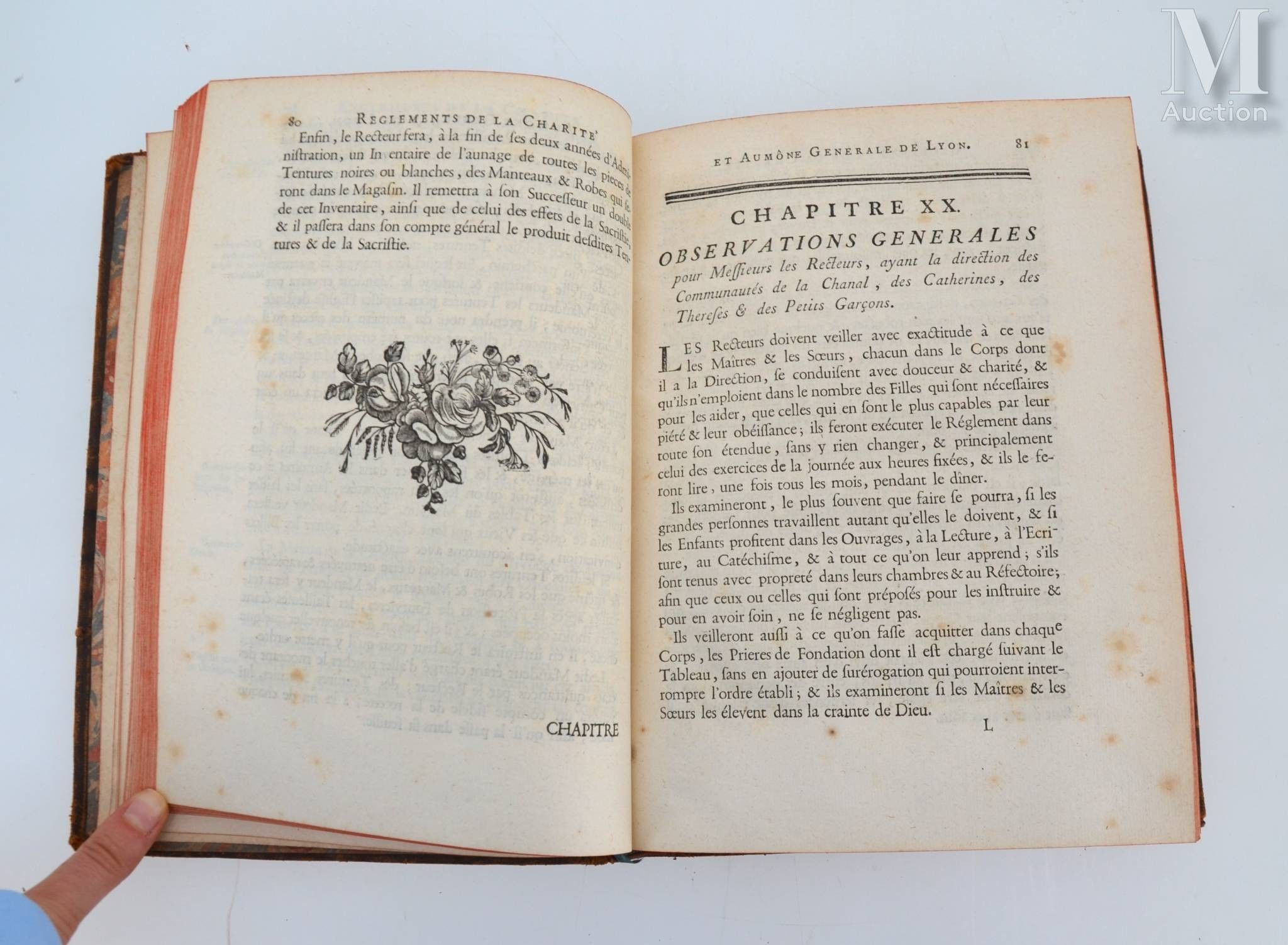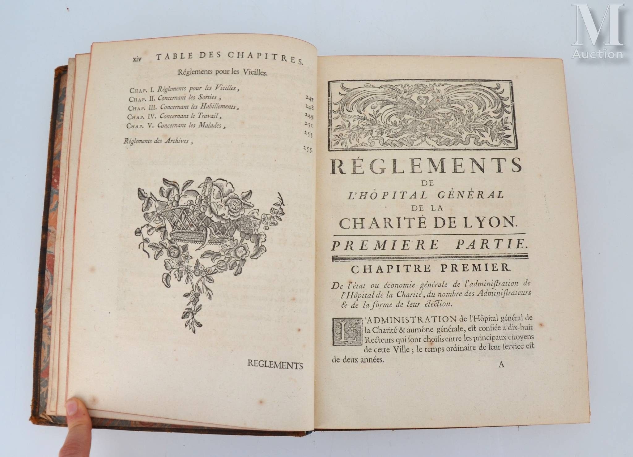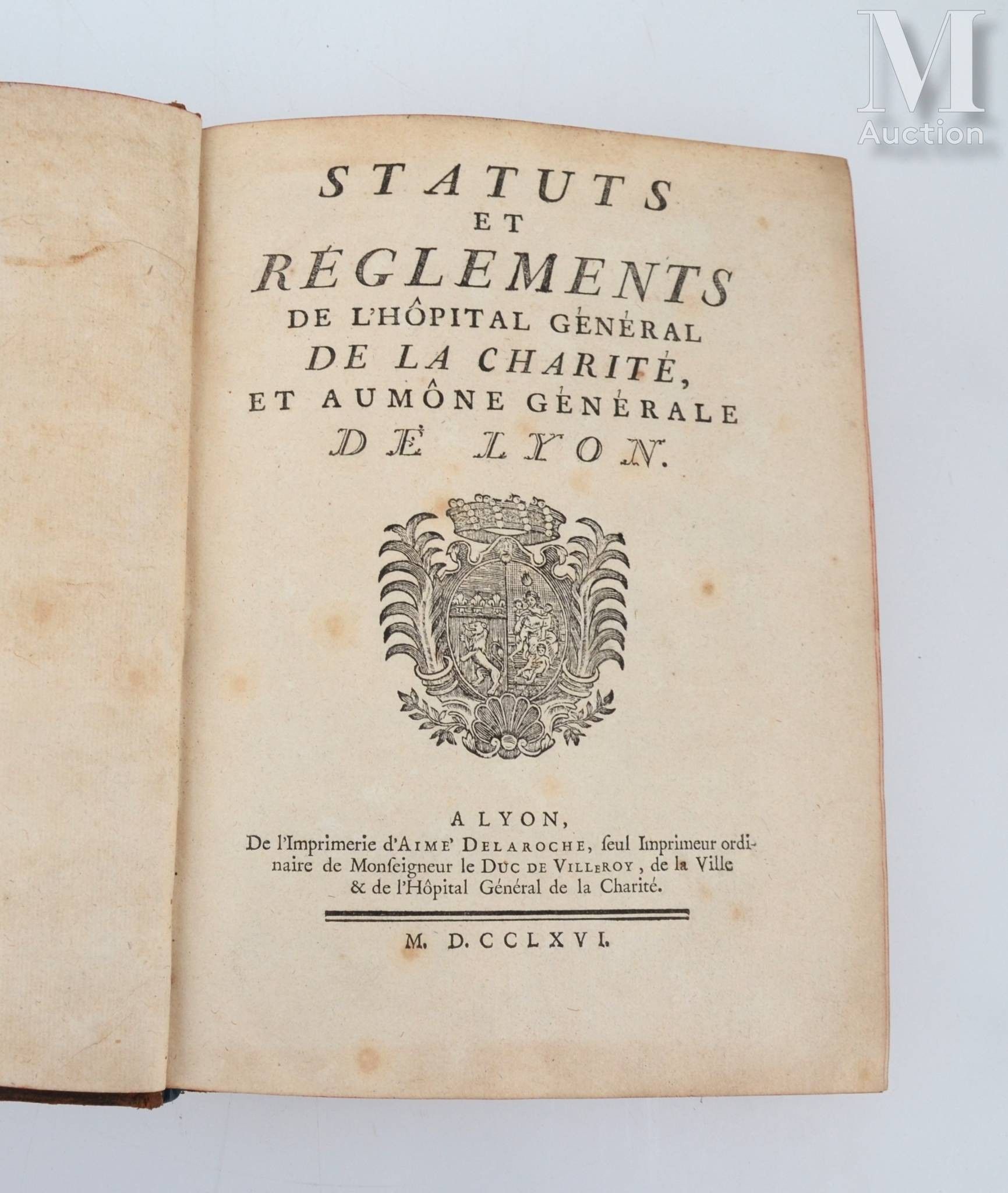 Statutes and regulations of the Hôpital Général de la Charité, et aumône générale de Lyon. Lyon, Aimé Delaroche, 1766. In-4, marbled basane, spine decorated, red edges (Binding of the period).