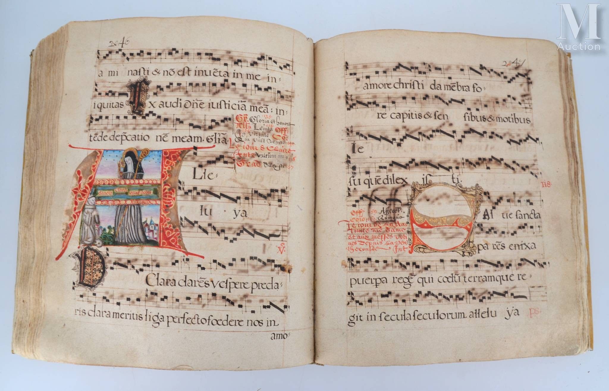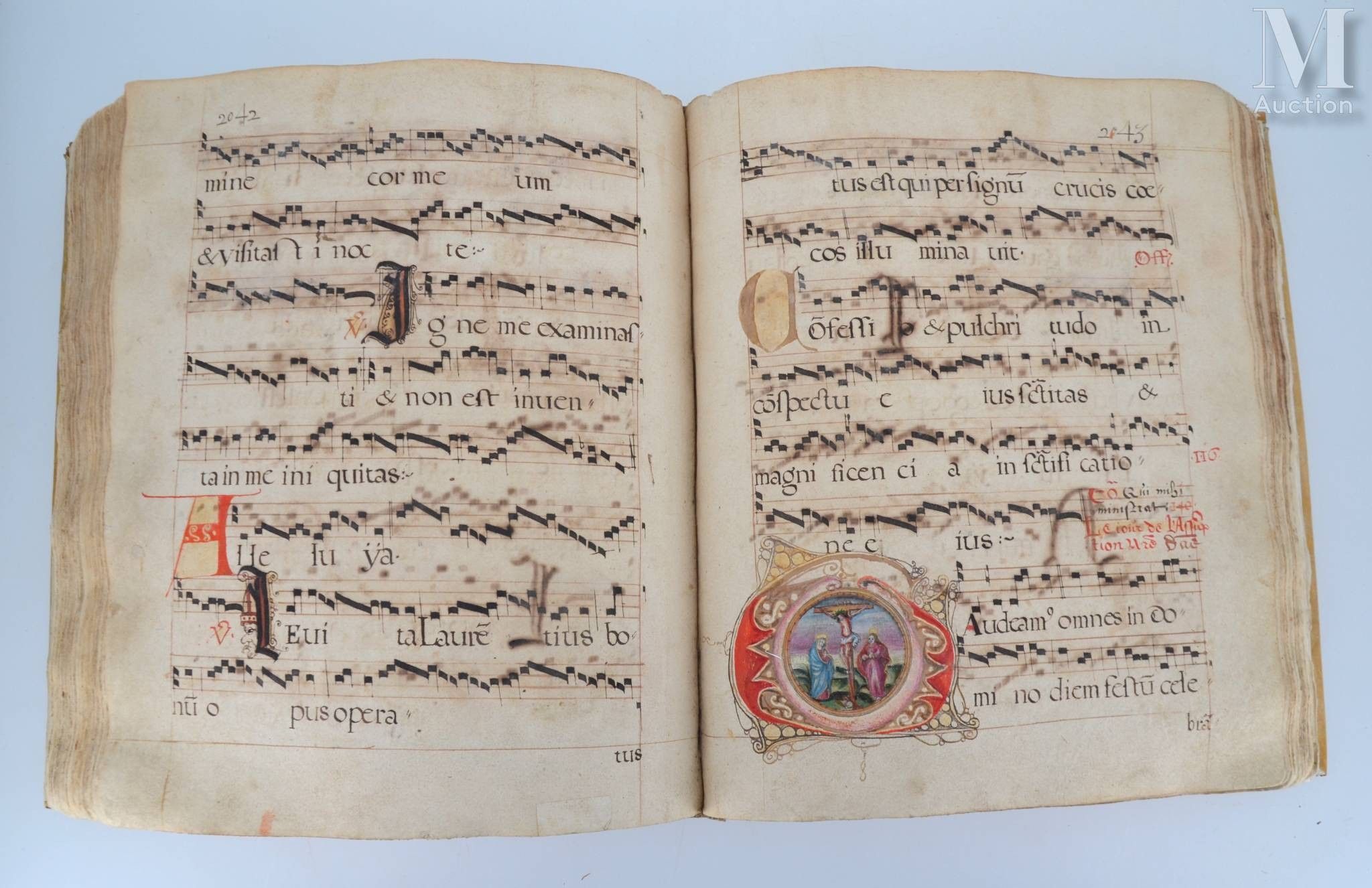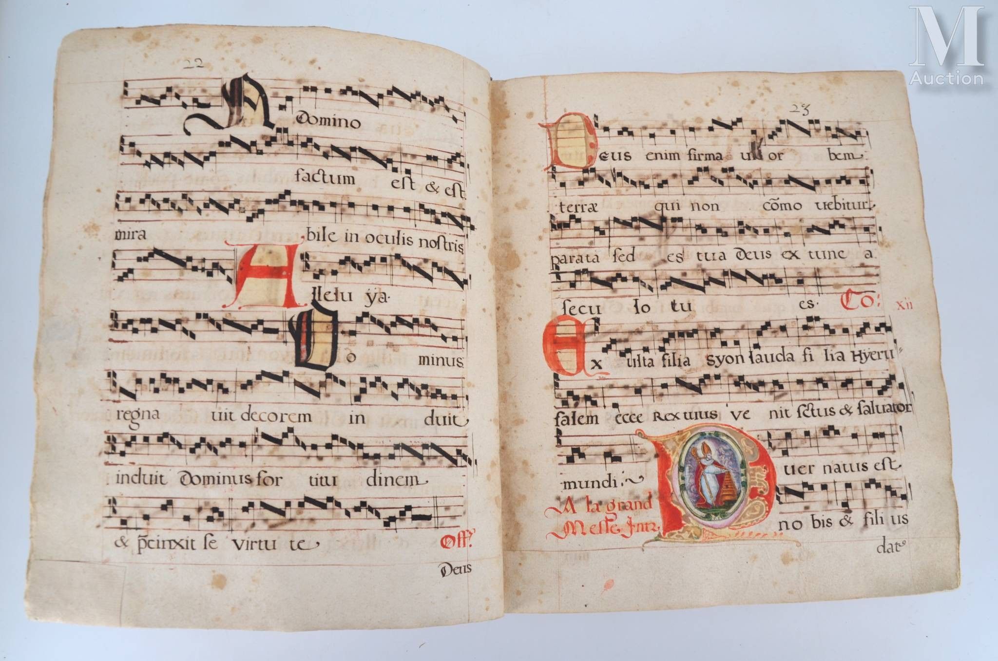Charming handwritten antiphonary decorated with a dozen historiated initials painted in colour and numerous initials in black and red with filigree decoration and grotesques.