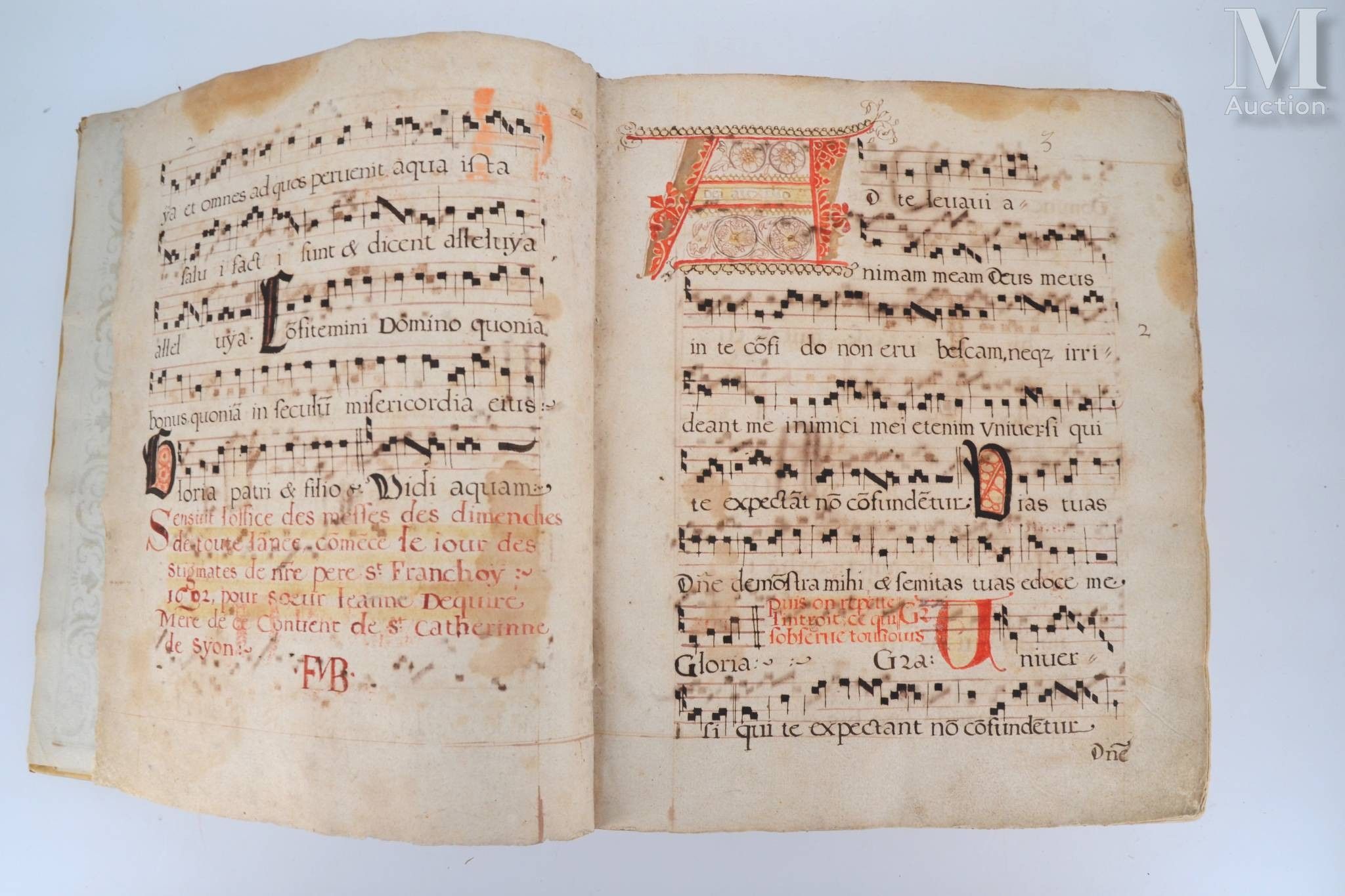 Antiphonary. [Verso of the second leaf: Sensuit l'office des masses des dimenches [sic] de toute l'année commencée le jour des Stigmates de Notre Père St Franchoy [sic] 1602 pour sœur Jeanne Dequire Mère de ce Contient de Ste Catherine de Syon]. Manuscript in-4 of approximately 150 leaves, contemporary vellum.