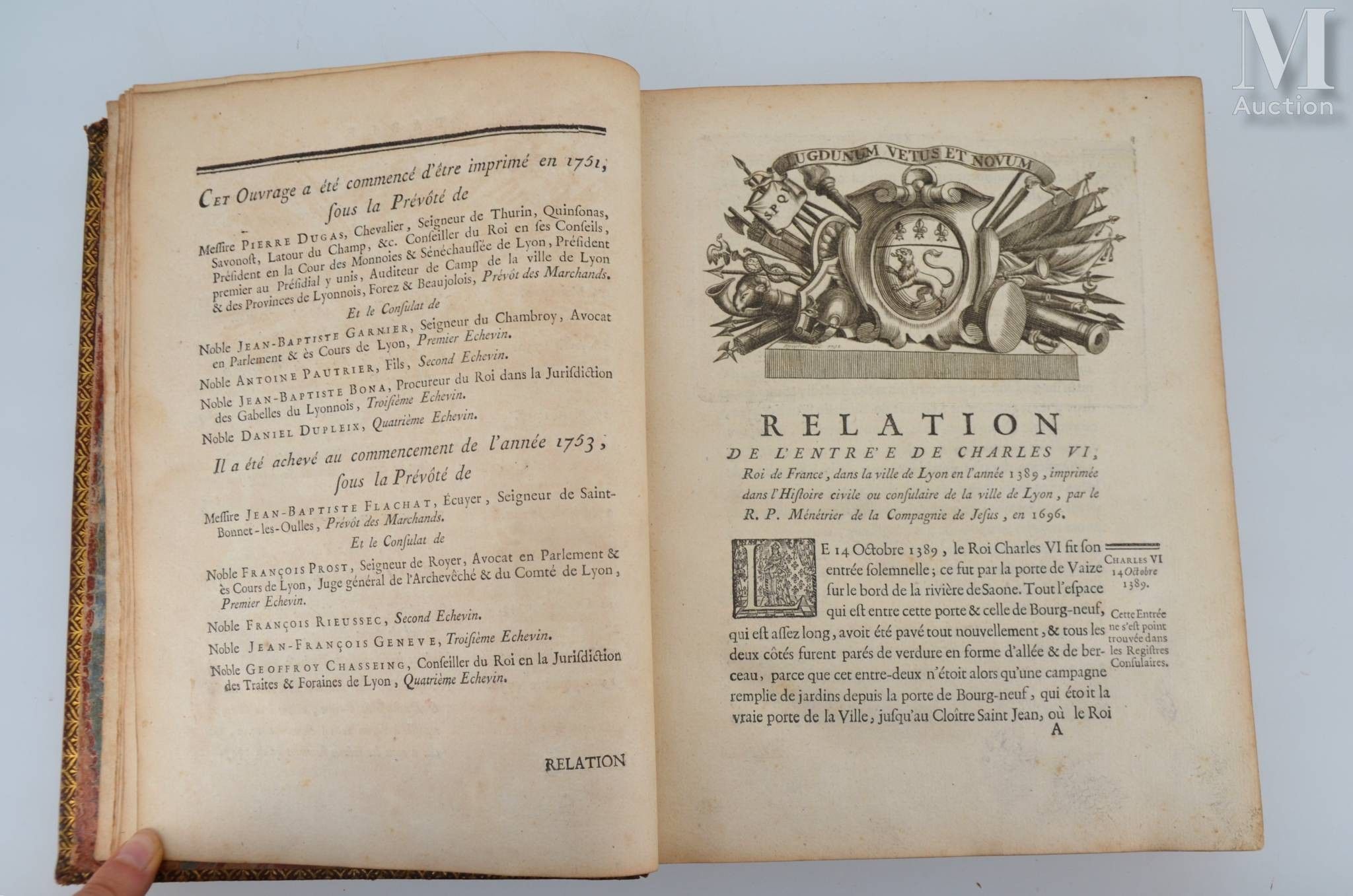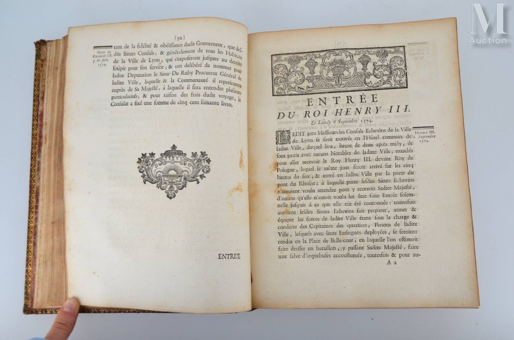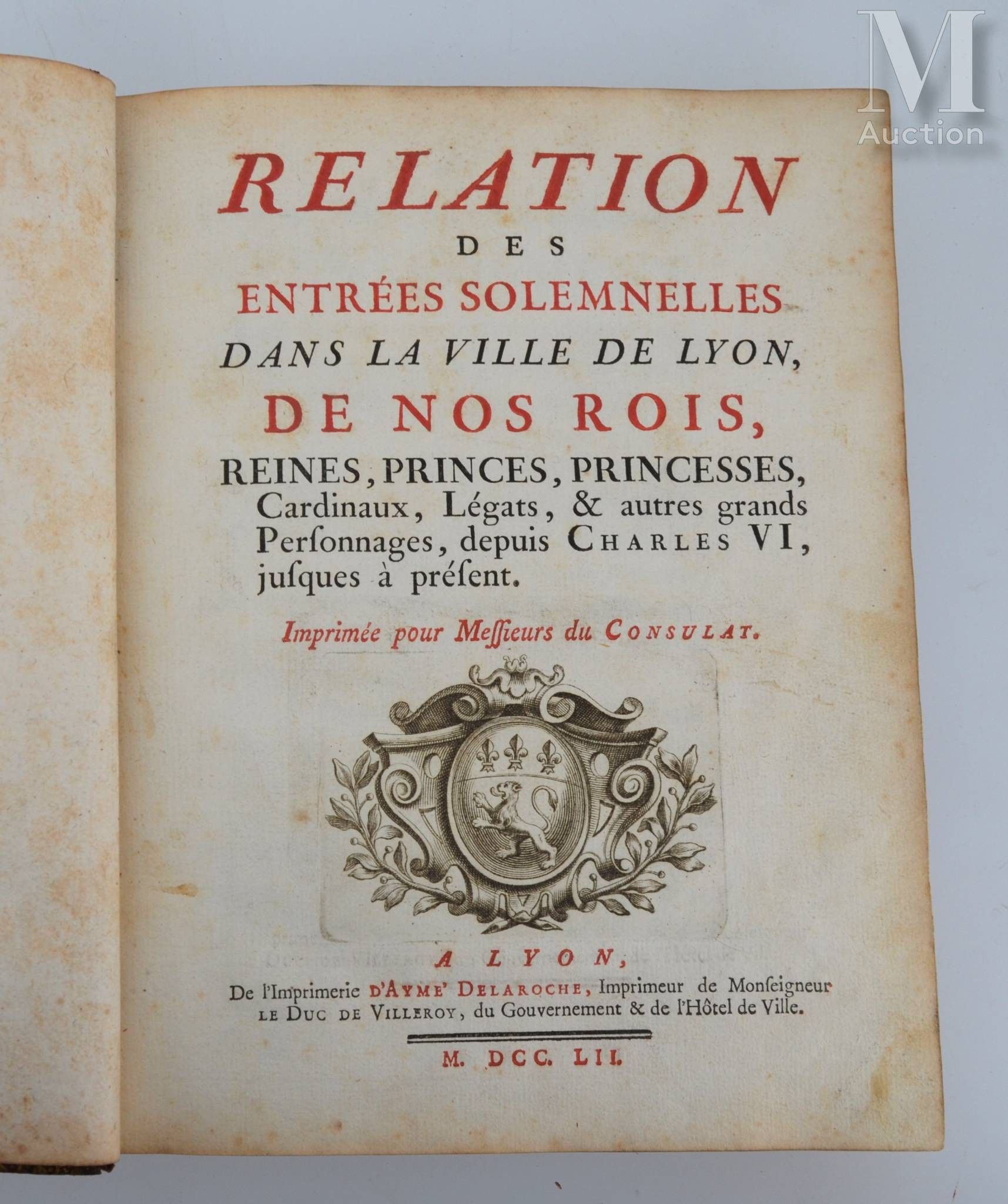 dans la ville de Lyon de nos rois, reines, princes, princesses, cardinals, legates & autres grands personnages depuis Charles VI jusqu'à présent. Lyon, Aymé Delaroche, 1752. In-4, red morocco, gilt lace, ornate spine, inner lace, gilt edges (publisher's binding).