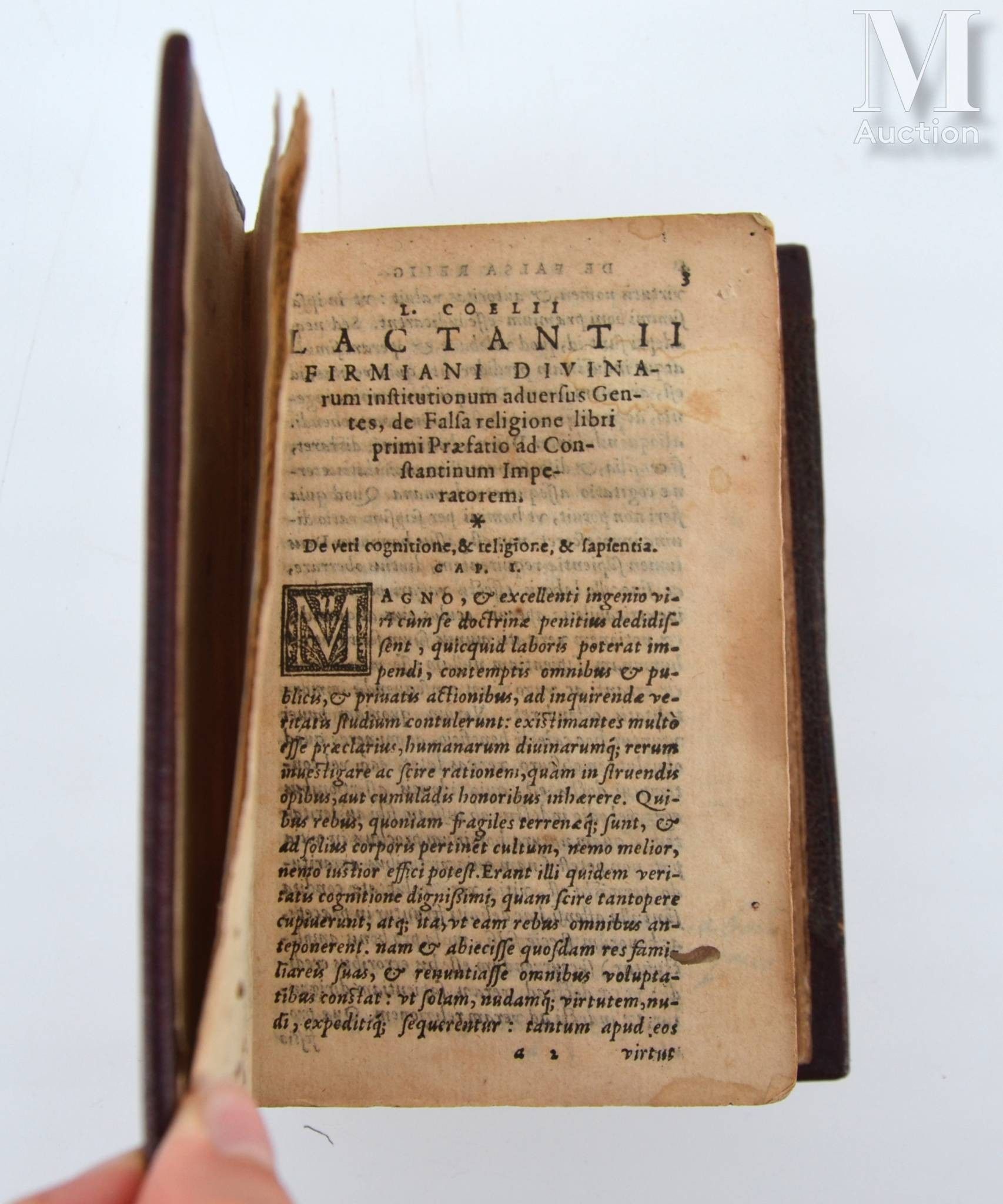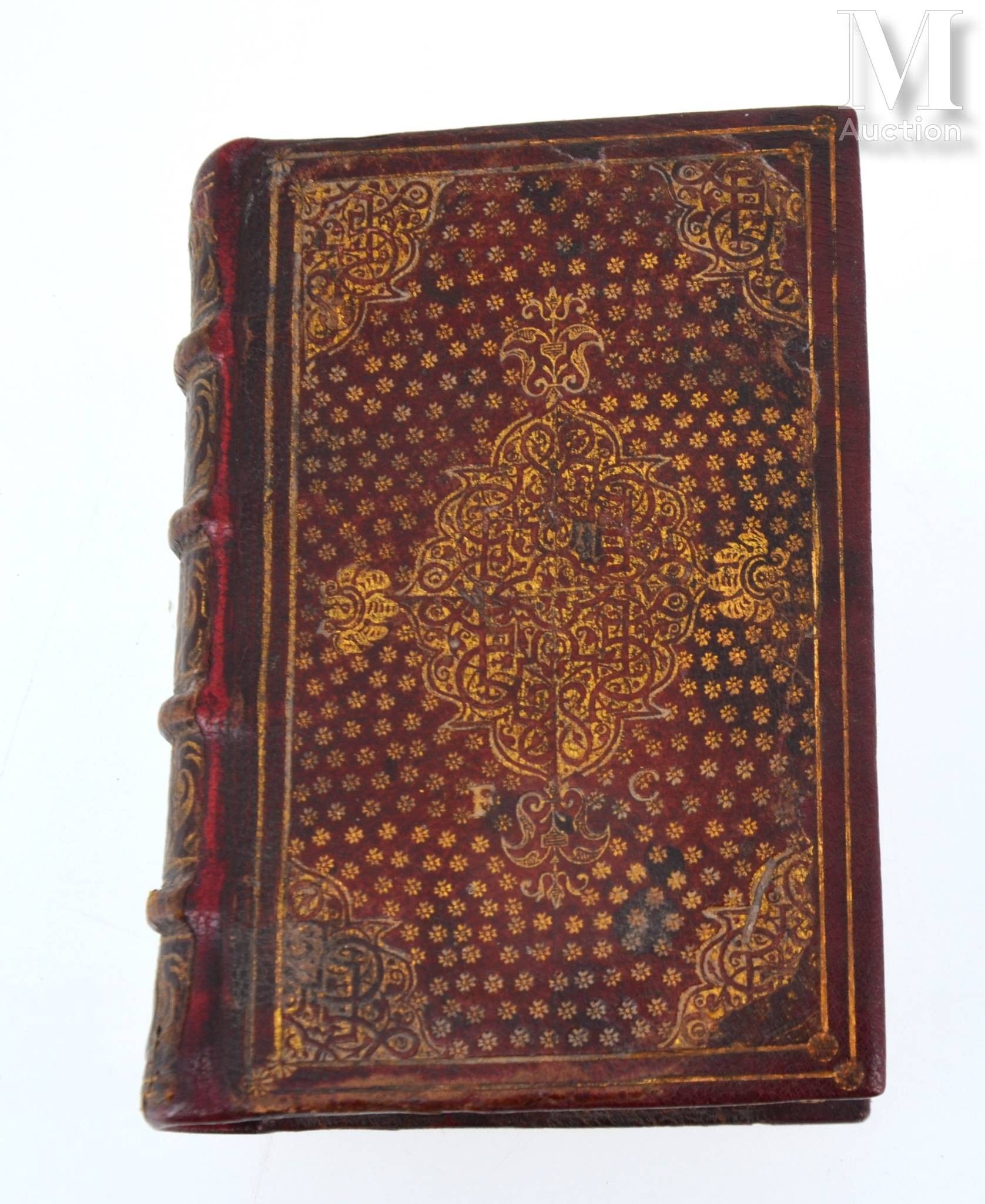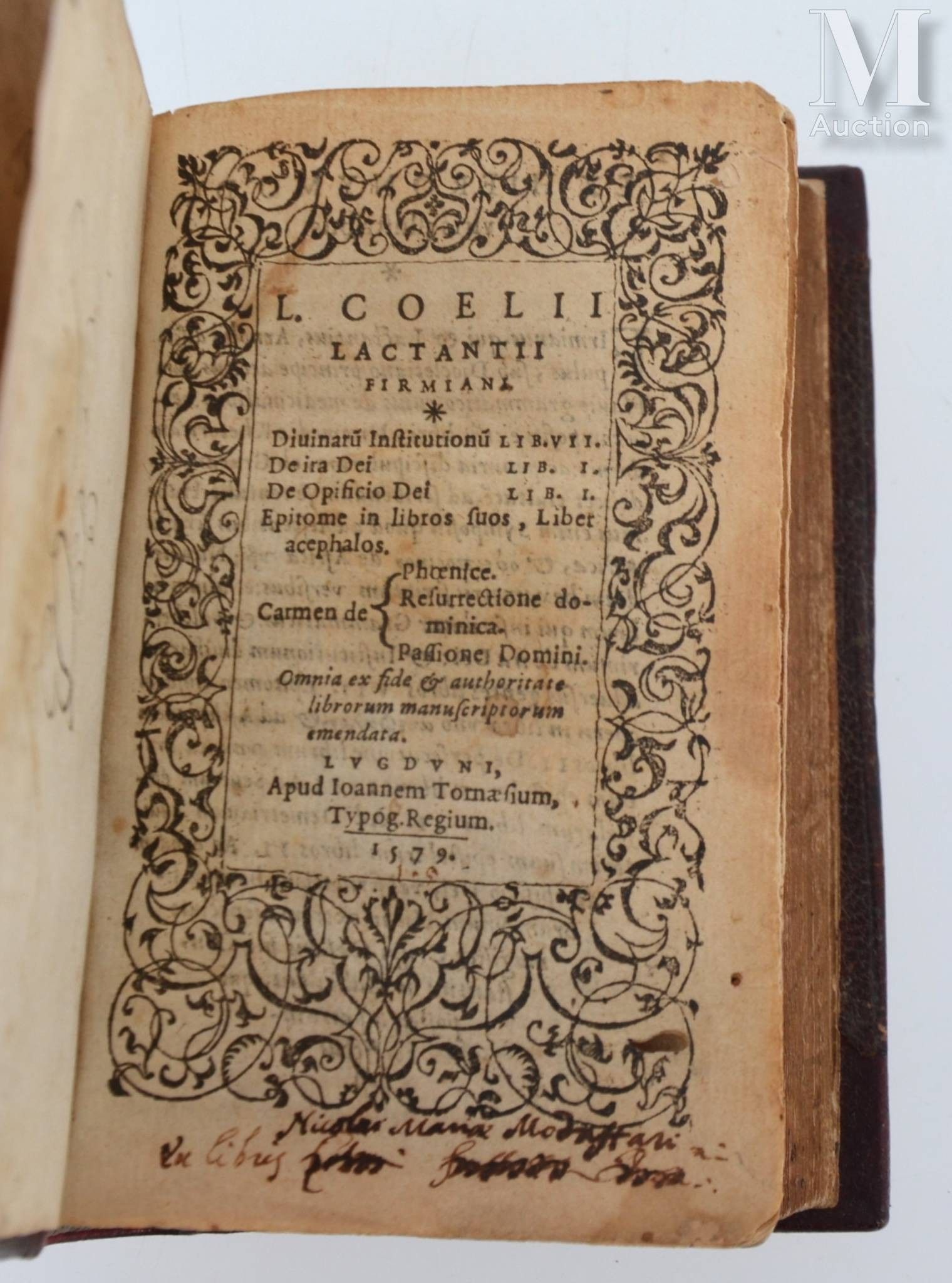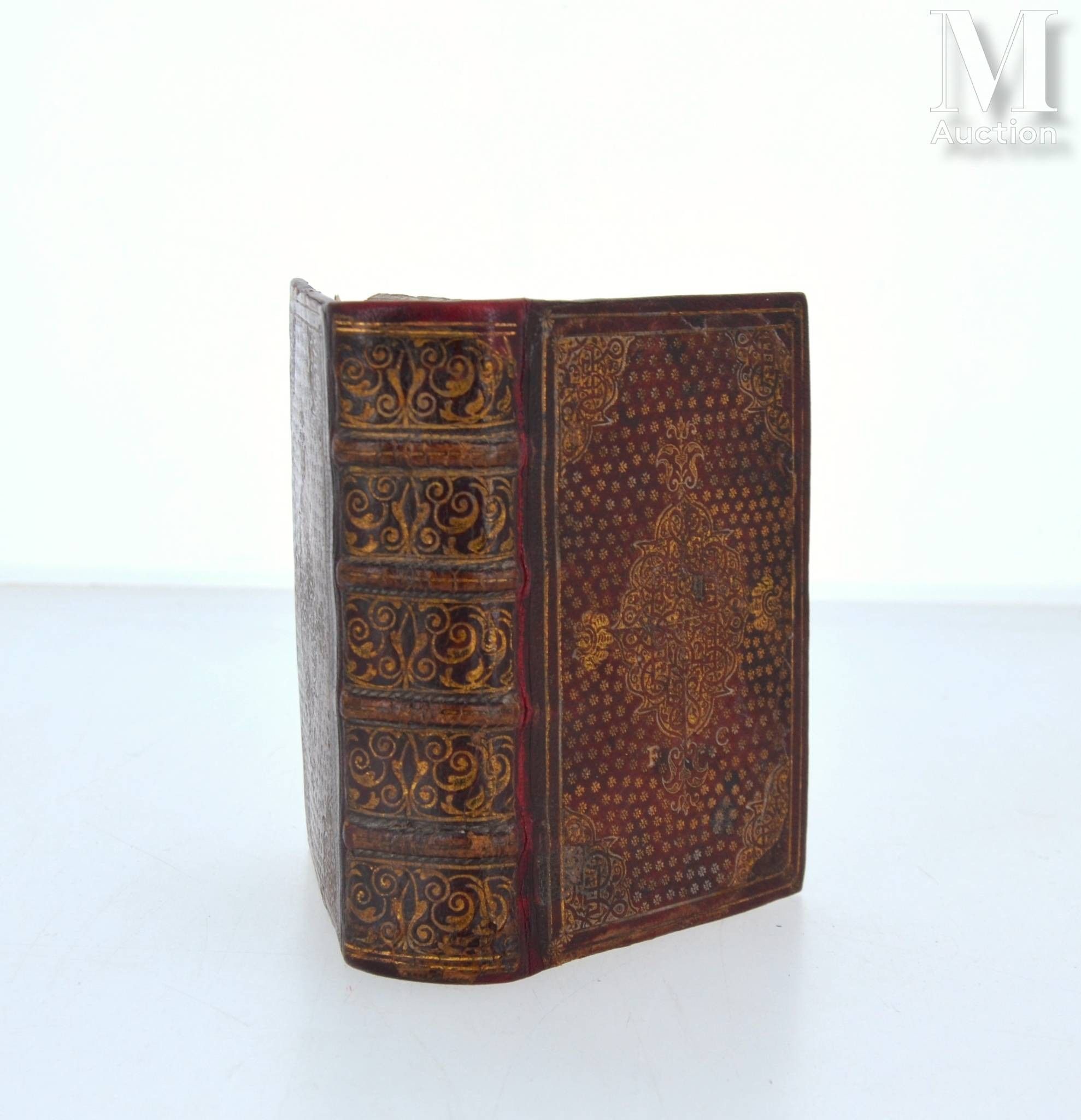 LACTANCE. Divinarum institutionum, liber VII. Lyon, Jean de Tournes, 1579. In-16, red morocco, plate and spandrels, strewn with flowers, spine decorated, gilt and chased edges (Binding of the period).