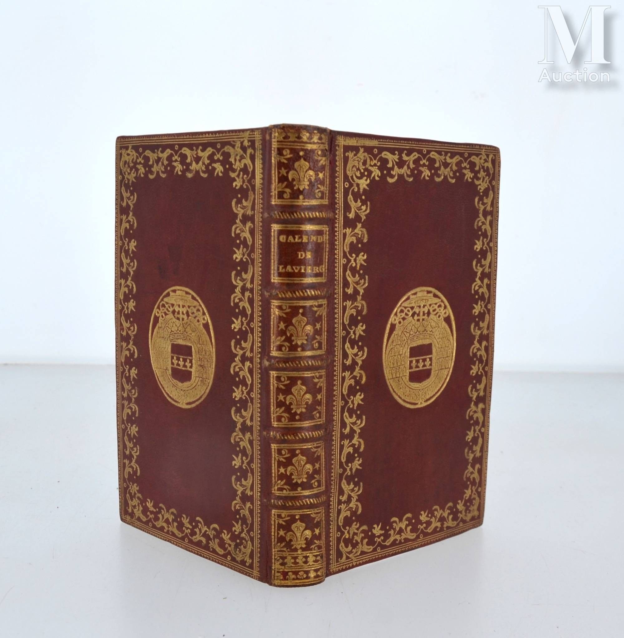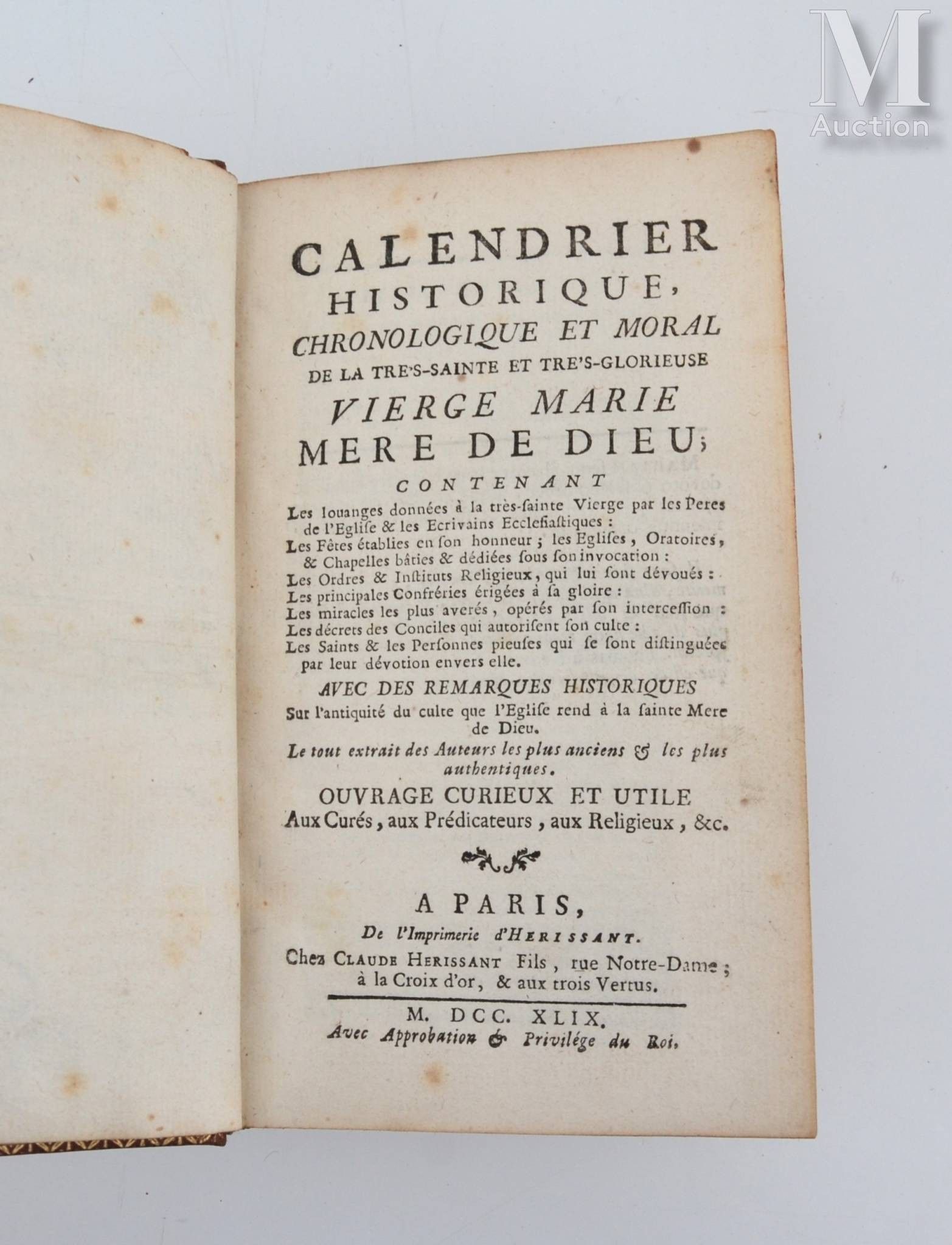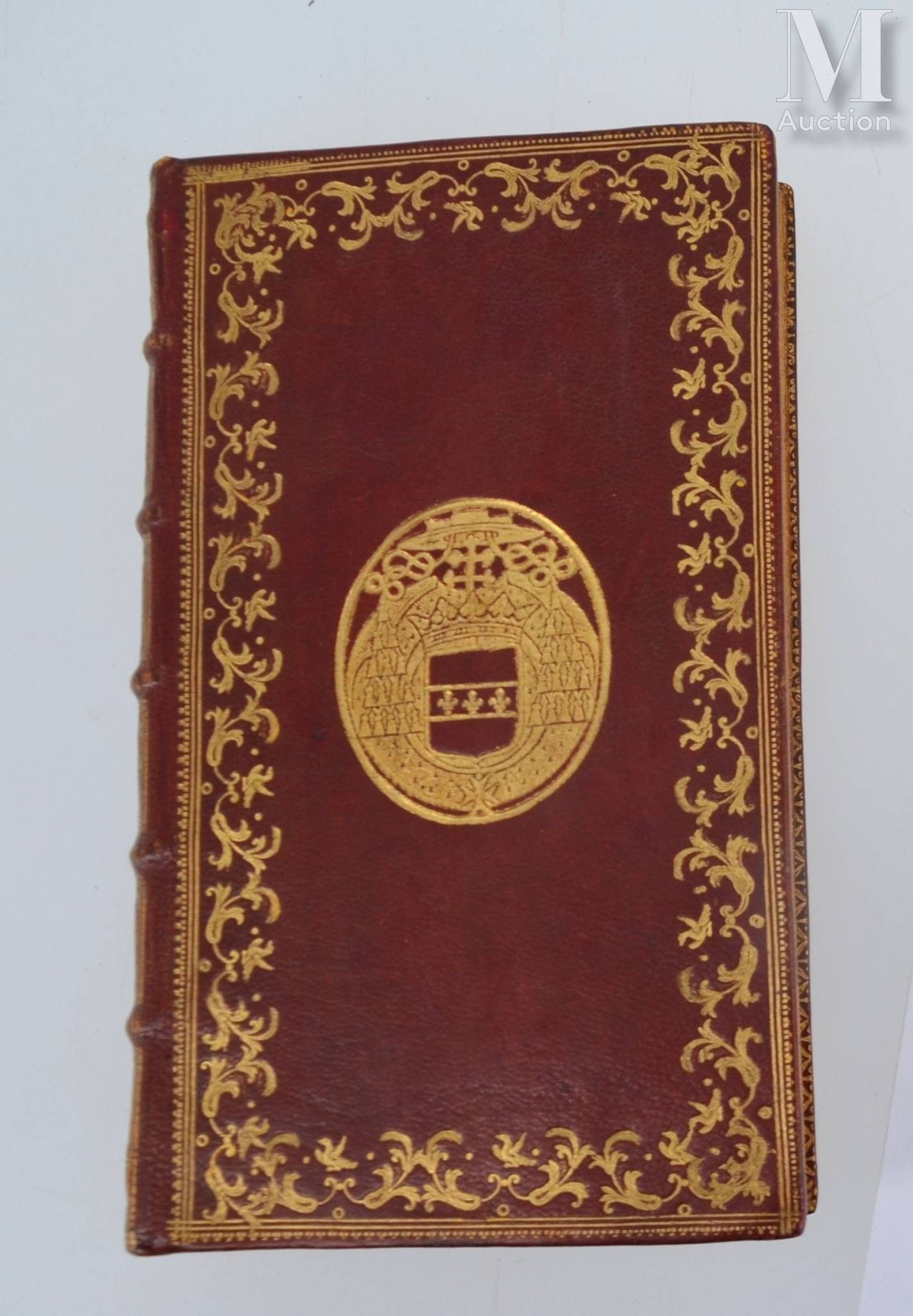 [LEFÈVRE]. Calendrier historique, chronologique et moral de la Très-Sainte et Très-Glorieuse Vierge Marie. Paris, Hérissant, 1749. In-12, red morocco, gilt lace, coat of arms in the centre, spine decorated, lining and endpapers of white paper decorated with a series of gilt stars, edges gilt on marble (Period binding).