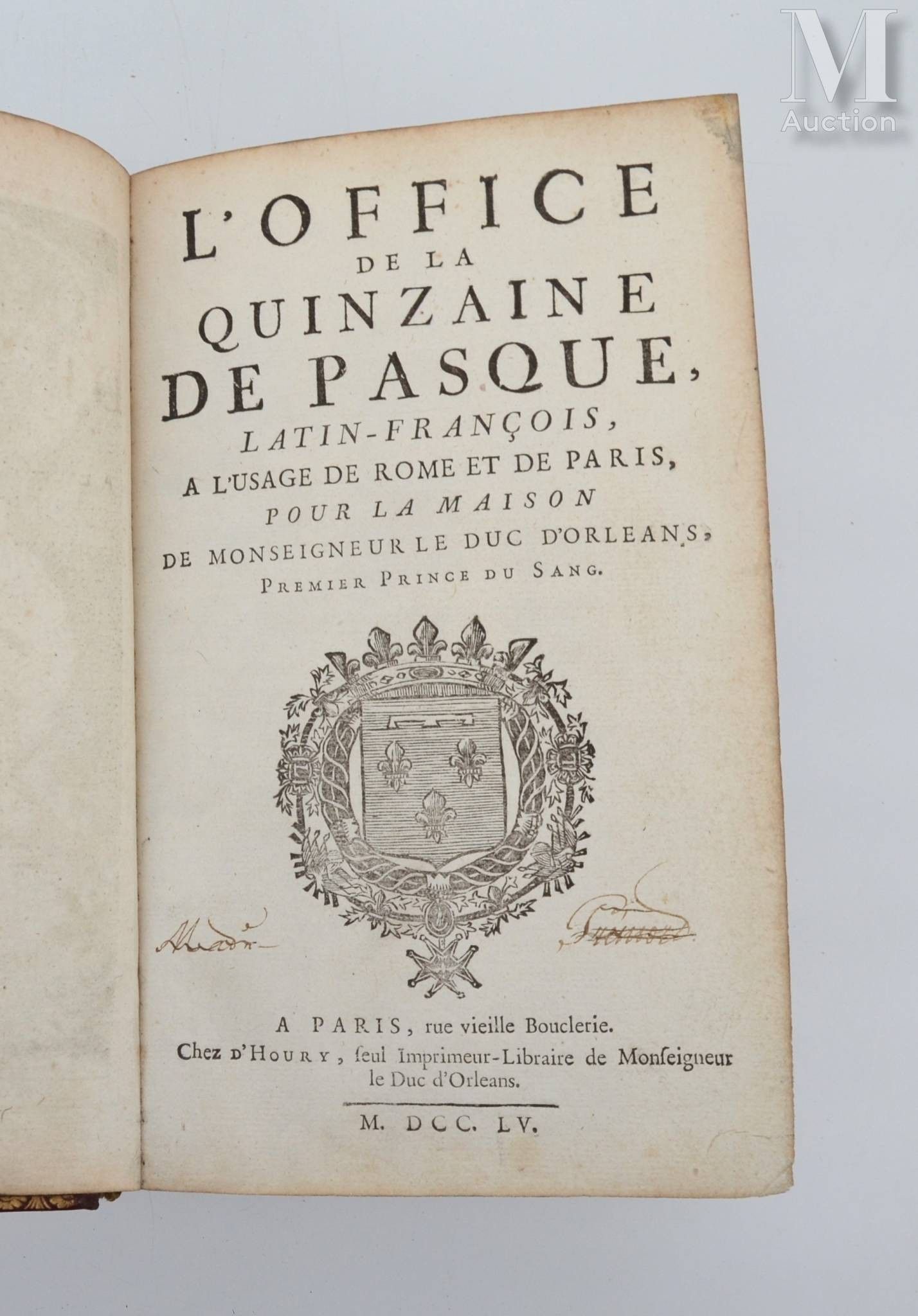 L'Office de la quinzaine de Pasque, latin-françois, à l'usage de Rome et de Paris, pour la Maison de Monseigneur le Duc d'Orléans. Paris, d'Houry, 1755. In-8, red morocco, roulette, coat of arms in the centre (Period binding).