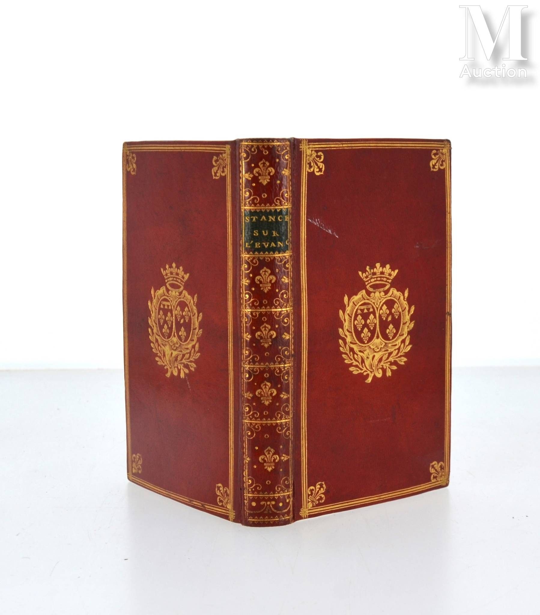 LAPÉROUZE (l'abbé de). Stances sur l'Évangile, divisées en six chants; avec des Cantiques, à l'usage de la Jeunesse Chrétienne. Paris, Charles-Pierre Berton, 1771. In-12, red morocco, triple gilt fillet, fleur-de-lis in the corners, coat-of-arms in the centre, smooth spine decorated, fleur-de-lis repeated, interior roulette, gilt edges (Period binding).