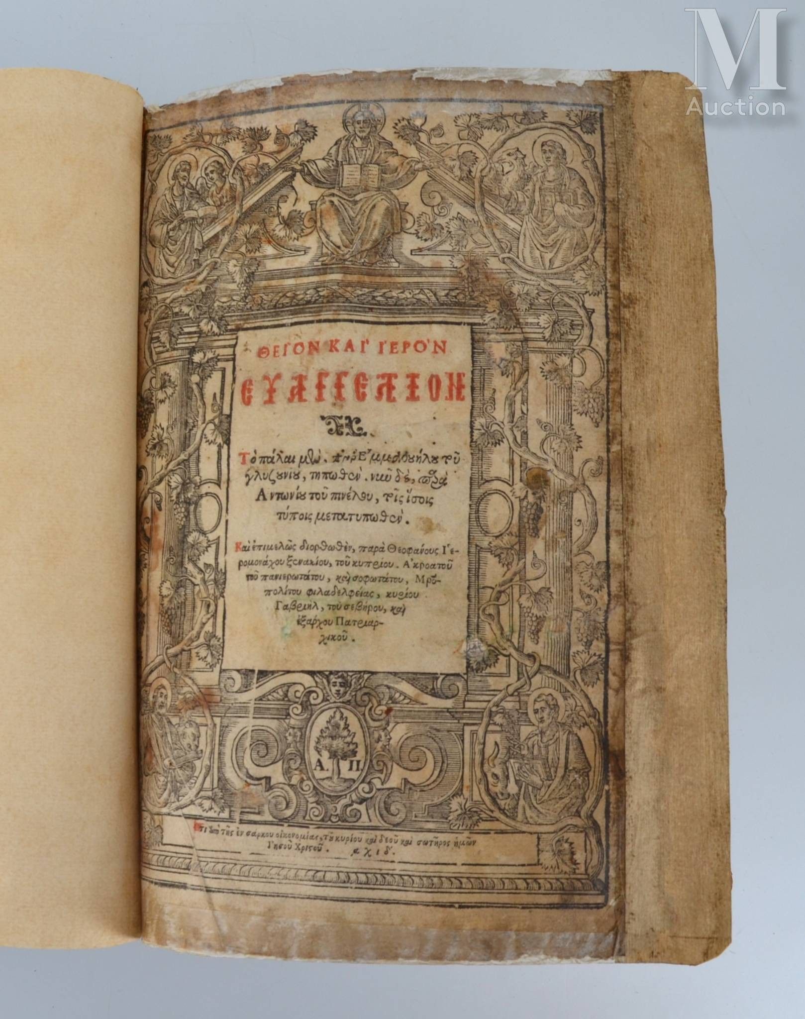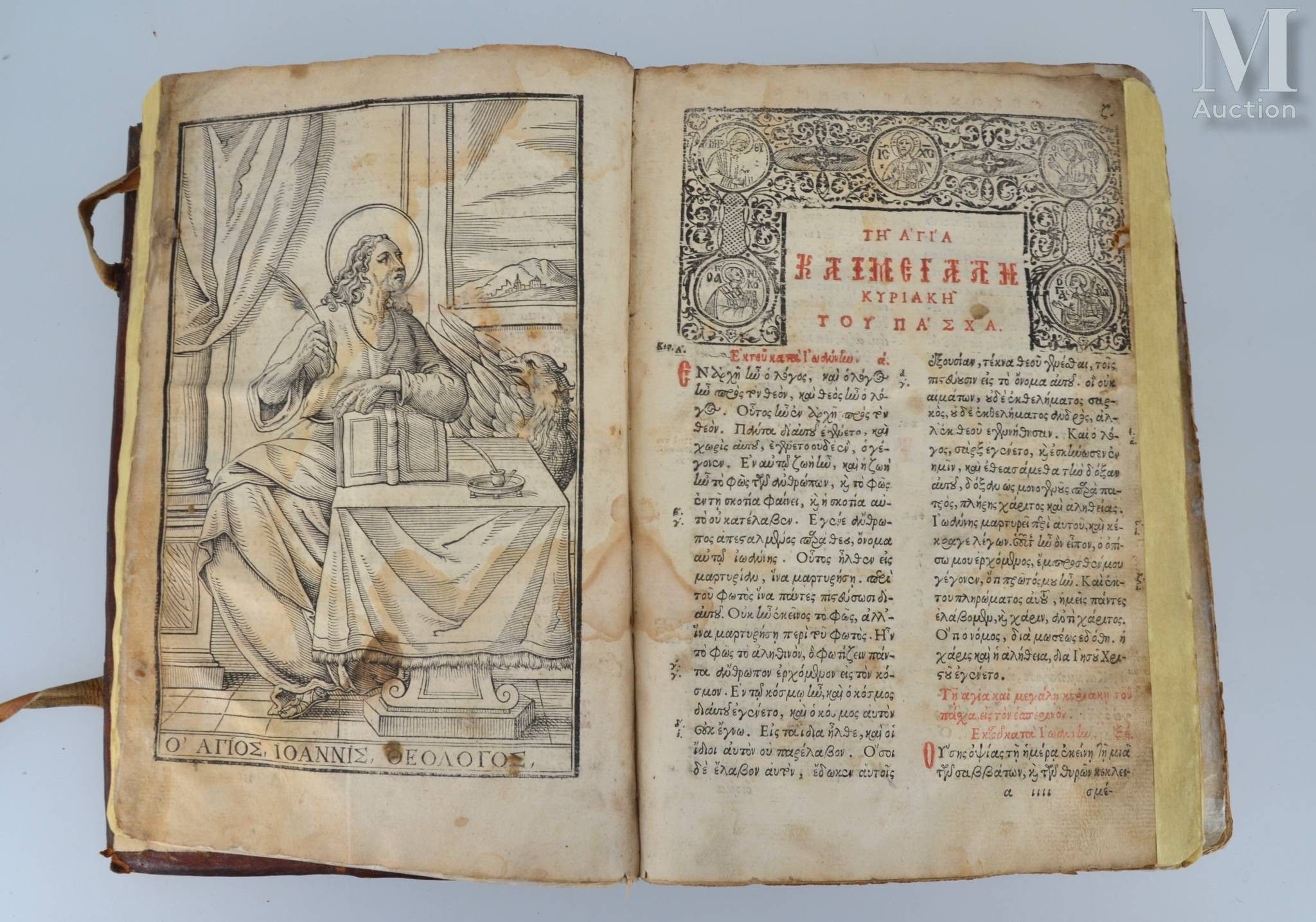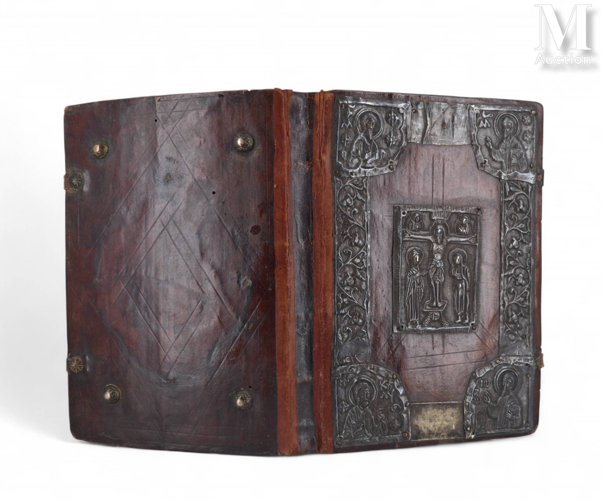 Greek Evangeliary. 1773. Small folio, bound in plum morocco with metal plate in relief, Crucifixion and Resurrection in the centre (Period binding).